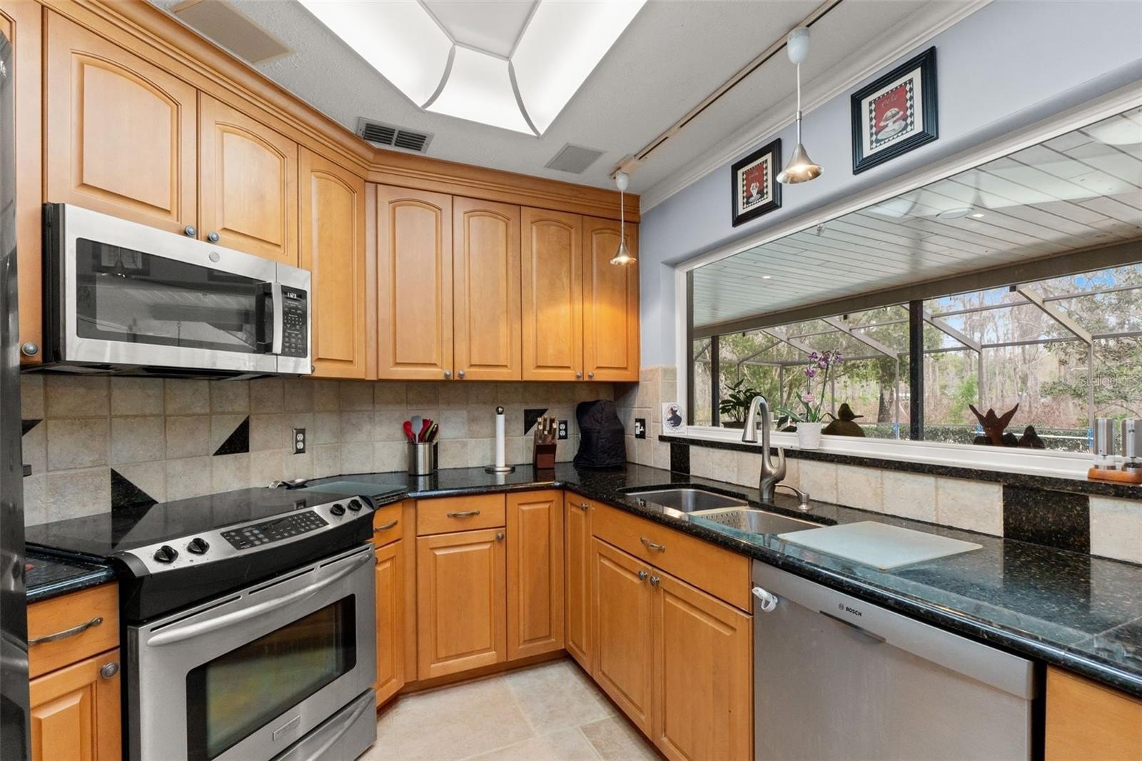space. At the heart of the home is a stunning, remodeled gourmet kitchen featuring granite countertops,