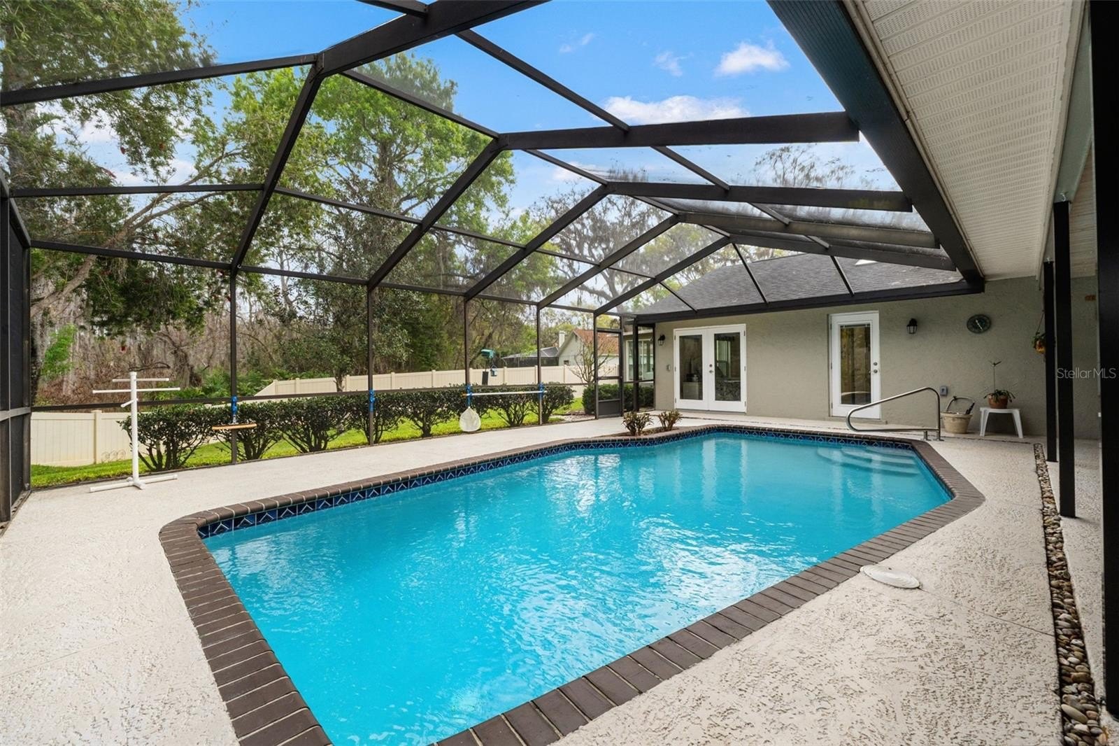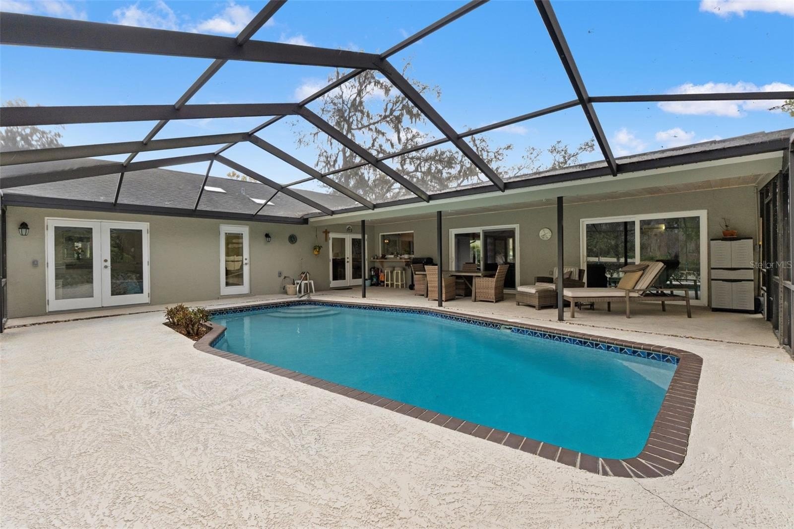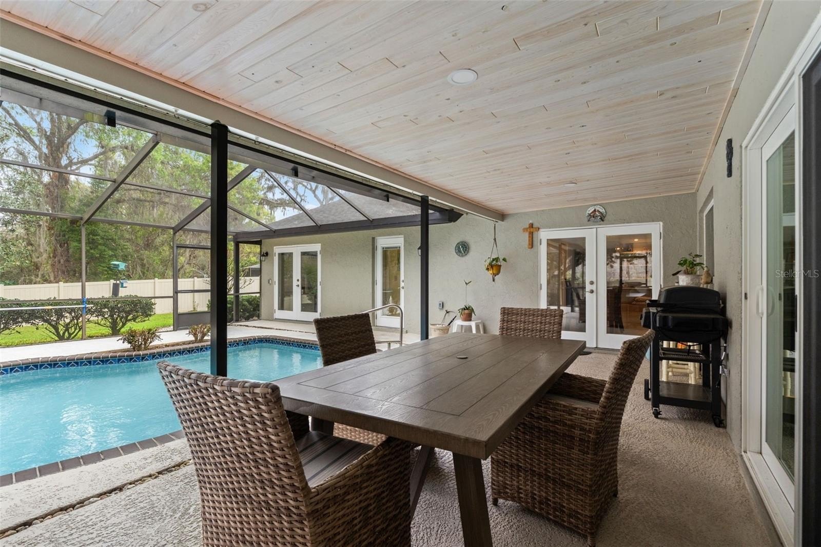 lanai featuring a sparkling saltwater pool and a beautiful Cypress wood ceiling, creating a serene setting