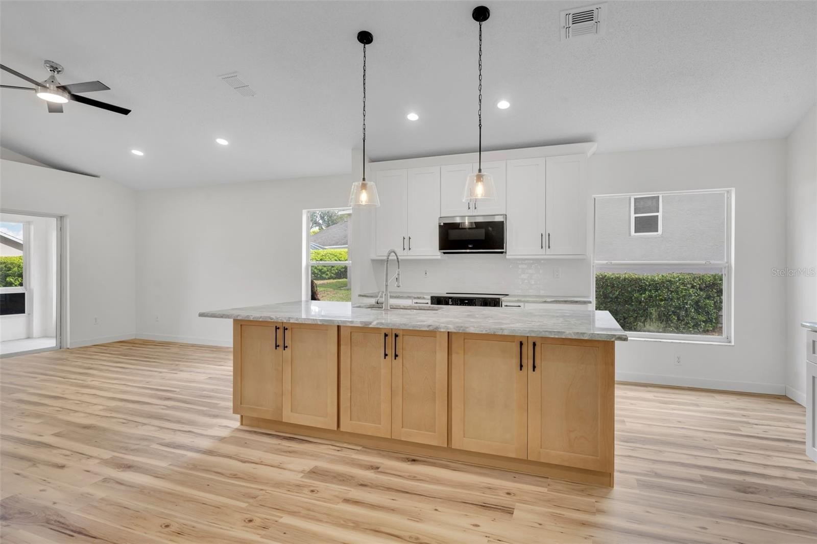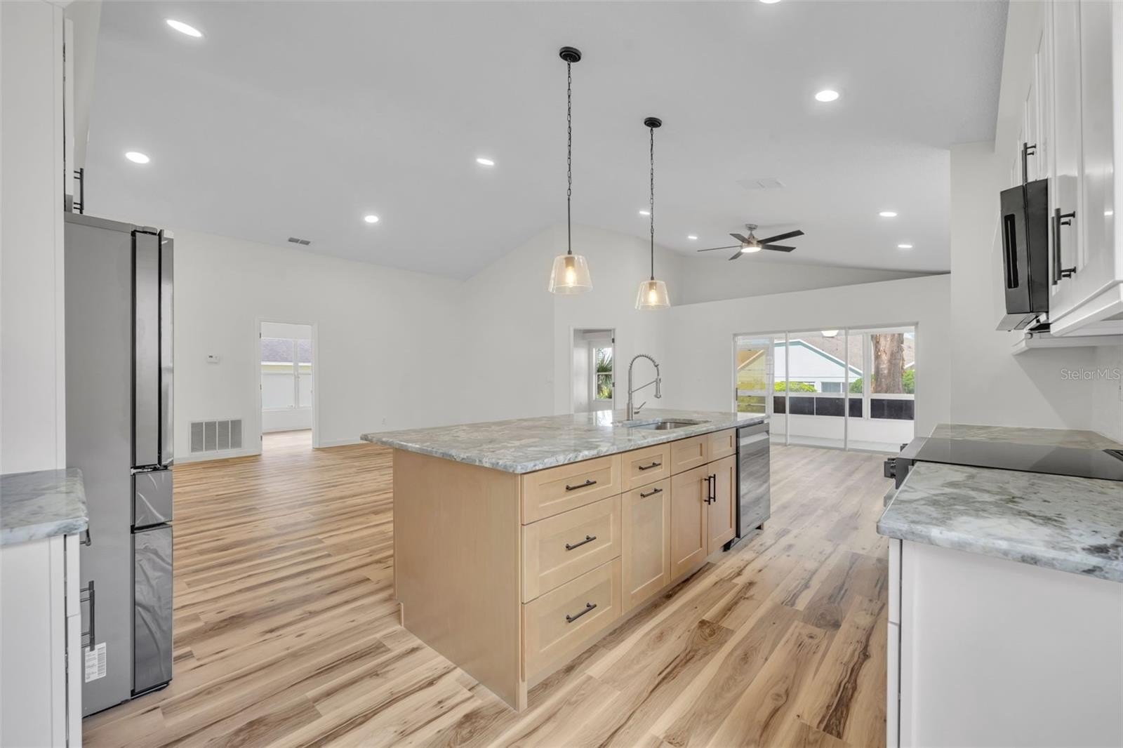 Welcome to this beautifully updated home in the sought-after Kings Ridge golf community, designed for those aged 55+ who appreciate the finer things in life. This stunning residence offers modern upgrades, luxurious finishes, and a layout perfect for both relaxation and entertaining. Step into your dream kitchen, fully equipped with all-new Samsung smart appliances, including the sleek Bespoke model. The kitchen has been meticulously redesigned with gorgeous granite countertops, a stylish backsplash, and spice pull-out cabinets conveniently located on both sides of the stove. With drawers for pots and pans, a built-in pantry, and an XL garbage disposal, every detail has been thoughtfully considered. The large island, complete with ample storage, is perfect for casual dining, meal prep, or hosting gatherings with friends. Throughout the home, you’ll find new luxury vinyl plank flooring that adds a touch of elegance to every room. The master bathroom is a spa-like retreat, featuring a double vanity, a walk-in shower with Italian porcelain tiles, and a Kohler toilet. The spacious walk-in closet in the master bedroom provides plenty of storage, making it easy to stay organized. Guests will feel right at home in the updated guest bathroom and bedroom. The entire house has been freshly painted inside and outside creating a clean, modern aesthetic that’s move-in ready. For added convenience, the home is equipped with large, remote-operated ceiling fans, energy-efficient LED bulbs, and high hats throughout. The laundry room, complete with new Samsung smart washer and Dryer and Italian Porcelain tile. Security and ease of access are top priorities with a new front door lock, key, and handles. The home also features all-new hinges and handles on interior doors, a new A.O.Smith signature top of the line smart 50-gallon water heater, and a roof replaced in 2018, and HVAC 2021 ensuring you can move in with peace of mind. Living in Kings Ridge means enjoying a vibrant community with access to golf, social events, and more. Whether you’re enjoying a quiet evening in your beautifully updated home or participating in community activities, this property offers the perfect blend of luxury and leisure. Don’t miss your chance to make this stunning home your own—schedule a showing today!