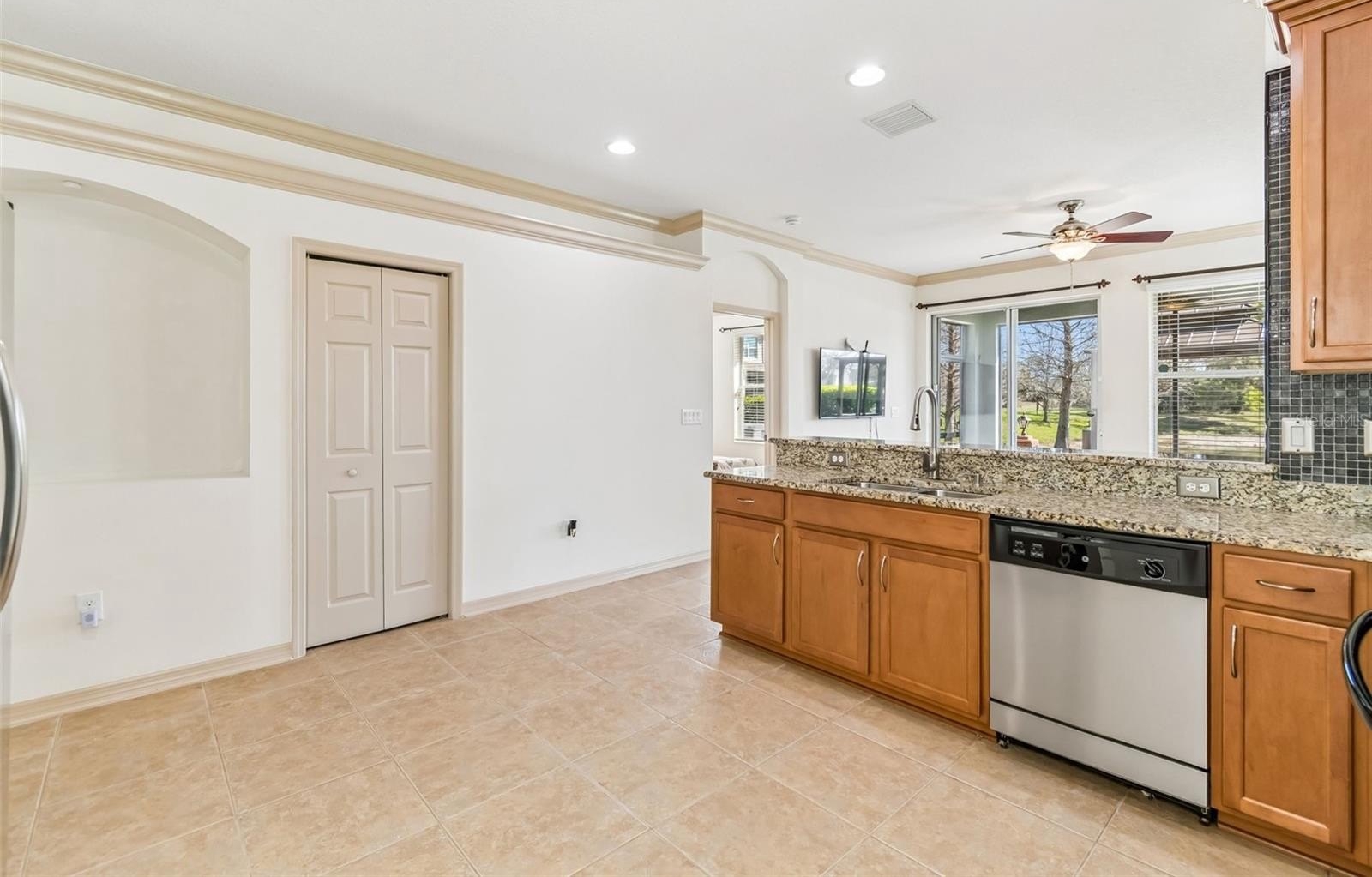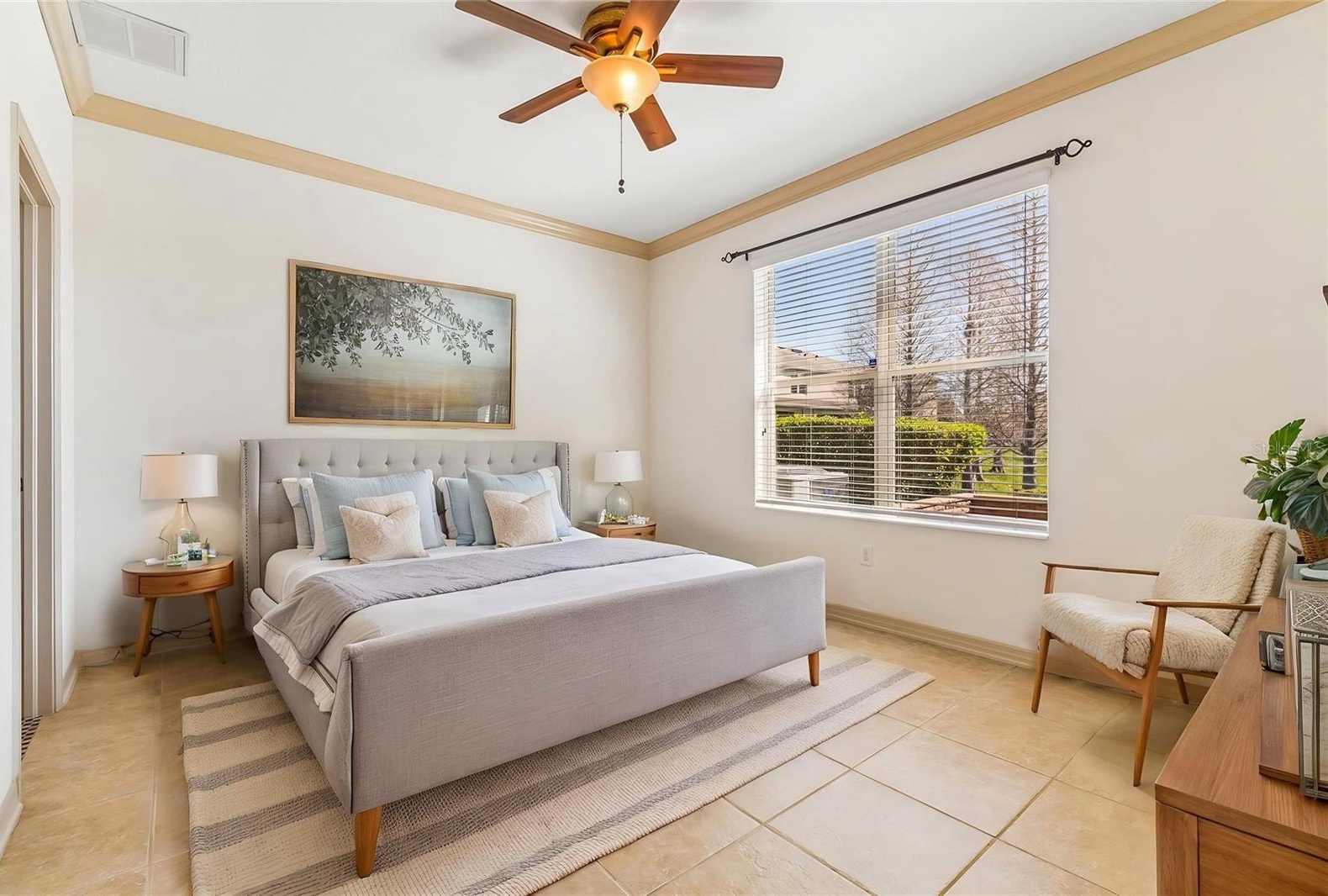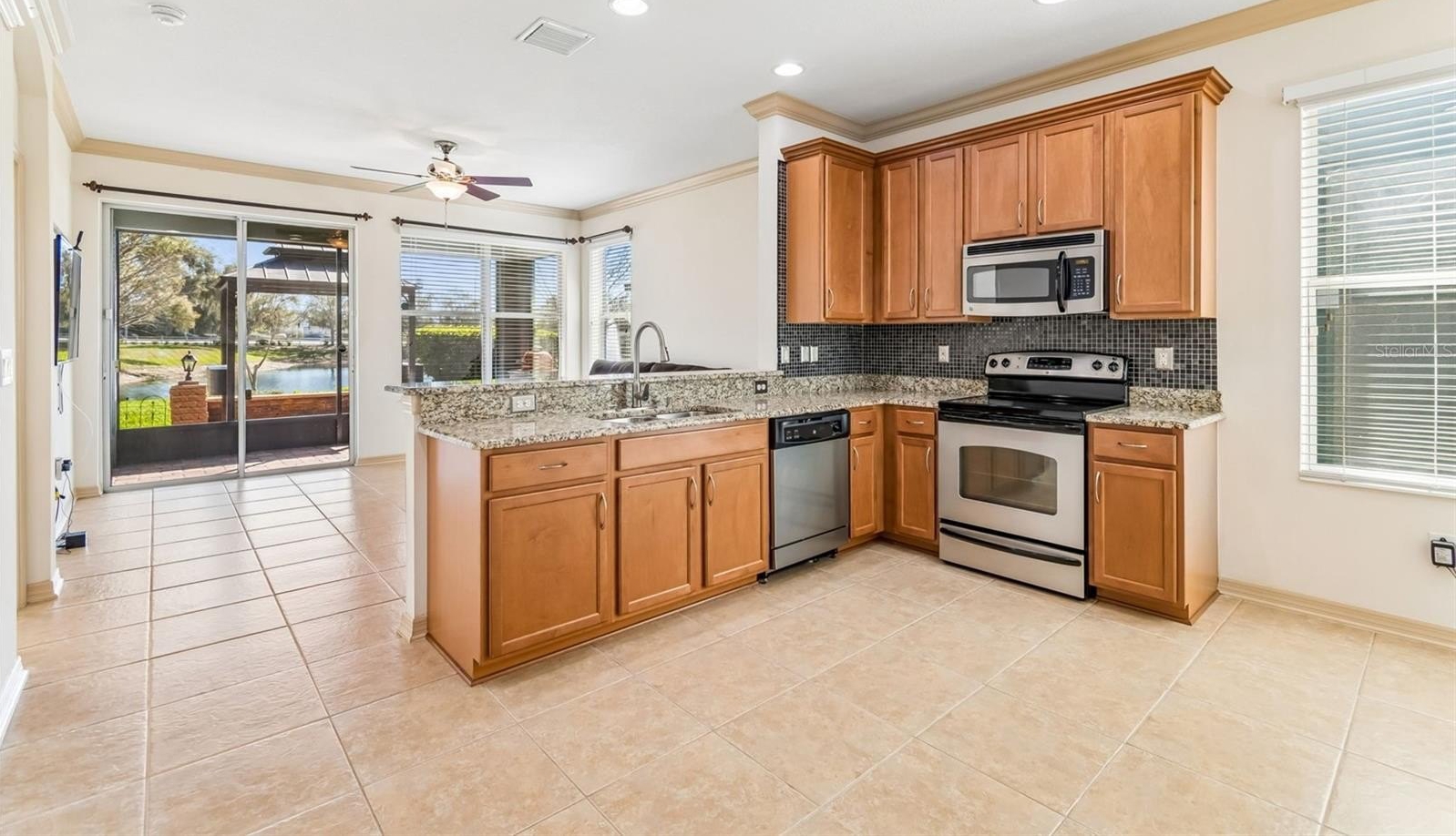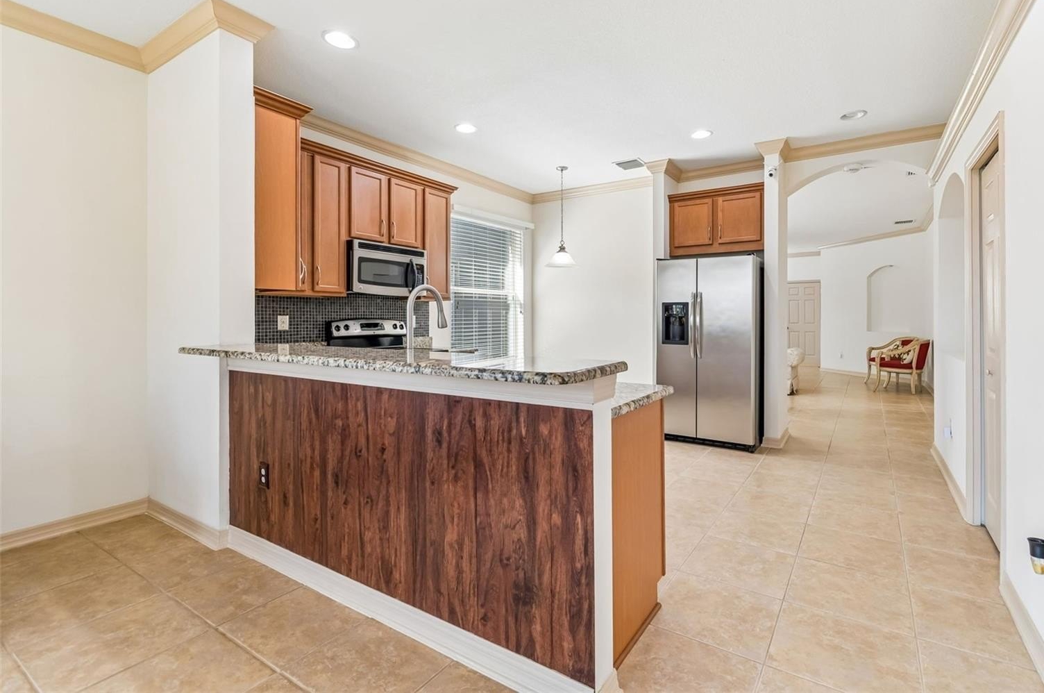 One or more photo(s) has been virtually staged. Welcome to this very well kept three bedrooms, two bath home. Tastefully decorated with pavers, the entry welcomes you to the larger than normal formal rooms. You will fall in love with this formal living, dining room combination before entering the kitchen and family room combo. With plenty of space for a dining table in the kitchen and several stools on the kitchen island. Directly from the formal dining, you will find the hallway for the two bedrooms and a bath. The entire house has crown molding and tile flooring. A wonderful addition is the courtyard in the back with a small gazebo overlooking the pond a great place for the morning coffee or the early afternoon enjoyment with friends and family. Not to forget the screen back porch. Great home, great location, come see fall in love with this well kept. One more surprise will have a brand new roof in a couple of weeks for a worry free home ownership.