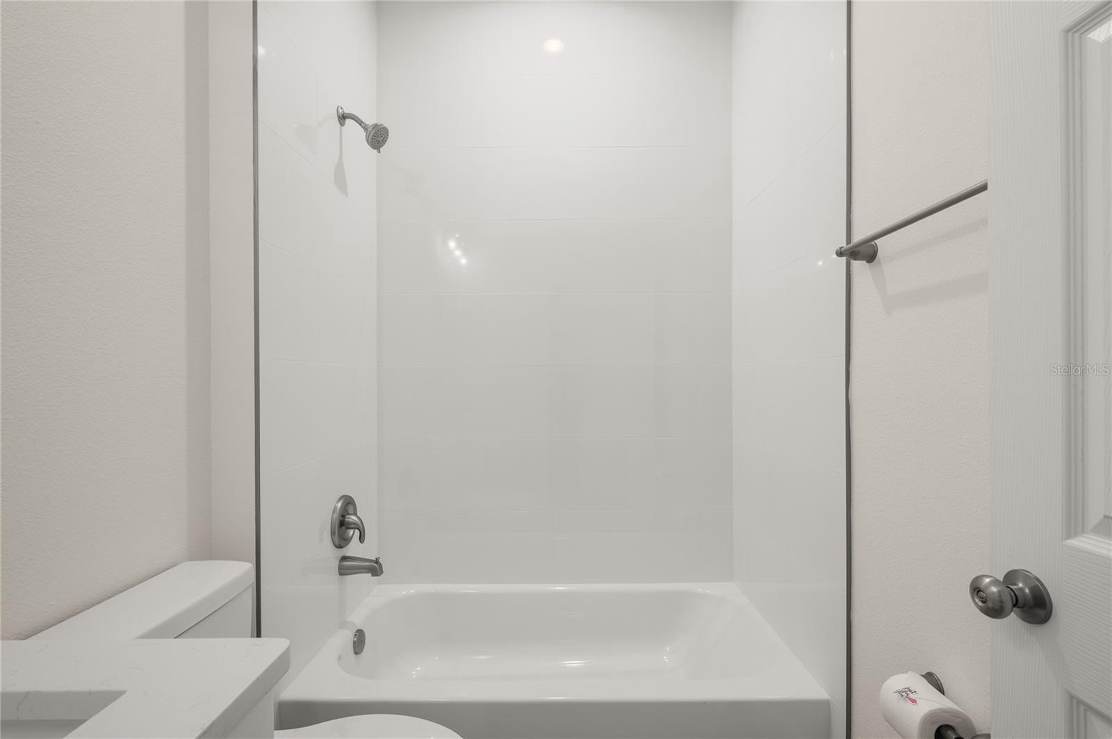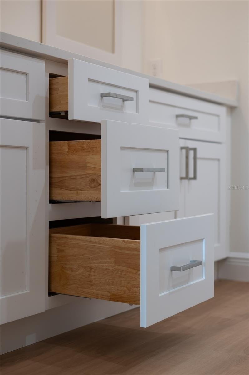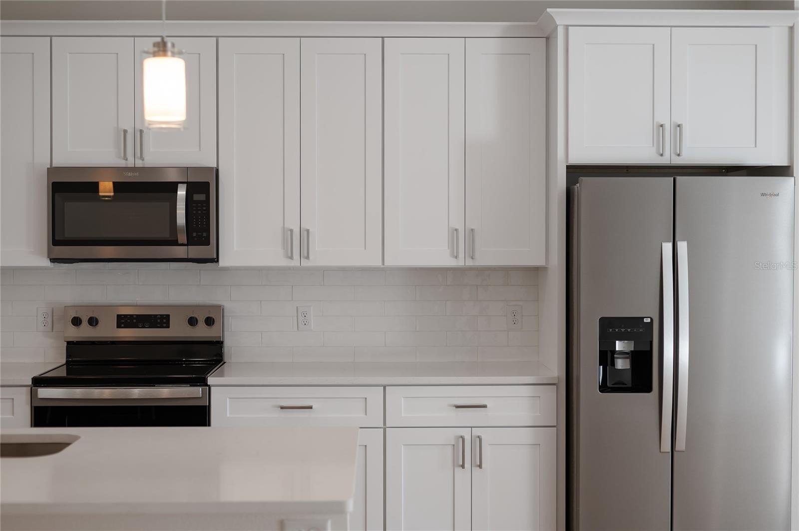 The modern kitchen is designed to impress with quartz countertops, a spacious island, soft-close cabinets, Stainless Steel Whirlpool appliance package, and Kraus kitchen fixtures. A walk-in pantry and oversized laundry room provide excellent storage.