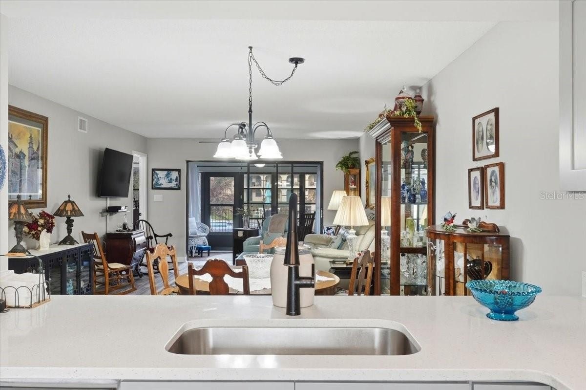 The updated kitchen features gray shaker-style all-wood cabinets with soft-close doors and drawers, pullouts, quartz countertops, a stainless steel sink and faucet, modern appliances, and a large pantry. The living area includes triple sliding glass doors that open to a bright Florida room with built-in cabinets for additional storage and relaxing pool views.