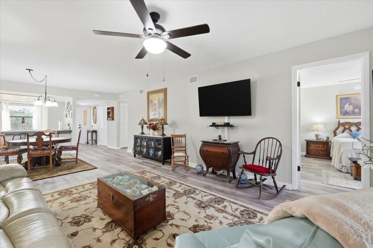 Upgrades include luxury vinyl plank flooring throughout, fresh interior paint, new lighting, and window treatments. Both bathrooms have been fully remodeled with high-quality cabinetry, updated sinks, and modern shower doors. An indoor utility room provides added convenience with a hot water heater and newer washer and dryer, plus the home also features a newer AC unit.