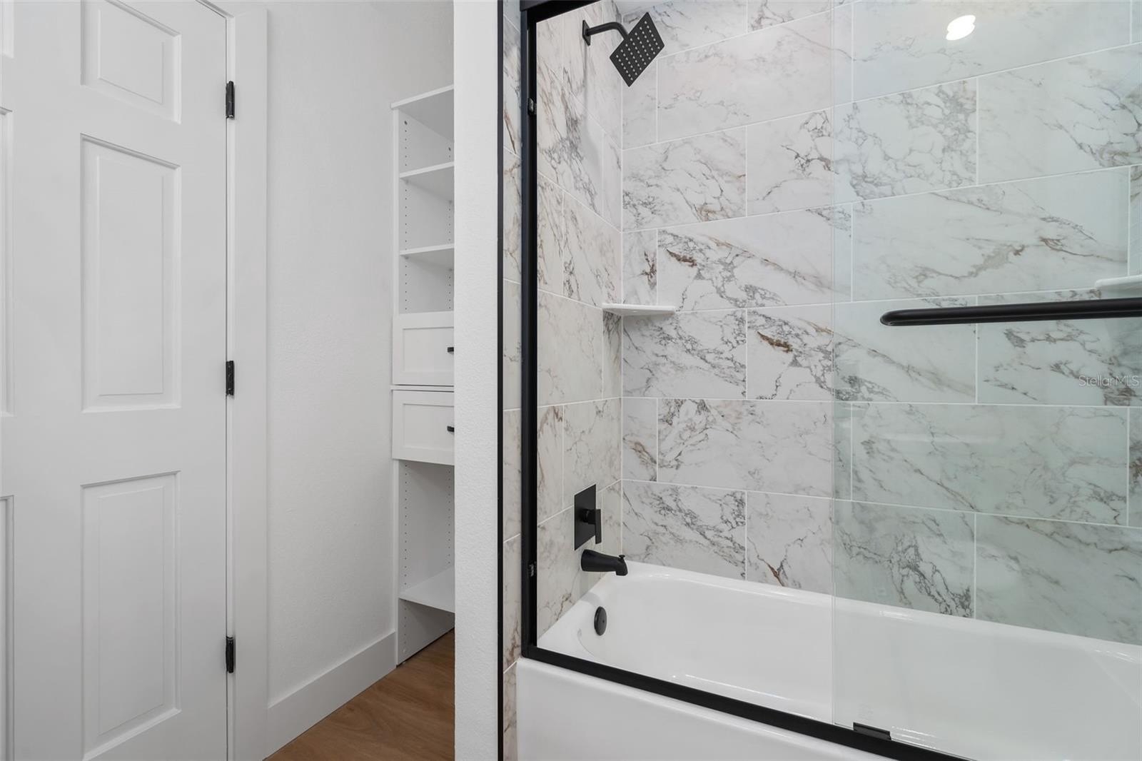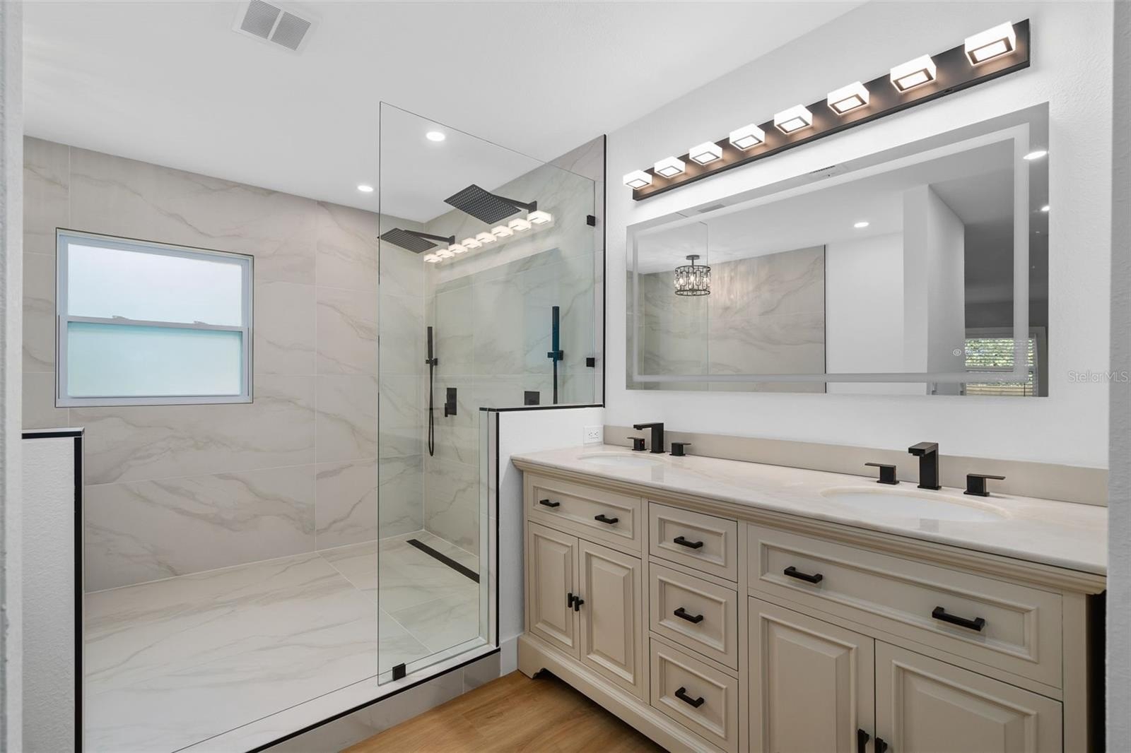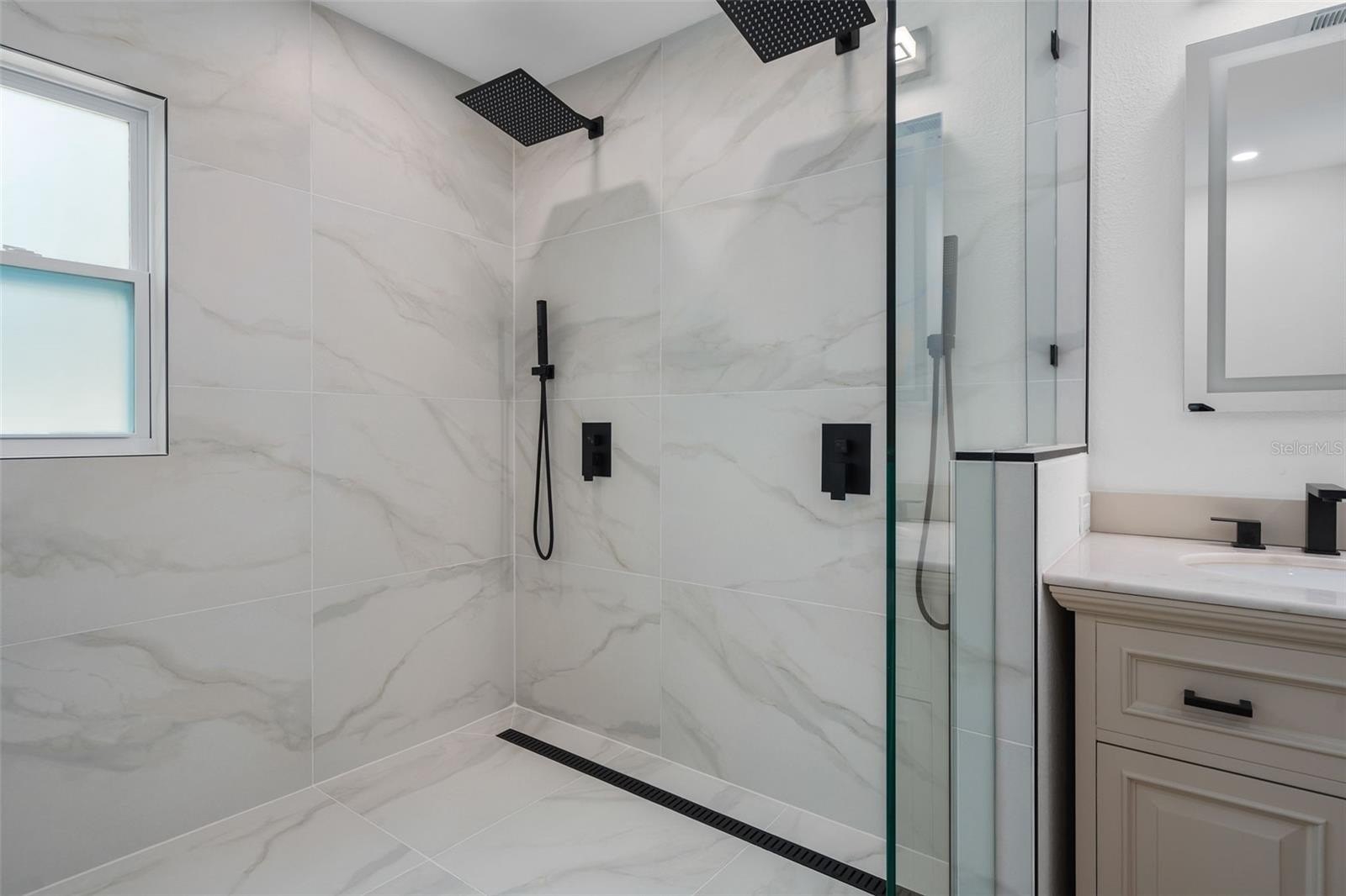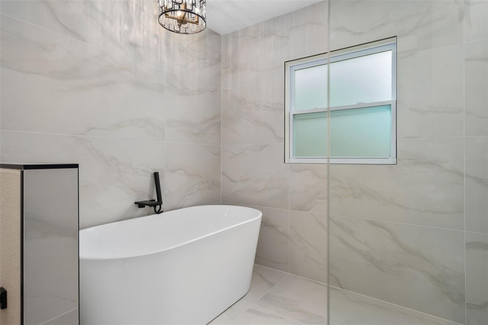 The spacious primary suite serves as a private sanctuary, highlighted by an incredible spa-inspired bathroom featuring a walk-in shower with a soaking tub inside, creating a unique and luxurious experience.