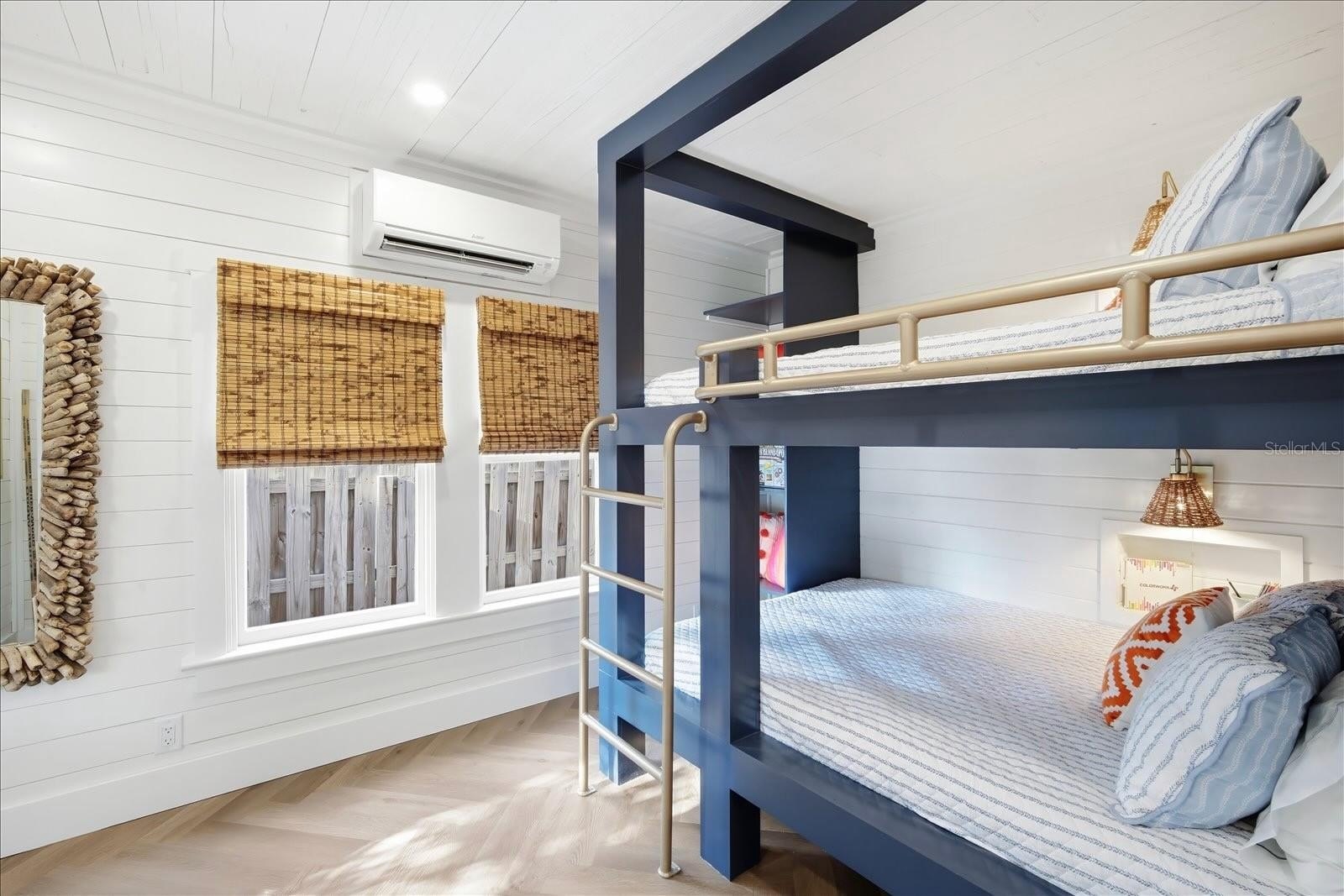 The home features a well-designed split floor plan, offering privacy and comfort for residents and guests alike. The primary bedroom suite includes a private ensuite bath, creating a peaceful retreat at the end of the day. On the opposite side of the home, the second bedroom features charming built-in bunks, perfect for family or visiting guests, with easy access to the second full bath.