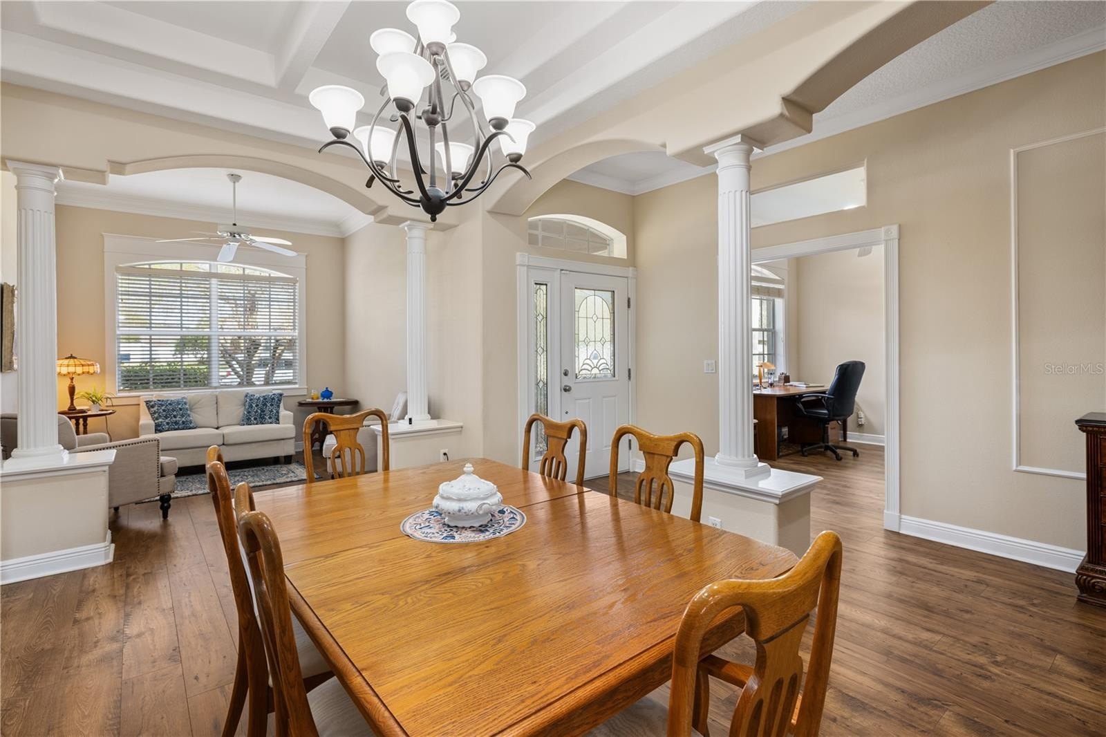 Welcome to this beautifully upgraded custom residence located on a quiet cul-de-sac in the highly desirable Cross Creek community of DeLand, offering an exceptional blend of architectural detail, comfort, and location. From the moment you enter, you’ll notice tray ceilings, crown molding, engineered hardwood flooring, and an open layout filled with natural light. The true focal point of the home is the stunning chef’s kitchen, featuring quartz countertops, 42-inch cabinetry, stainless steel appliances, a custom range hood, designer backsplash, breakfast nook, and expansive prep space, all designed to anchor the home and flow seamlessly into the main living and entertaining areas. The adjacent family room showcases elegant tray ceilings and a built-in entertainment unit, creating a perfect gathering space. The spacious owner’s suite serves as a private retreat with refined ceiling detail and a luxurious ensuite bath complete with dual granite vanities, a standalone soaking tub, glass-enclosed walk-in shower, and walk-in closet. Additional highlights include French doors, a spacious interior laundry room with utility sink, and refined finishes throughout. Step outside to the covered and screened patio overlooking a large, fully fenced backyard, ideal for relaxing or entertaining. The home also features a large driveway and side-entry garage, enhancing both curb appeal and functionality. Ideally located just minutes from historic downtown DeLand’s vibrant shops, dining, and cultural attractions, and within convenient driving distance to Daytona Beach, New Smyrna Beach, major highways, hospitals, and Orlando area amenities, this home offers the perfect balance of privacy, luxury, and accessibility.
