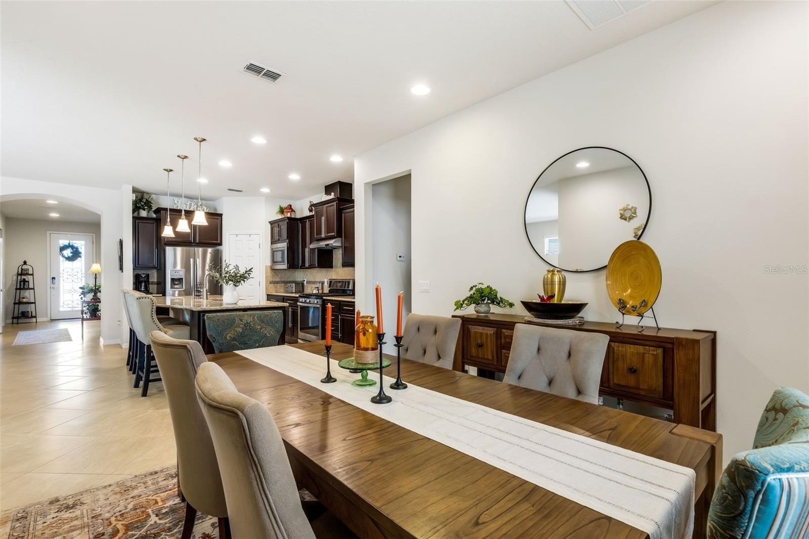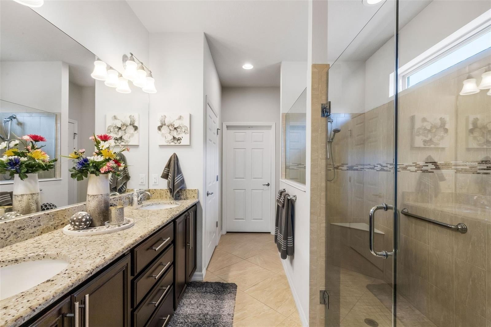 Located in the desired 55+ RESORT-STYLE community of Del Webb Orlando, this Summerwood floor plan that is conveniently located within walking distance to the Clubhouse has 3 bedrooms, 2 bathrooms, plus a den. The front entryway features an 8' decorative glass front door. Located in the front of the home are the two guest bedrooms complete with tile floors and the guest bathroom complete with a tiled shower with glass doors. The den/office is also located in the middle of the home and has glass French doors. The kitchen includes granite countertops, stainless steel appliances, including a NATURAL GAS range, built-in cabinet w/pullouts, backsplash, a large island for all your entertaining needs. The large master retreat is located in the rear of the home for owner privacy and features tile floors and a tray ceiling, a large tiled walk-in shower, double sinks, a linen closet and a large walk-in closet. From the great room you step through large sliding glass doors into a screened-in lanai with a beautiful tranquil view with no rear neighbors. The large laundry room has cabinets for extra storage and a utility sink. The two car garage is outfitted with epoxy floors and pull-down stairs to over-garage attic space. Located near the resident-only secondary gate, this home also features easy access to the community. The $425 semi-annual HOA fee provides 24x7 staffed security gate and master association-owned private road maintenance. Adjacent to recently renovated 18-hole White Heron Golf Club. The $282 monthly Del Webb HOA fee includes exclusive access to resident-owned 30,000+ SF Montecito clubhouse and amenities. DEL WEBB ORLANDO is a 55+ community with a tavern, indoor walking track, fitness center, indoor and outdoor pools and spas with locker rooms and showers, billiards, ping pong, craft room, and a ballroom for special events. Outdoor activities include pickleball, tennis, bocce, basketball, shuffleboard, community gardening center, an outdoor amphitheater, large brick fire pit and large screened-in gazebo over the water. Miles of biking and walking trails within Ridgewood Lakes gated community. Located conveniently to shopping at Posner Park (4 miles), Disney World, Universal Studios, Orlando & Central FL entertainment nearby. Easy access to I-4, medical facilities, airports & Sunrail Station. Advent Health hospital is 3 miles away