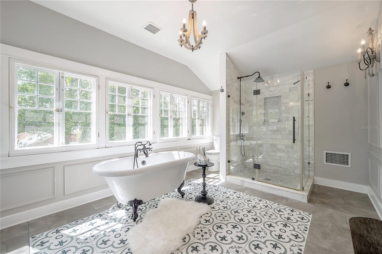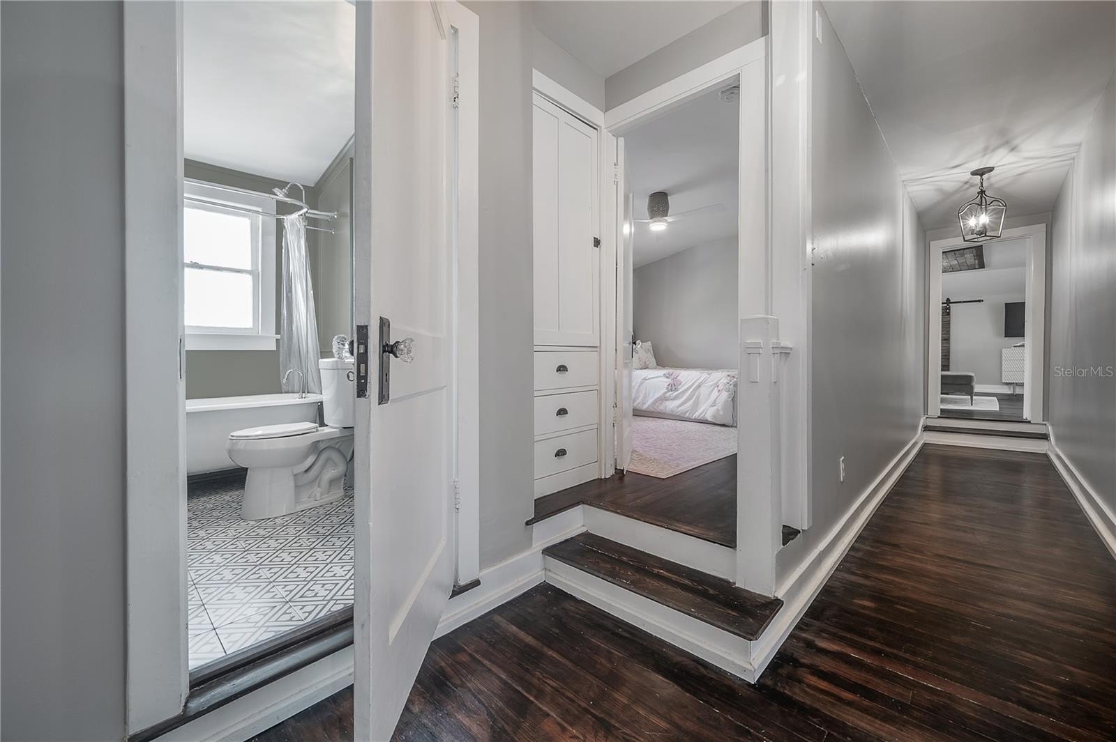 At the heart of the home is an updated chef’s kitchen designed for gatherings, featuring double ovens, a six-burner gas range with pot filler, wine cooler, large pantry, and a statement island—plus a dedicated wine room that’s a rare find in Seminole Heights. The main home offers 5 bedrooms and 4 full bathrooms. The charm continues with three fireplaces—one in the living room, one in the dining room, and one in the primary suite. Bathrooms are beautifully styled with vintage-inspired freestanding tubs and timeless finishes, blending historic charm with modern comfort.