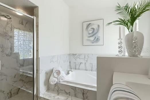 The oversized primary suite serves as a relaxing retreat with abundant natural light and space for a sitting area. The large primary bathroom features dual vanities, a soaking tub, and a separate shower, creating a spa-like atmosphere.