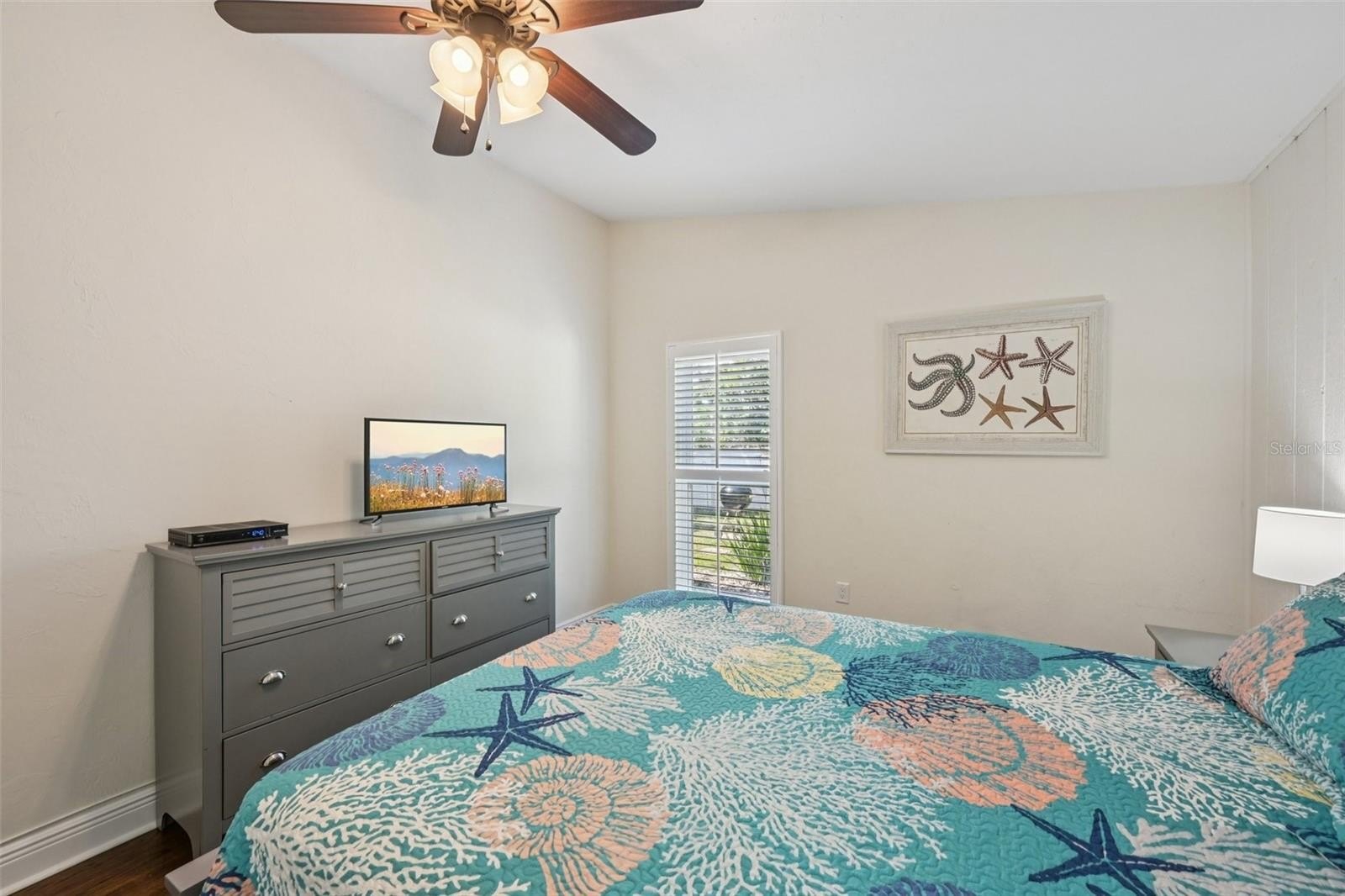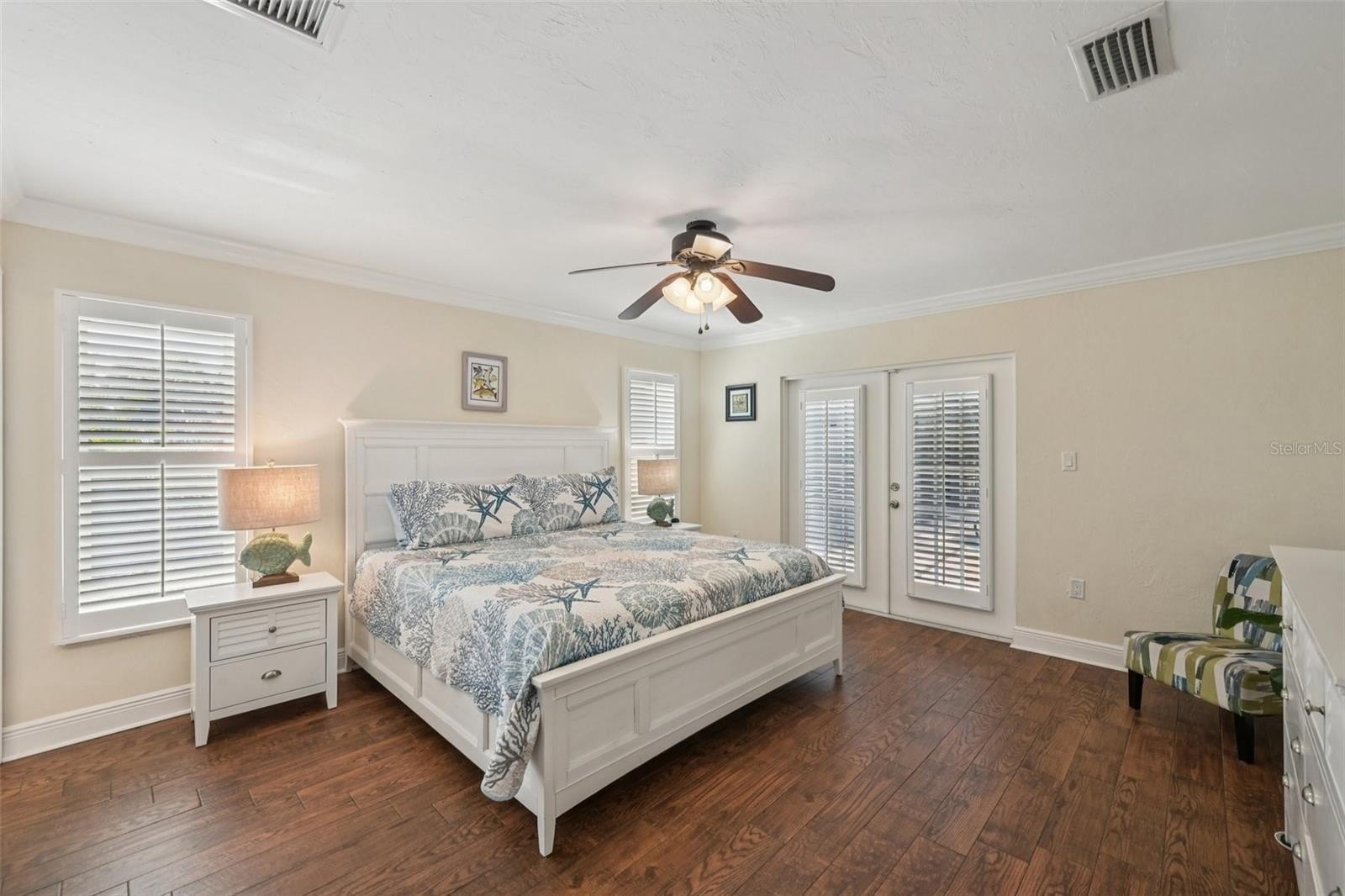 The modern kitchen features granite countertops, ample cabinetry, and generous prep space, flowing seamlessly into the main living and dining areas. Plantation shutters and rich wood flooring add warmth and character throughout, while thoughtful updates give the home a fresh coastal feel.