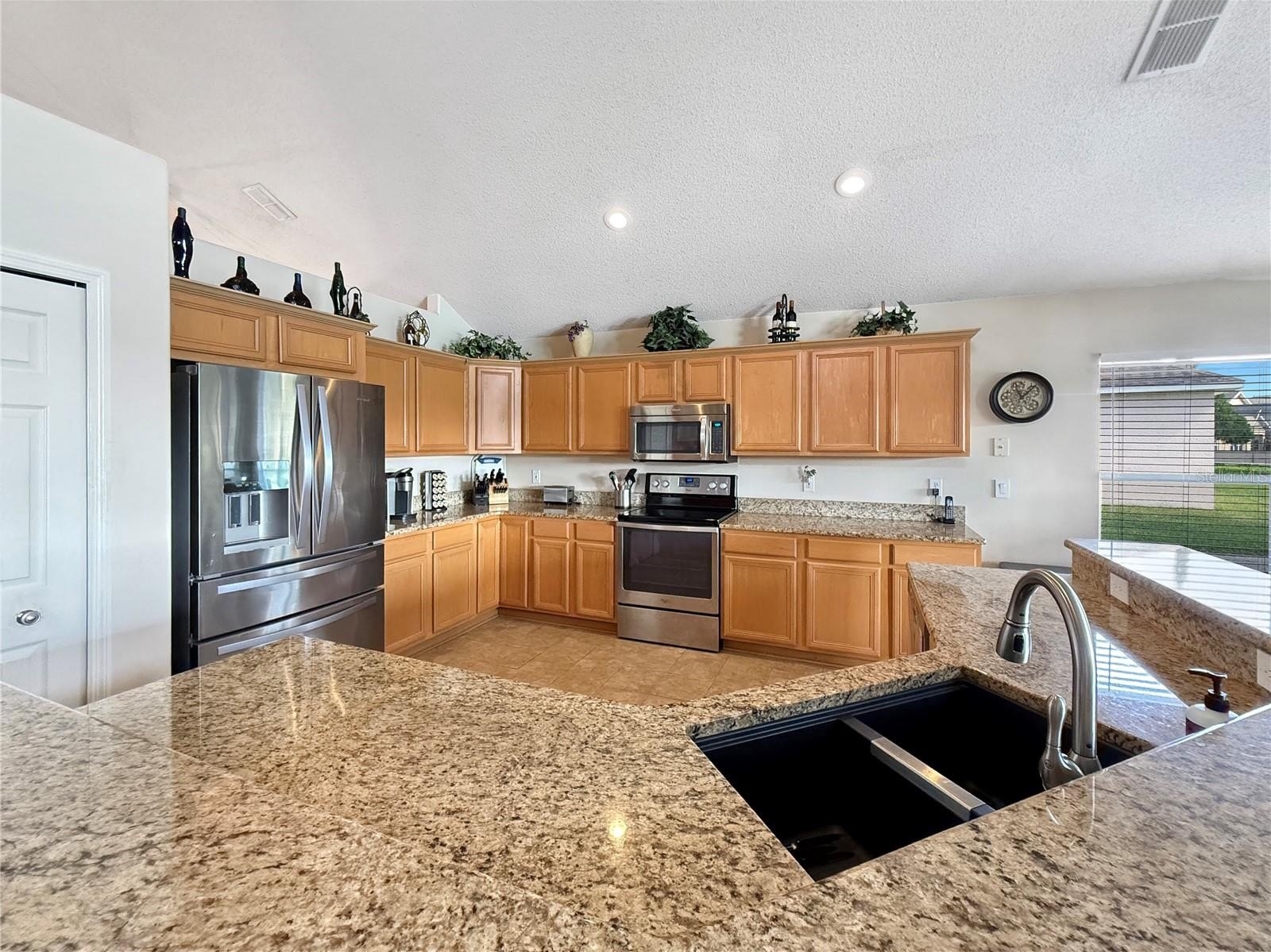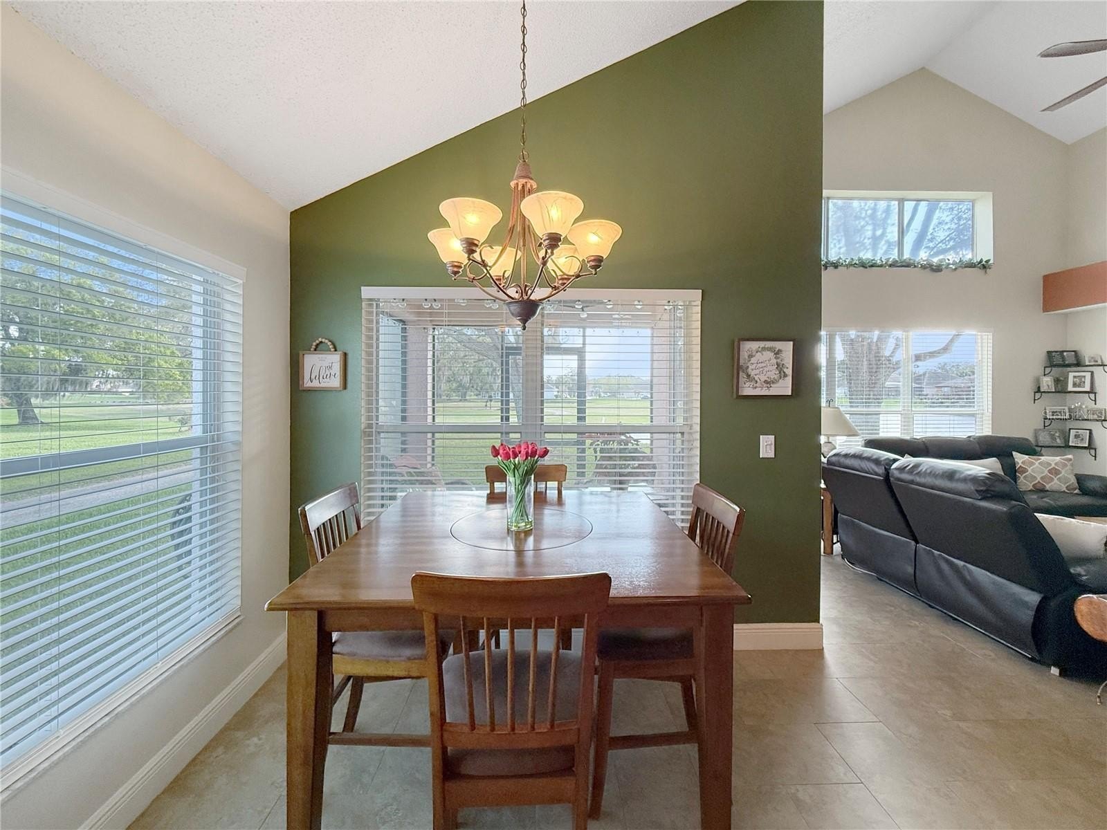 The updated kitchen features granite countertops, stainless appliances, and a spacious island making it the ideal place for casual meals, morning coffee, or catching up at the end of the day. Just beyond the kitchen, the home opens into a warm and welcoming family room where large windows stretch across the back of the home, framing peaceful views of the golf course and sparkling pond beyond. It’s the kind of view that instantly makes you slow down and appreciate the moment.