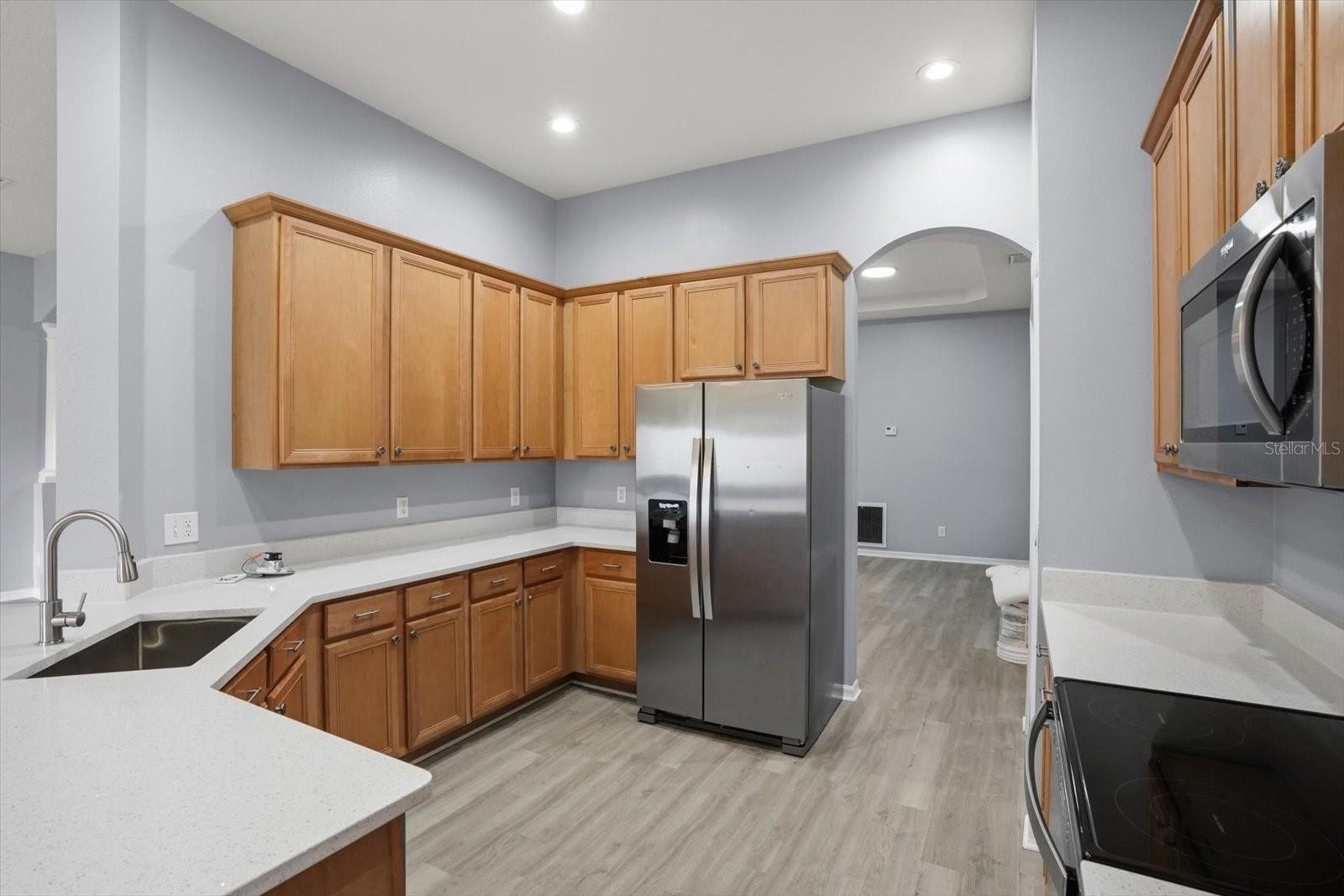 The California-style kitchen showcases quartz countertops, 42-inch cabinets, and new stainless steel appliances, perfect for everyday living and entertaining. The primary suite offers two walk-in closets and a spacious ensuite bath, while the generously sized secondary bedrooms provide comfort and flexibility.
