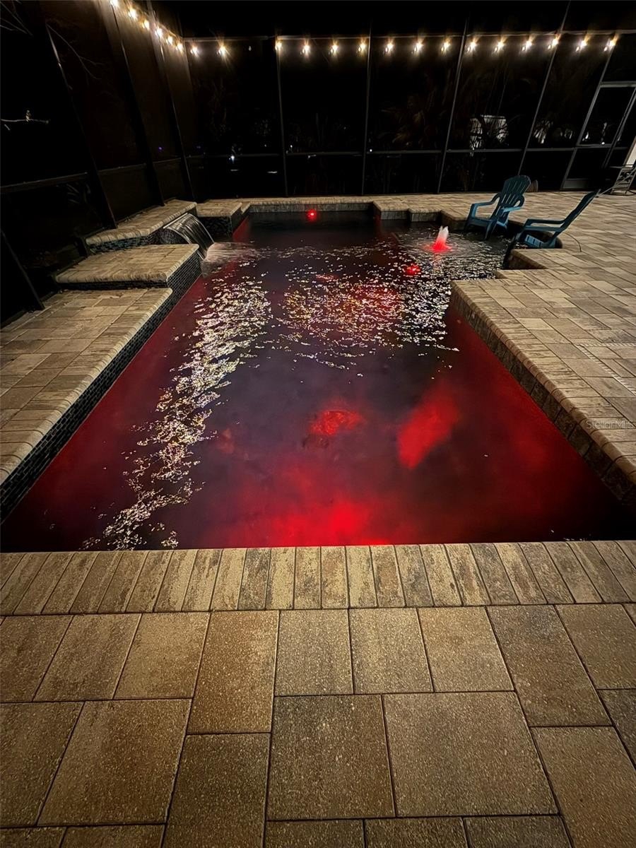 The five sets of sliding glass doors open to a spacious 1000 ft² covered lanai that transitions into a 1500 ft² open area under a screened cage that was re-screened in 2025. This open space is adorned with pavers and features a 30-foot-long pool with end-to-end blue, green, and purple iridescent tiles that shimmer in the water’s reflection. The pool includes an 8 x 8 sun shelf with a lighted bubbler for entertainment and accommodates an umbrella pole, positioned directly across from a bench seat with a waterfall feature from the top tier and three LED underwater changing color lights. Additionally, the pool is equipped with an underground pop-up water-jet self-cleaning system for effortless maintenance. The pool filter is new as of February 2026.