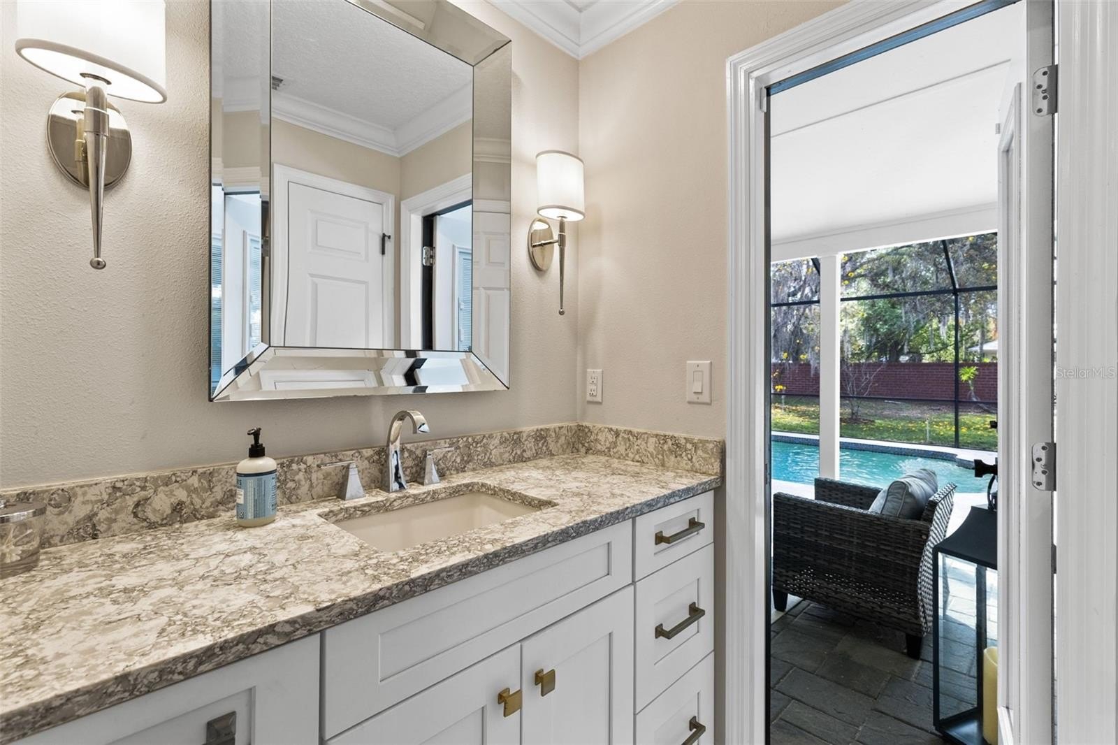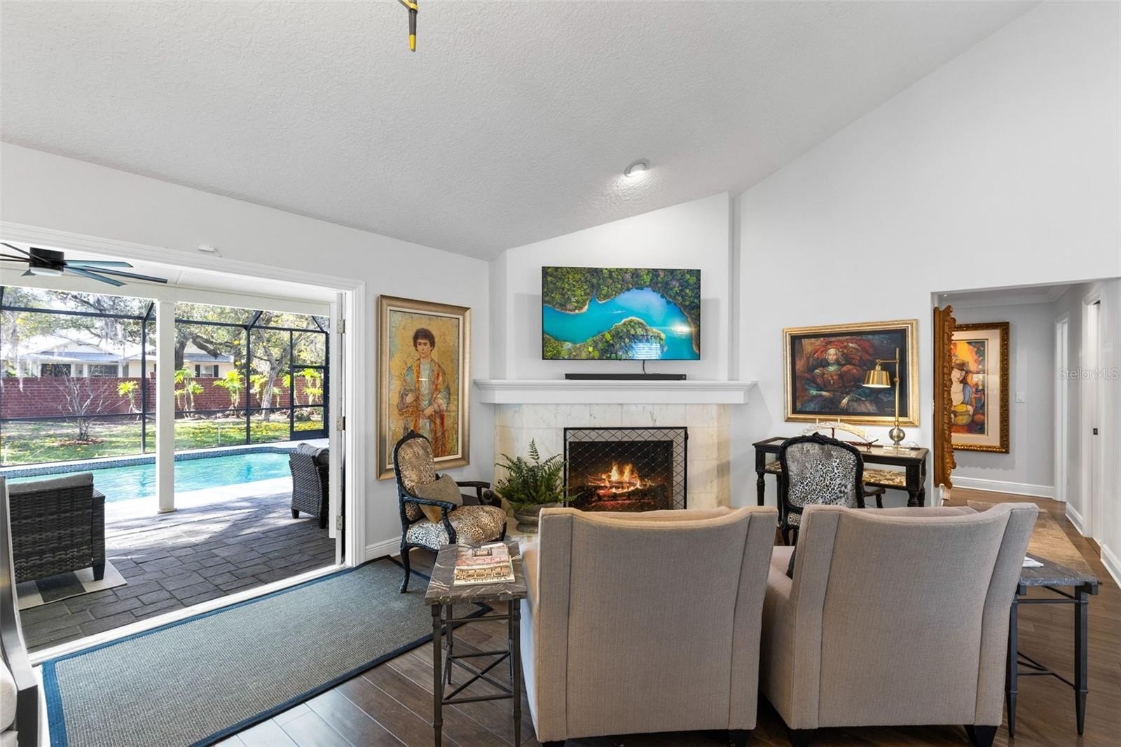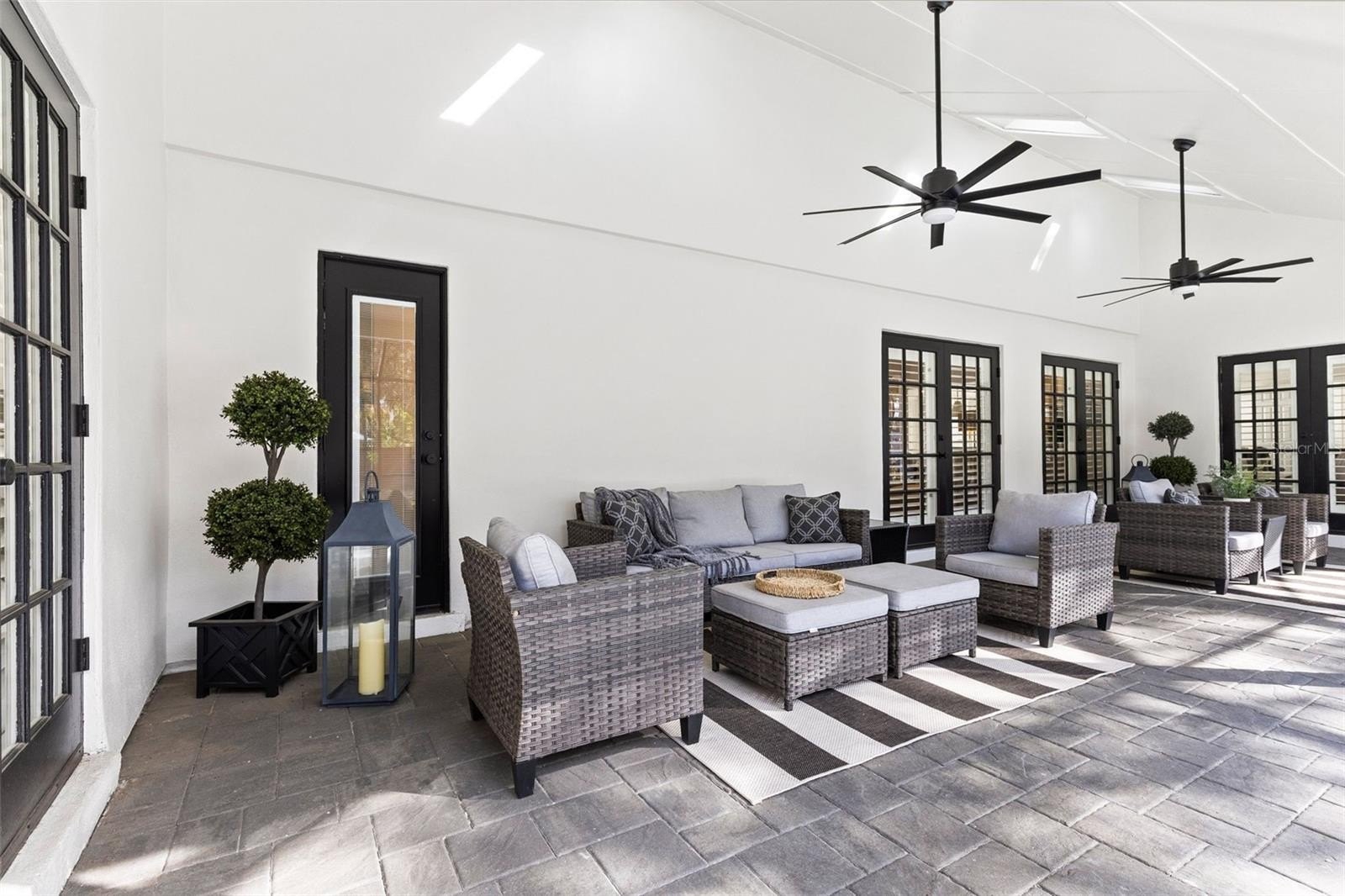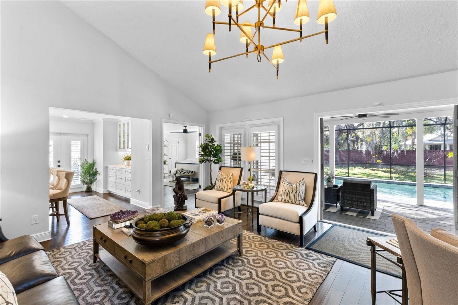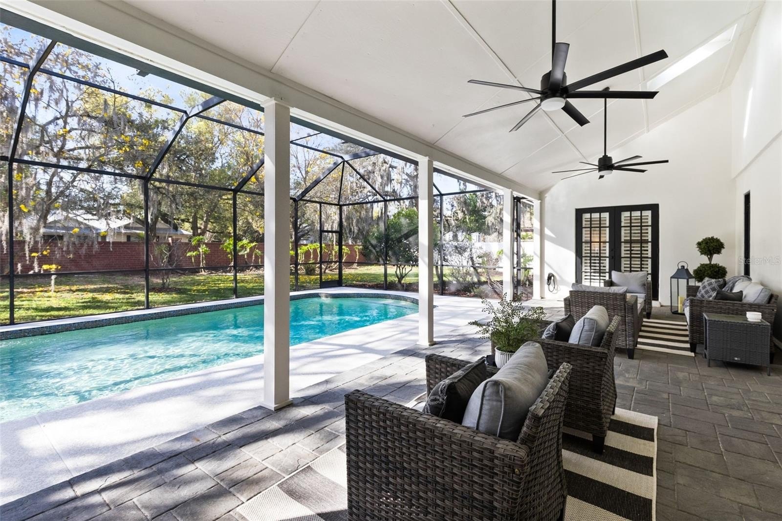 Step outside to a private screened pool and an impressive redesigned porch with pavers, vaulted ceilings, and skylights—perfect for relaxing or hosting guests. The home also includes a convenient half bath, two additional bedrooms with walk-in closets, a second bathroom that serves as a pool bath with a shower and linen closet, and a third bedroom with French doors leading directly to the pool area.