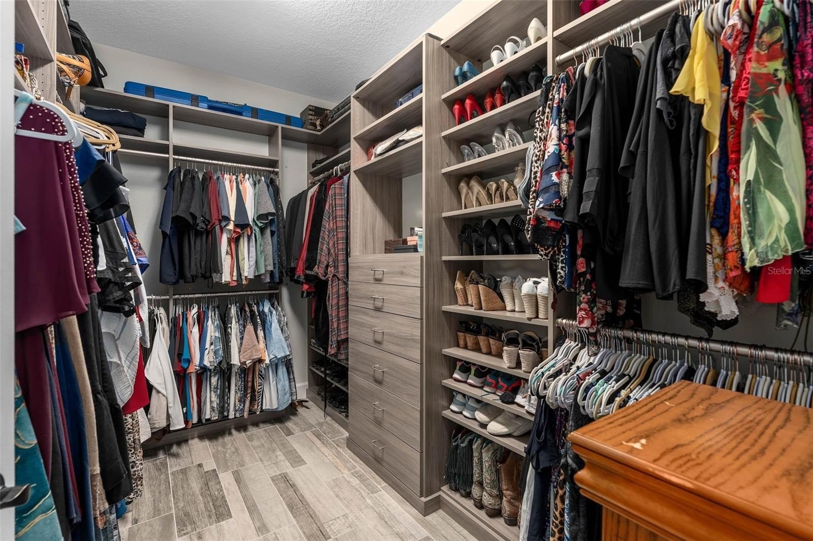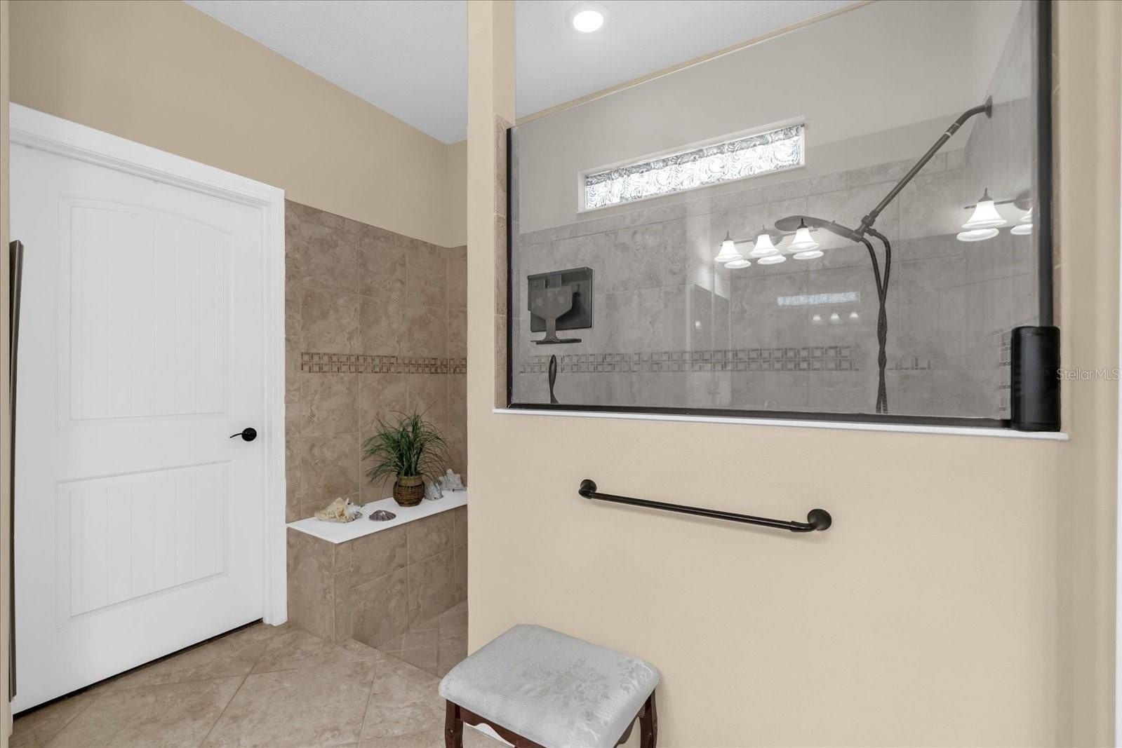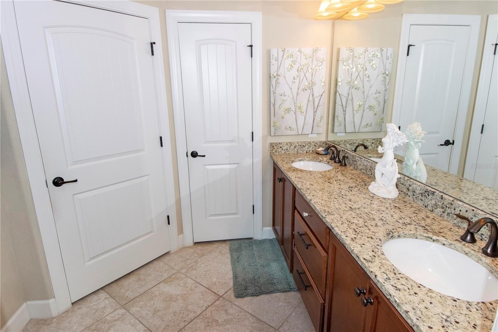 The primary suite includes granite countertops, double vanities, a large walk-in shower with seating, and an oversized custom closet with built-in organizer. The second bedroom is privately located away from the primary suite and includes two closets, offering comfort and convenience for guests.