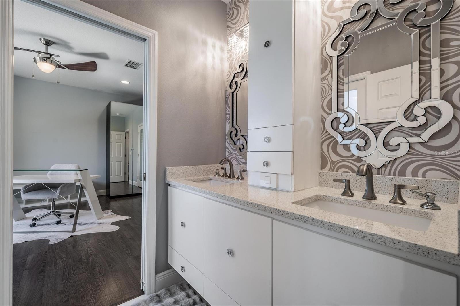The spacious primary suite, on the first floor, includes a large sitting area ideal for a private retreat, elegant tray ceilings & custom wall cabinetry. The primary ensuite bathroom features dual vanities, a large walk-in shower, and generous walk-in closets.
