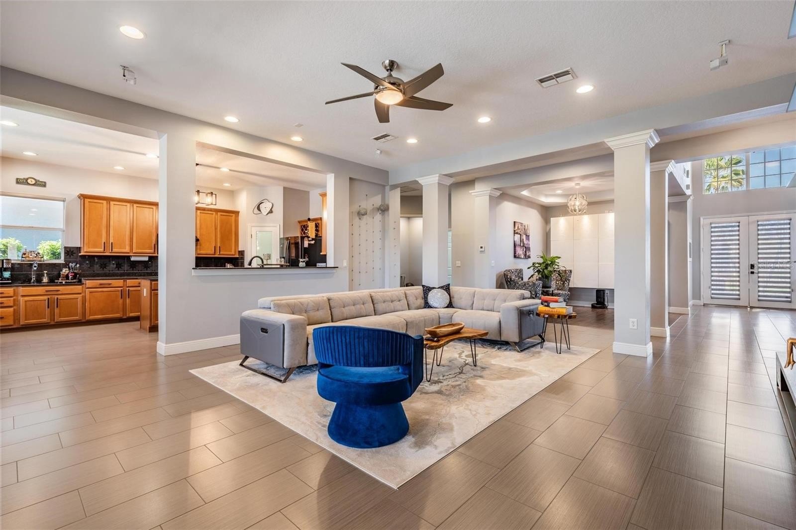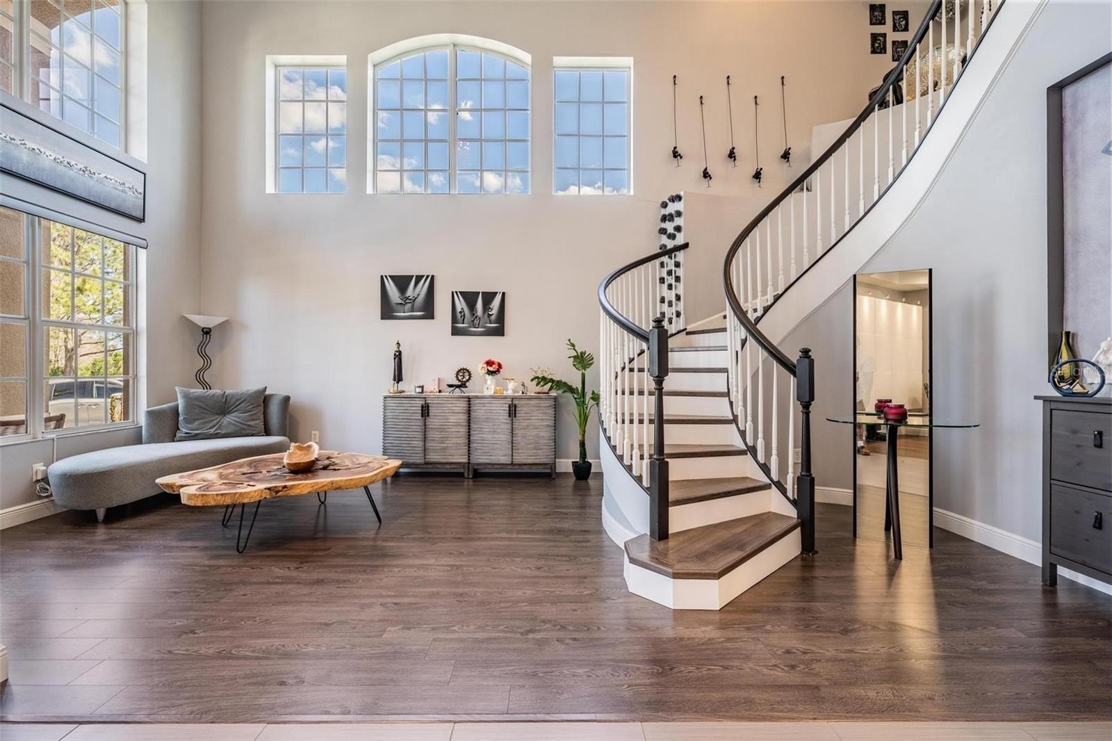 This home has been meticulously maintained, and it shows in every detail. Step through the front door, you’ll immediately be captivated by the soaring 22-foot vaulted ceilings and the show-stopping staircase that creates a grand first impression. The open floor plan flows effortlessly, offering beautiful sightlines from the front entry throughout the home, leading to picturesque views of the backyard and the landscaped golf course beyond.