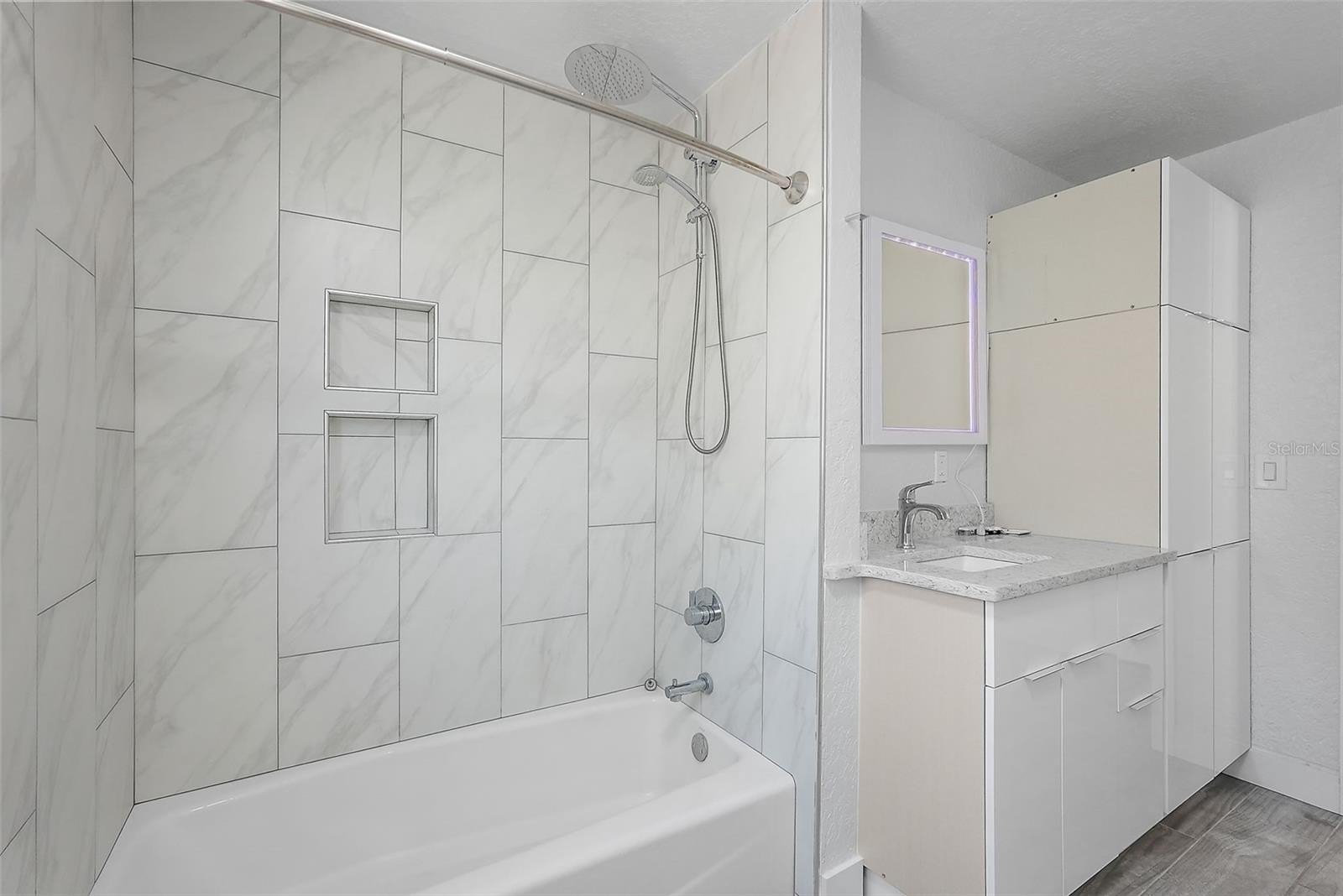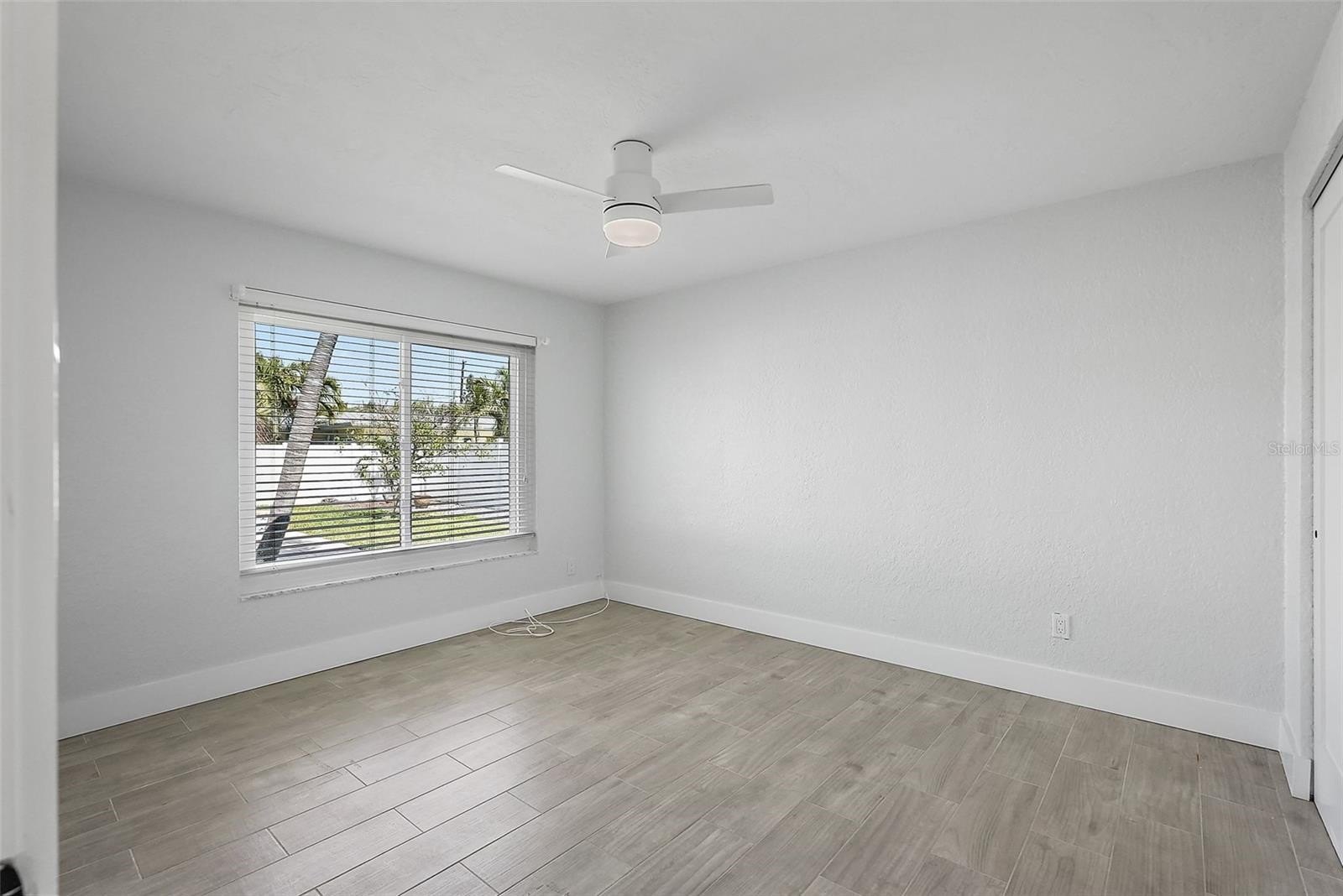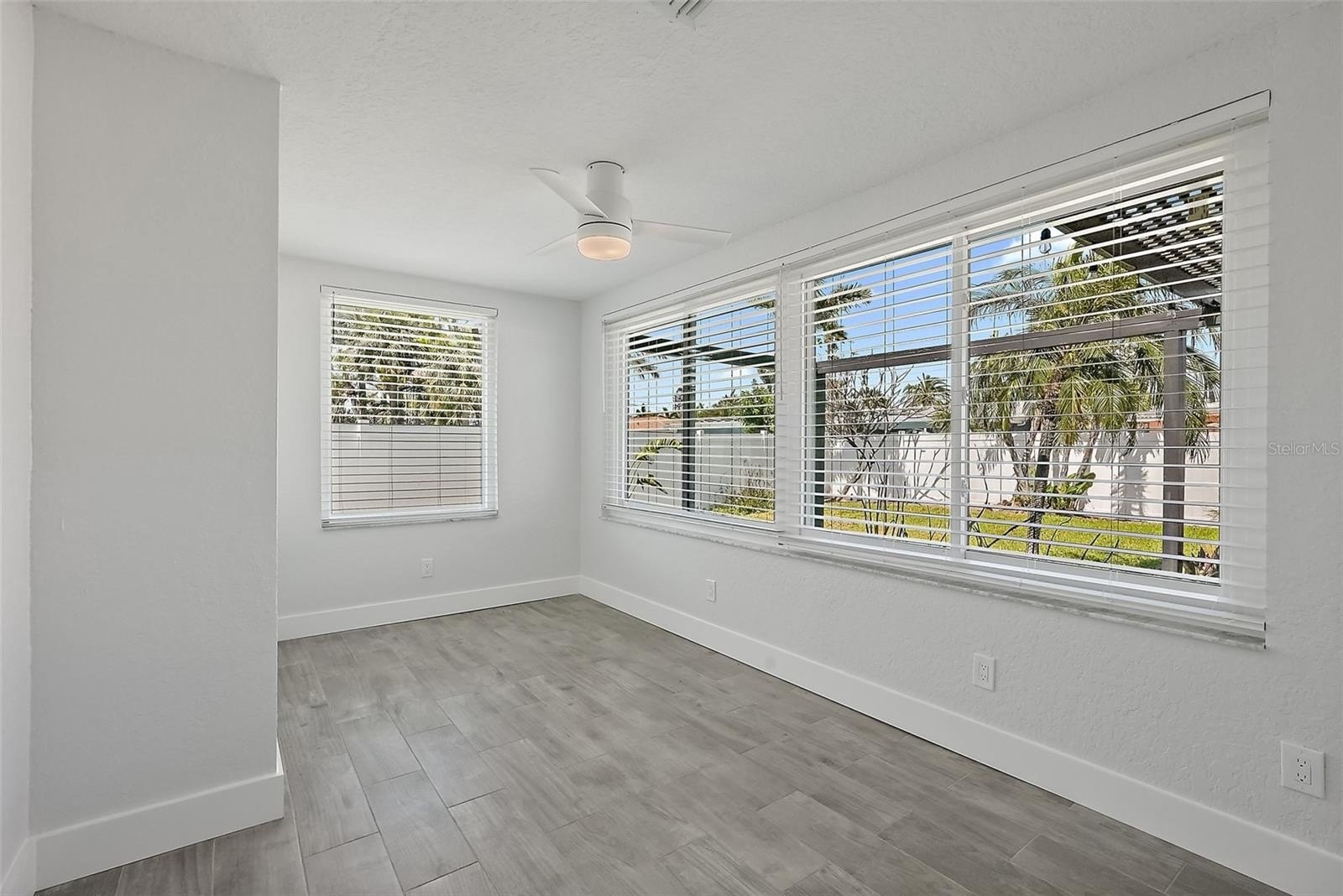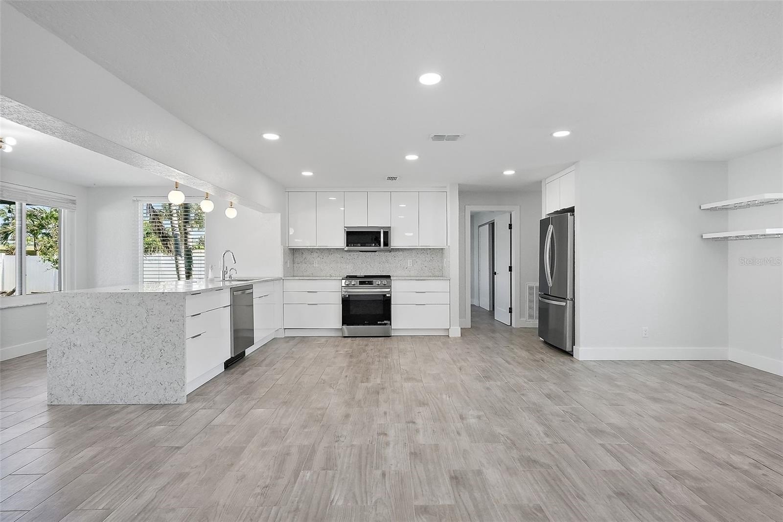 Step inside to a sun filled great room with cool plank tile flooring, abundant natural light, and a seamless flow into the chef’s kitchen. The kitchen is a standout, featuring custom cabinetry, brand new stainless steel appliances, Quartz waterfall counters, and an expansive breakfast bar ideal for casual dining or gathering with friends.