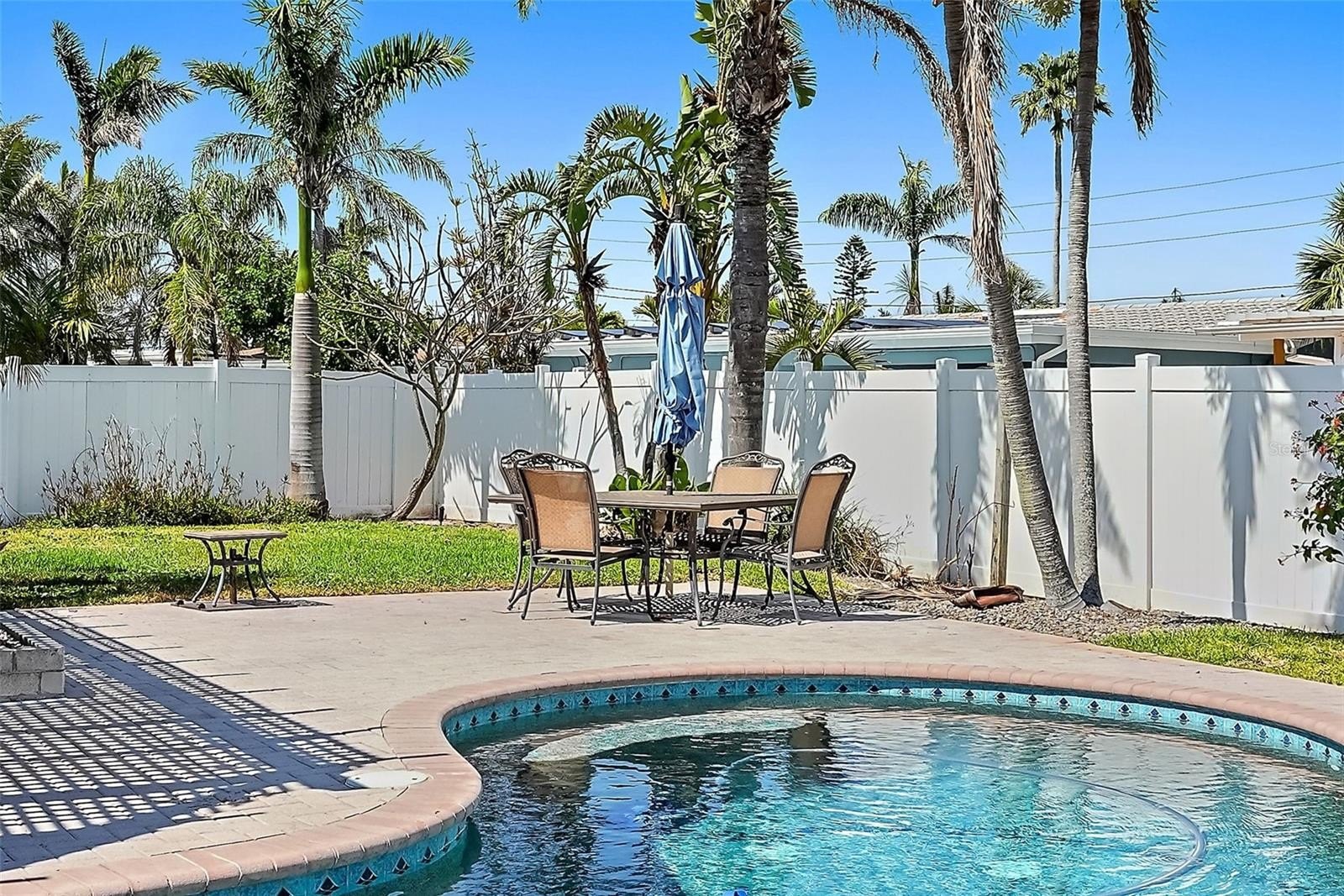 Sliding doors open to a lush, tropical backyard designed for relaxation and fun. Enjoy the sparkling pool with spillover fountain, an extensive paver patio for lounging or dining, and a fully fenced yard with ample green space for pets or gardening. The soothing sound of the fountain creates a peaceful, resort like atmosphere you’ll love coming home to.