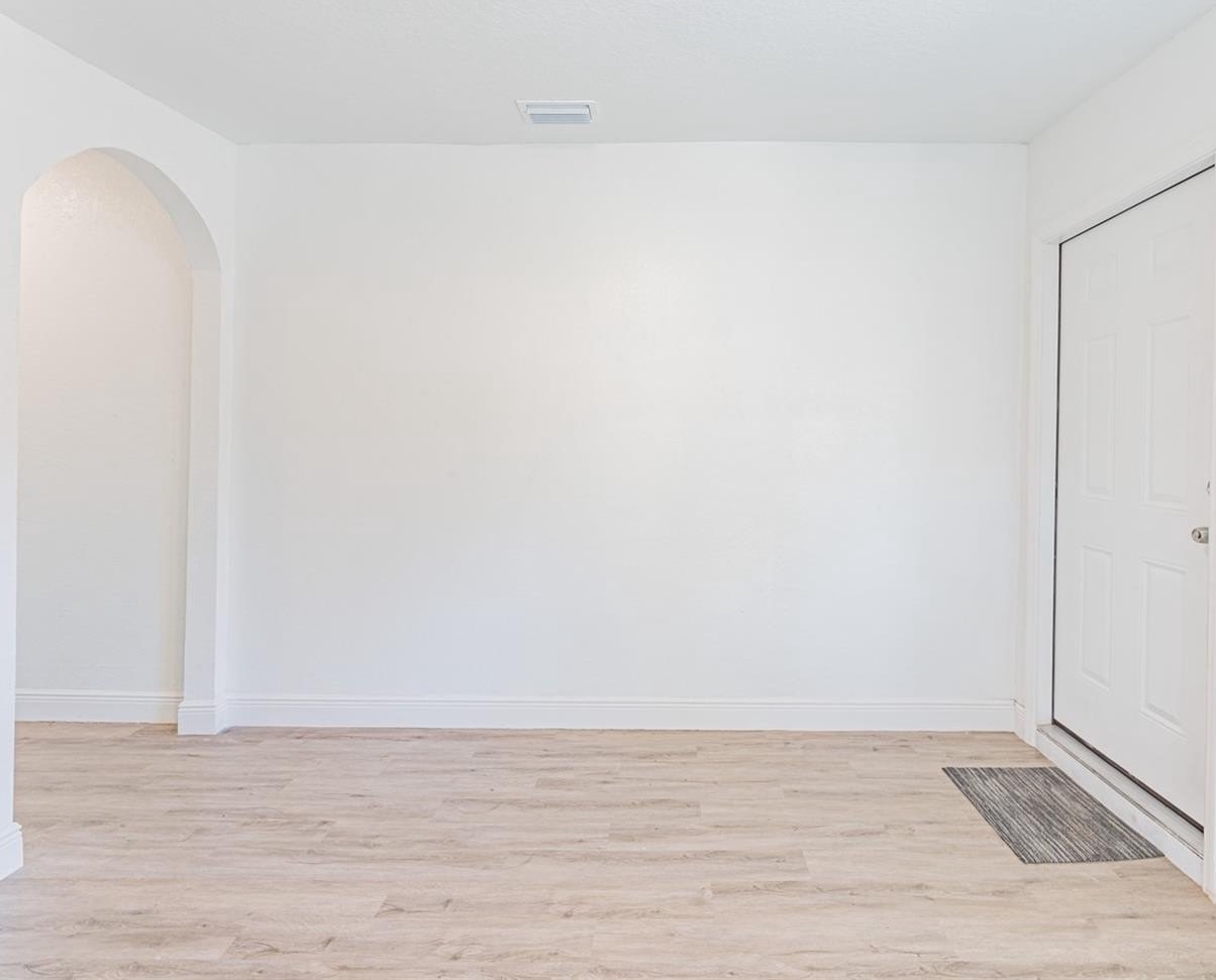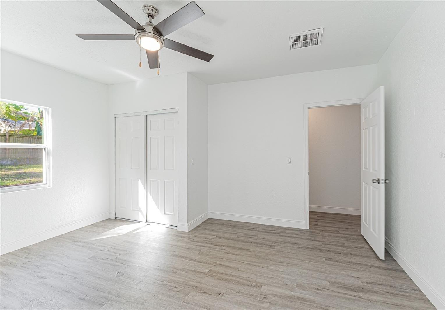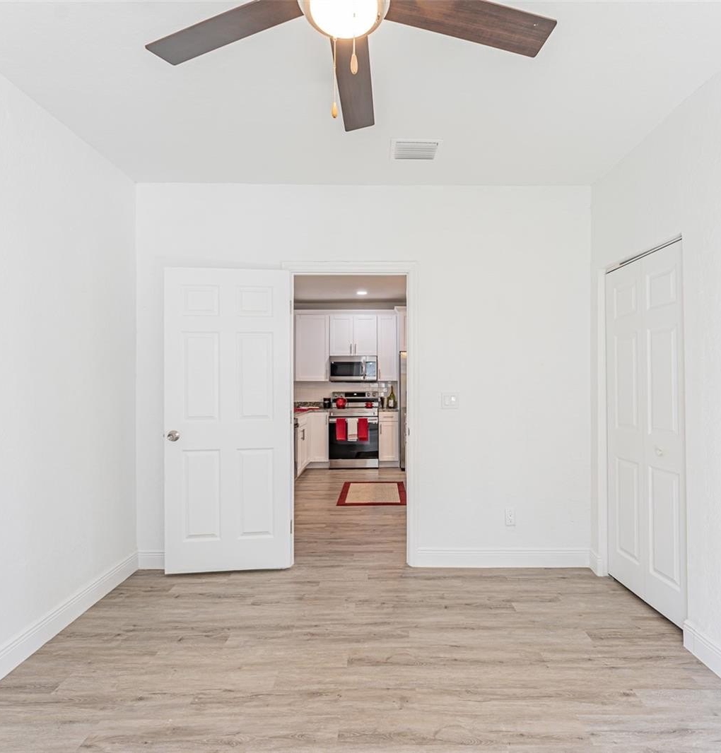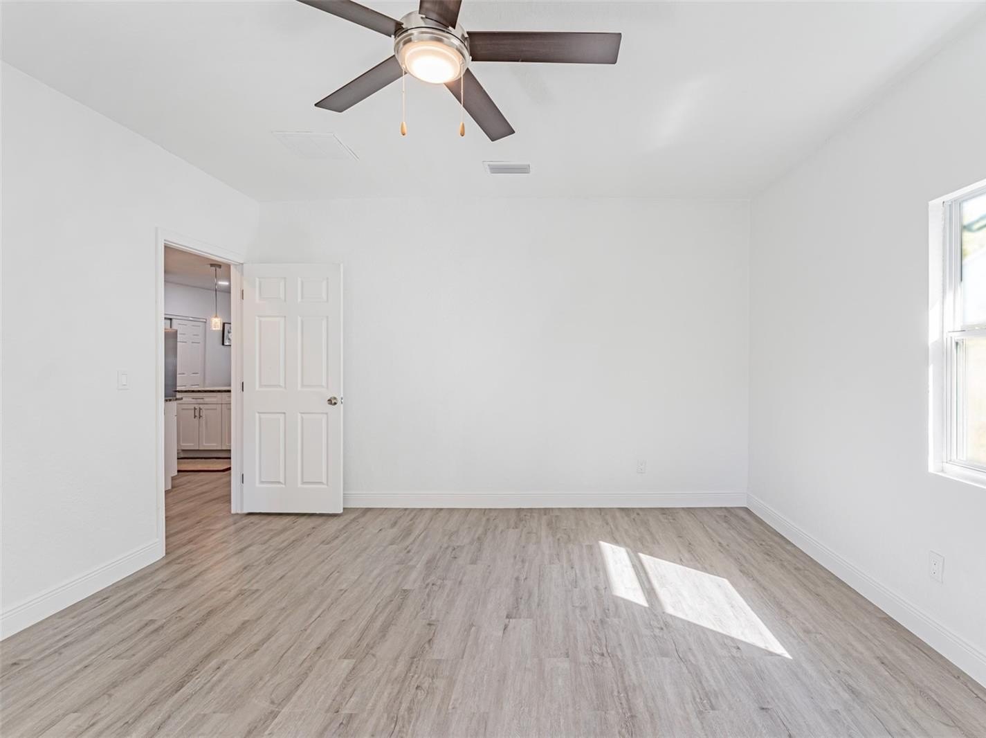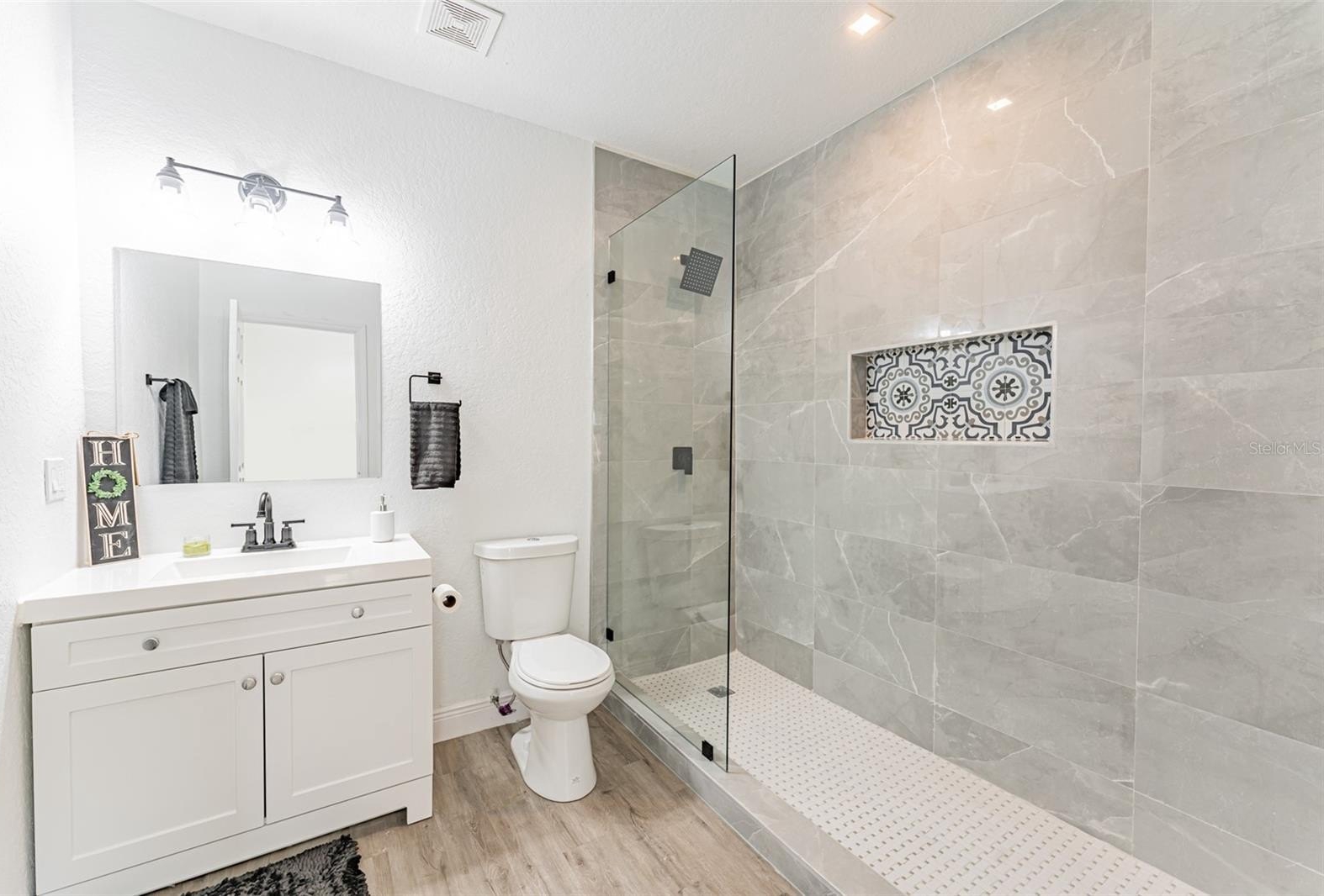 The primary suite includes luxury vinyl plank flooring and a fully renovated ensuite bath with floor-to-ceiling tile and an oversized walk-in shower. Secondary bedrooms are generously sized, and the hall bath offers a tub/shower combination. A rear flex space with washer and dryer hookups provides ideal space for an office, guest area, or additional storage.