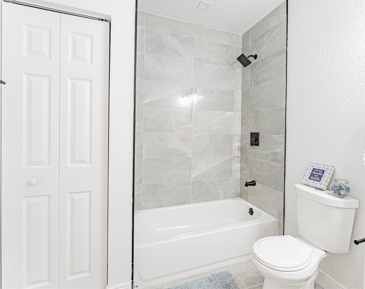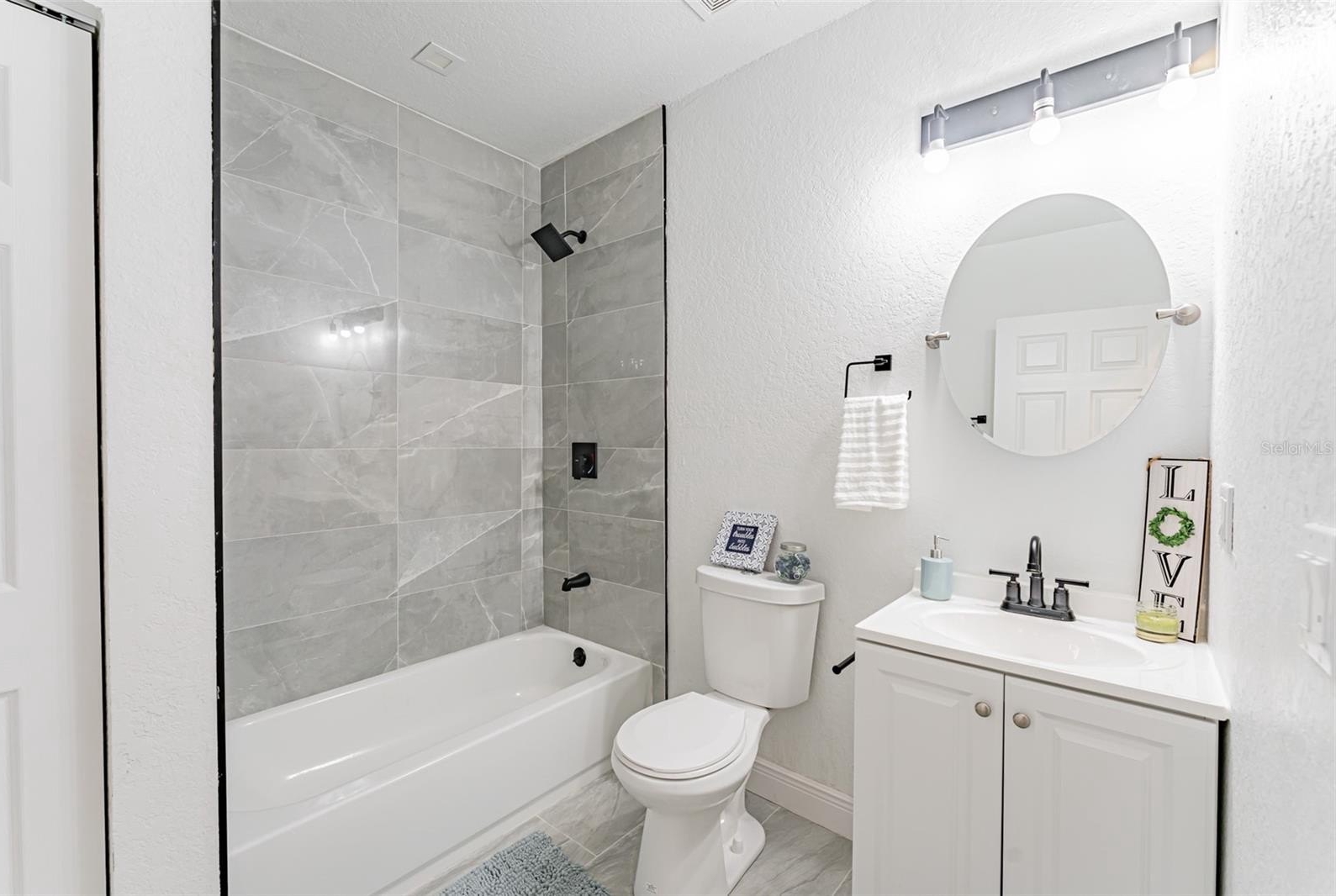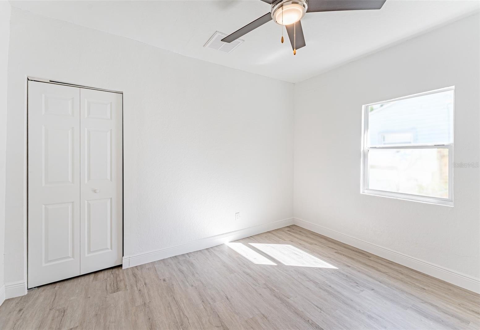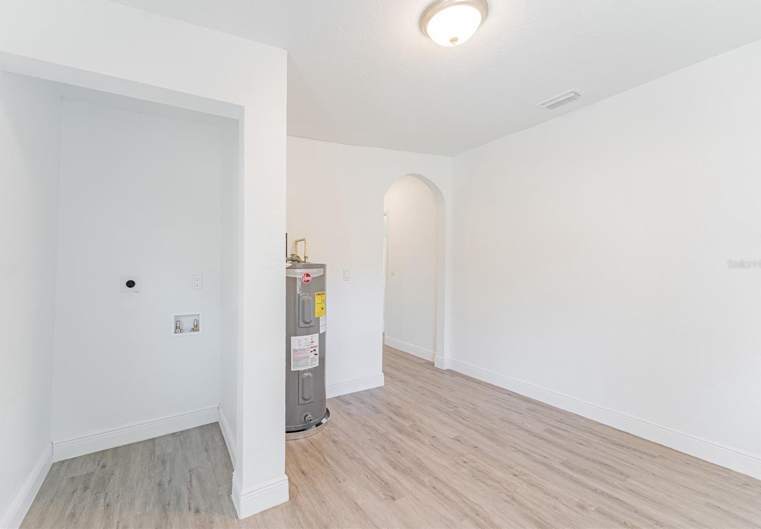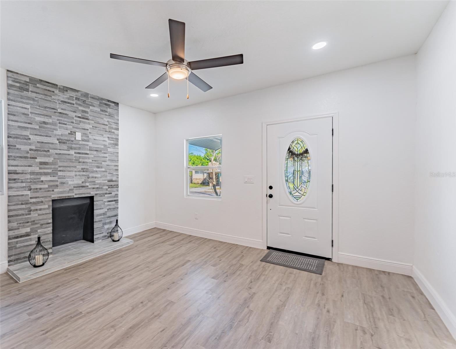 The primary suite includes luxury vinyl plank flooring and a fully renovated ensuite bath with floor-to-ceiling tile and an oversized walk-in shower. Secondary bedrooms are generously sized, and the hall bath offers a tub/shower combination. A rear flex space with washer and dryer hookups provides ideal space for an office, guest area, or additional storage.