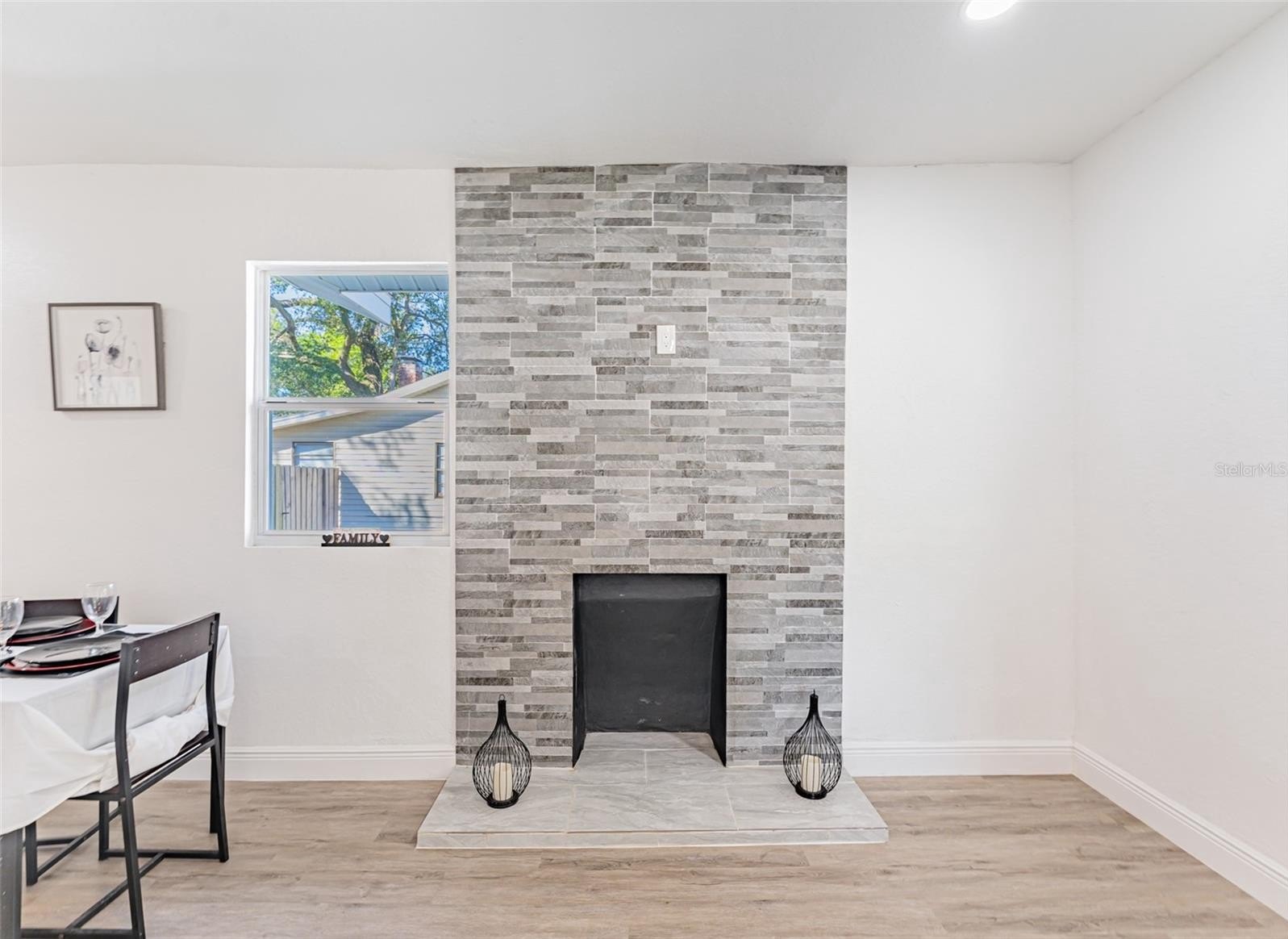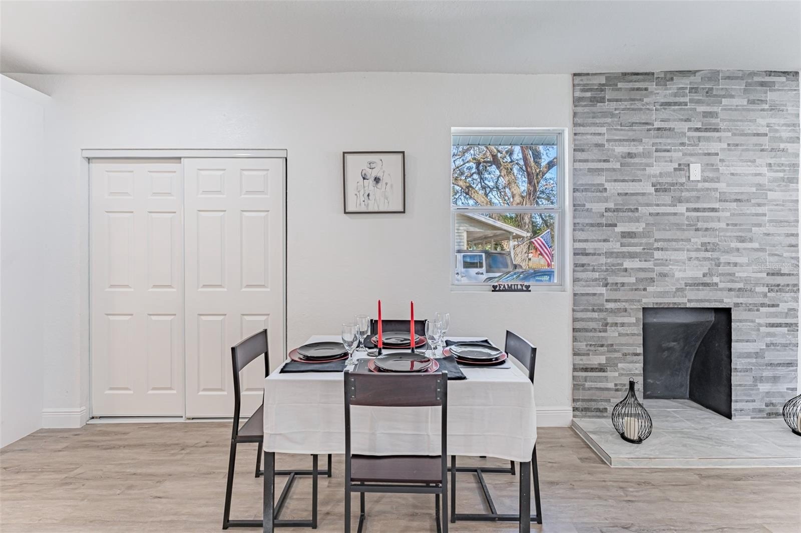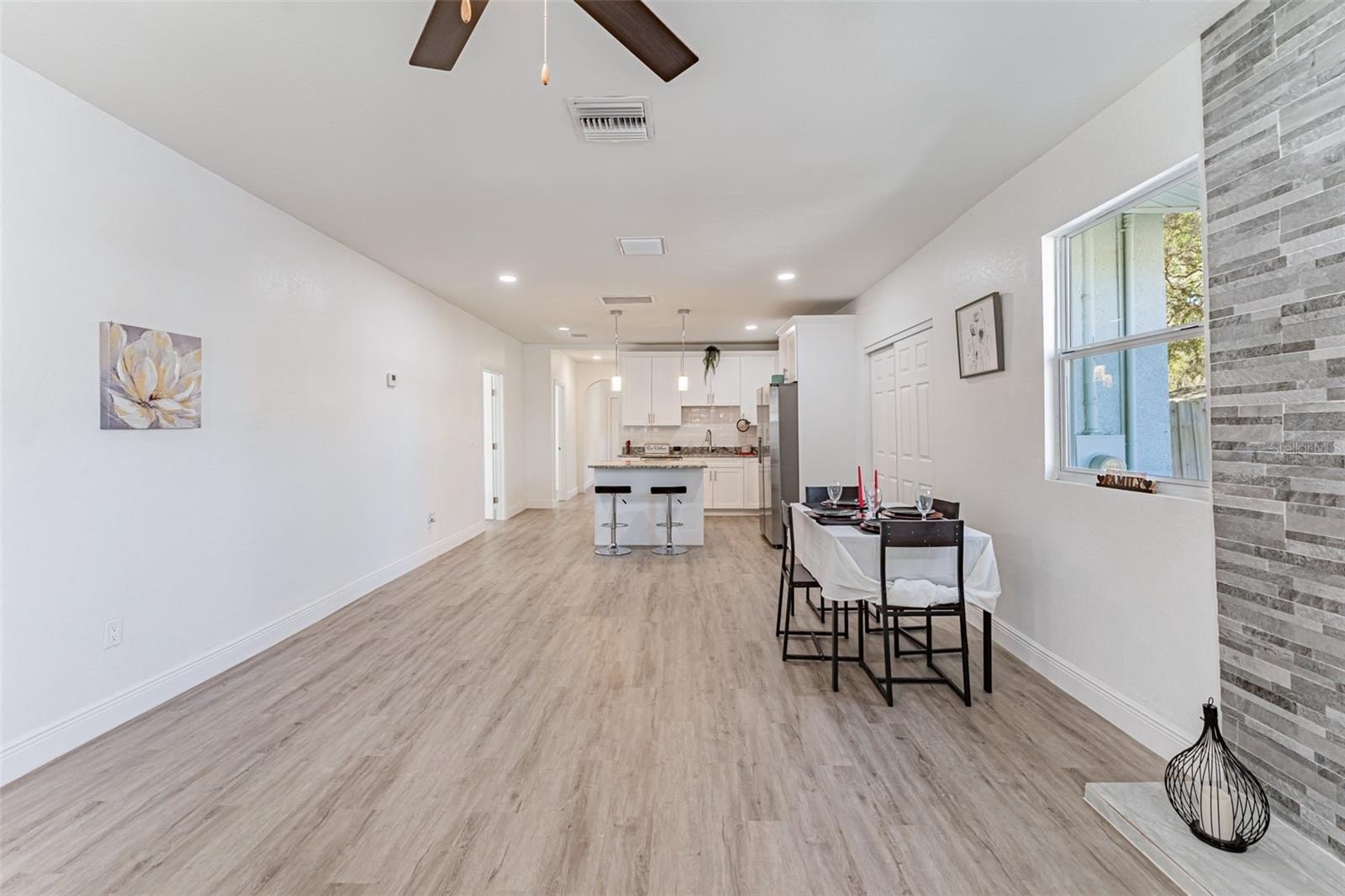 The open-concept living and dining area flows into an updated kitchen featuring granite countertops, white cabinetry, subway tile backsplash, large pantry, and brand-new Samsung appliances.
