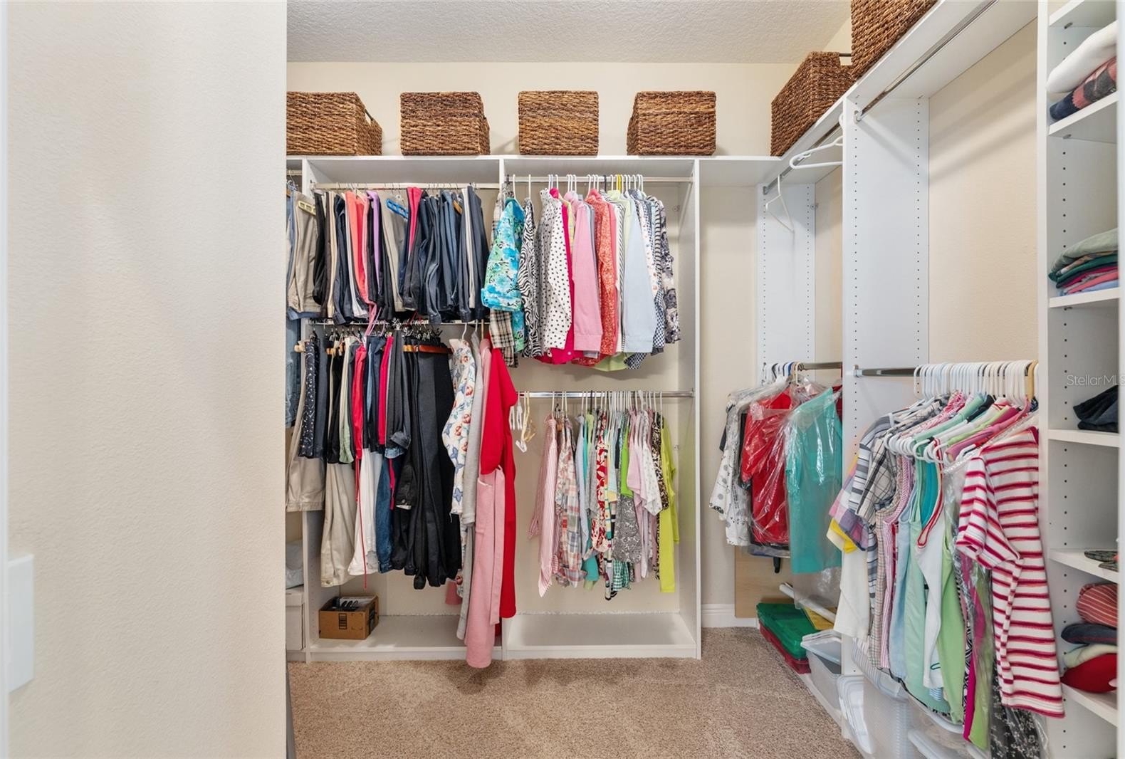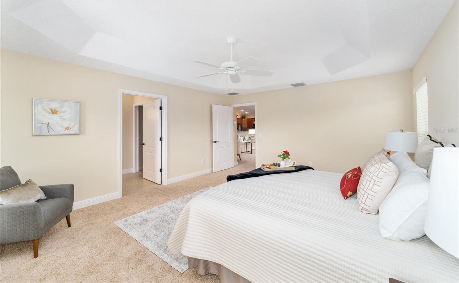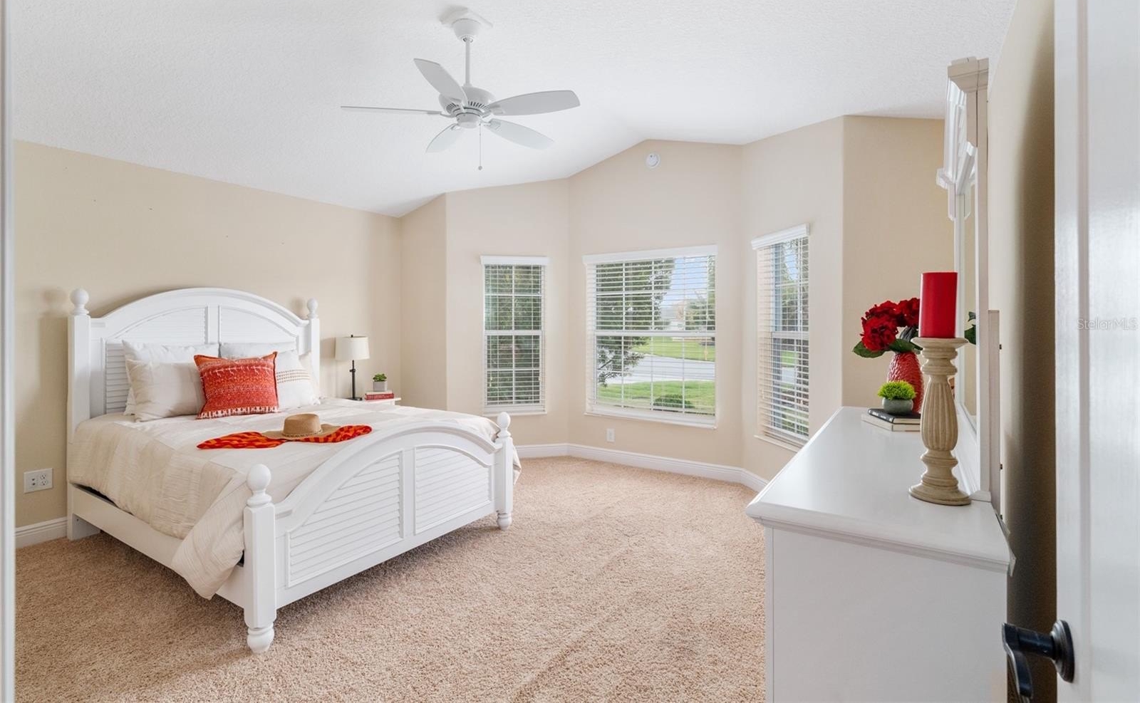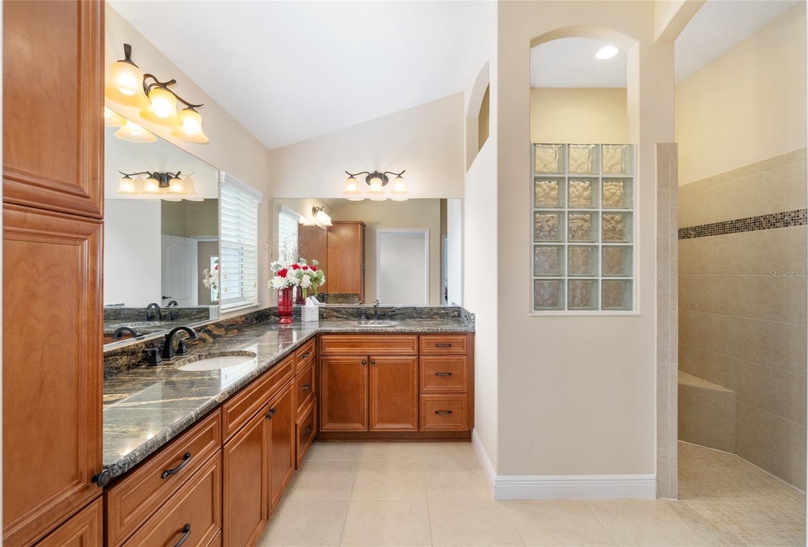 The PRIMARY SUITE is spacious and airy, featuring TRAY CEILINGS and FOUR LARGE WINDOWS that fill the room with Florida sunshine. The PRIMARY BATH includes DUAL GRANITE VANITIES, an ELEGANT TILED WALK-IN SHOWER, and a CUSTOM WALK-IN CLOSET with ample shelving and storage.