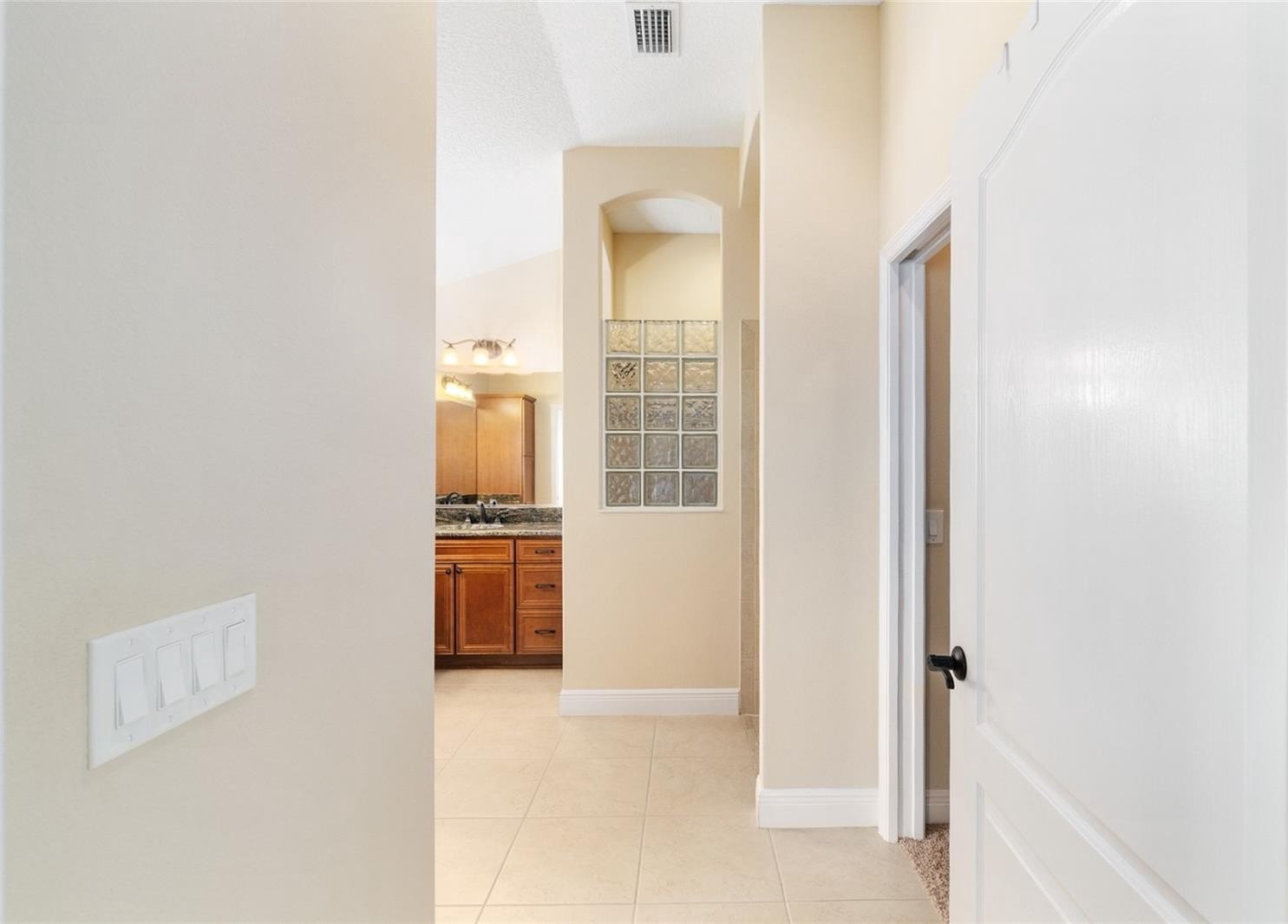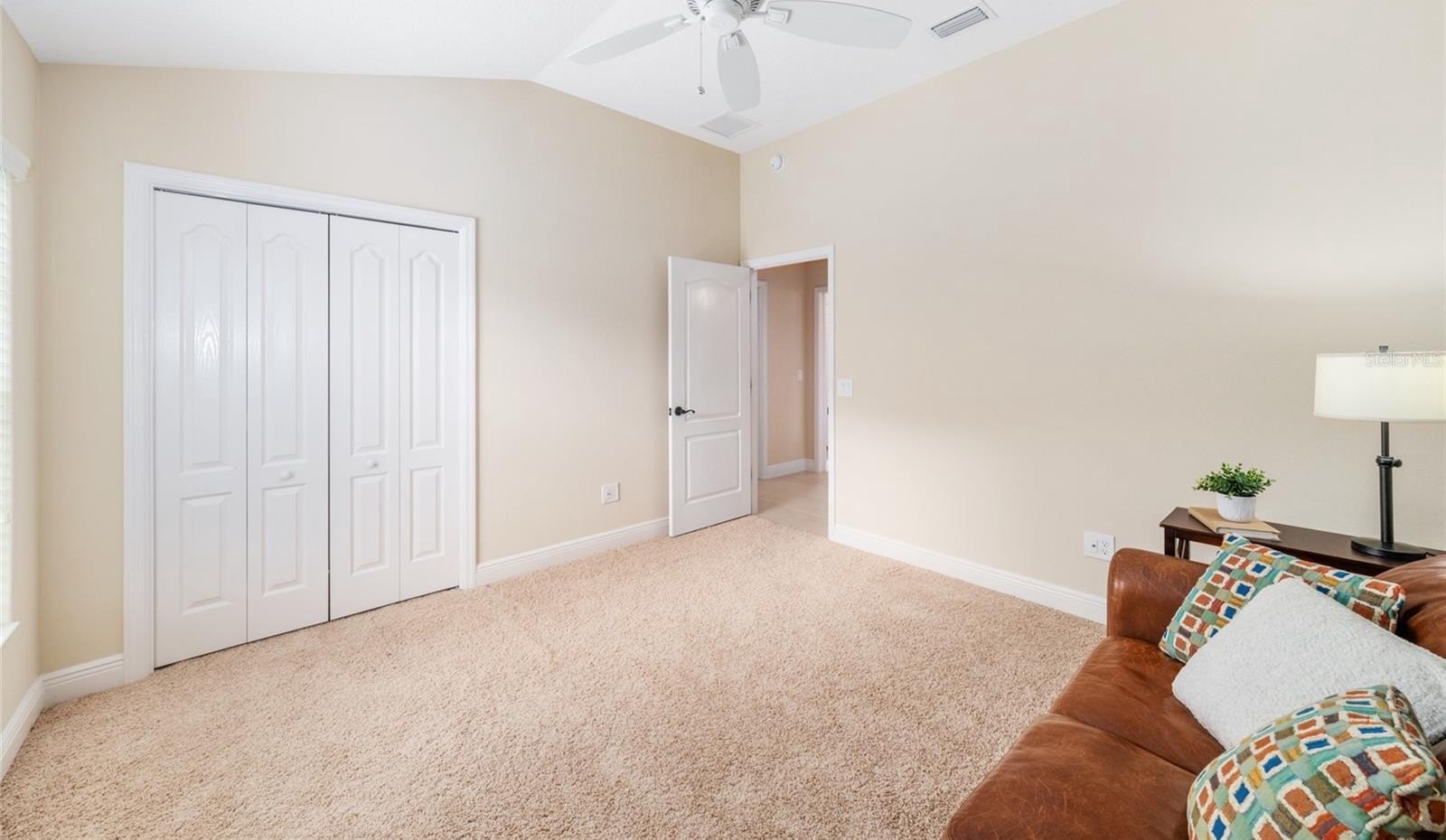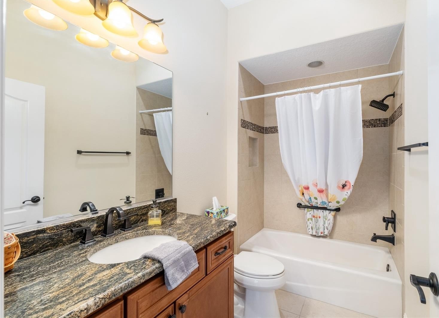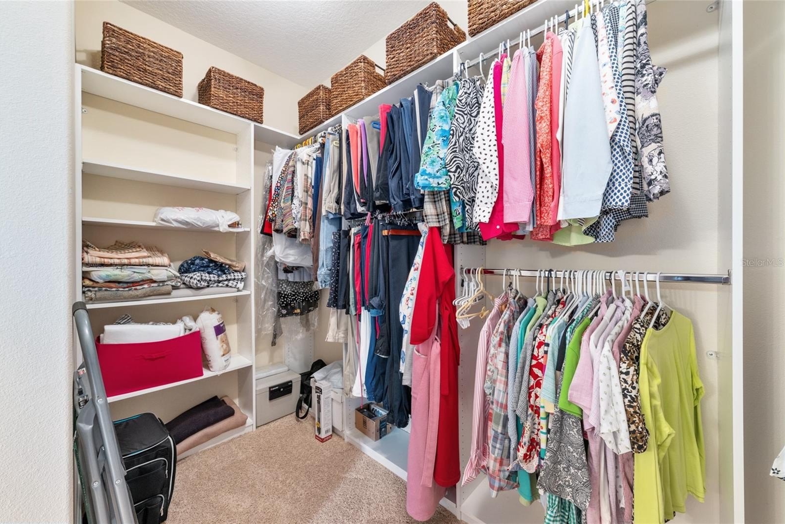 The PRIMARY SUITE is spacious and airy, featuring TRAY CEILINGS and FOUR LARGE WINDOWS that fill the room with Florida sunshine. The PRIMARY BATH includes DUAL GRANITE VANITIES, an ELEGANT TILED WALK-IN SHOWER, and a CUSTOM WALK-IN CLOSET with ample shelving and storage.