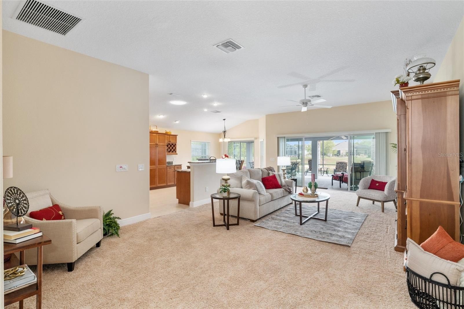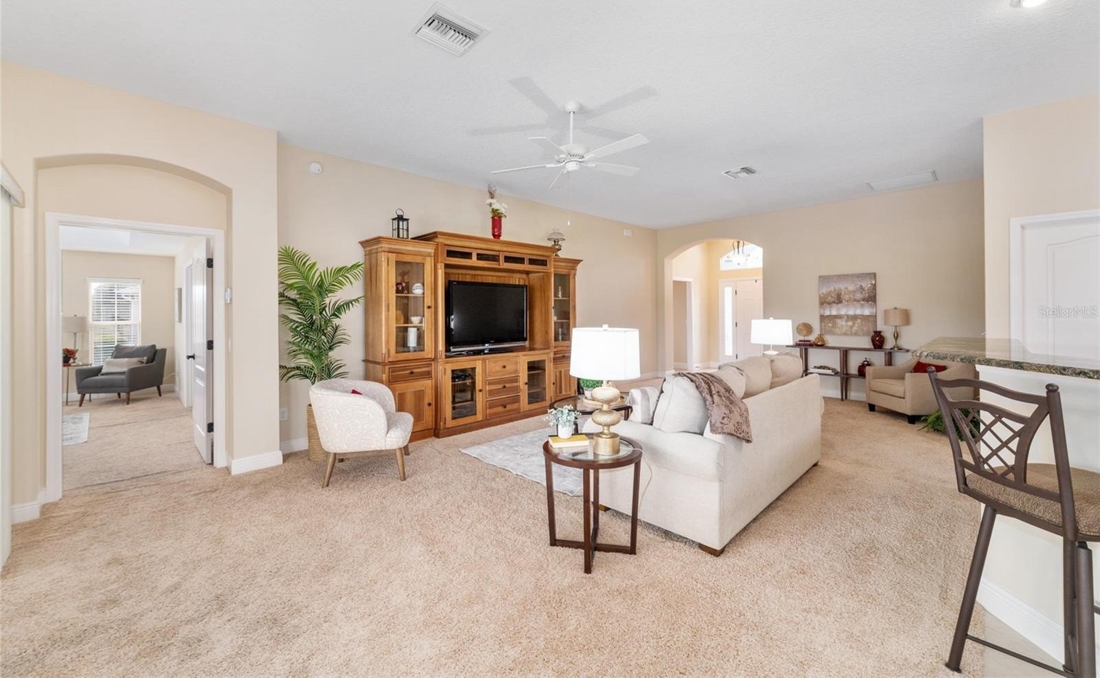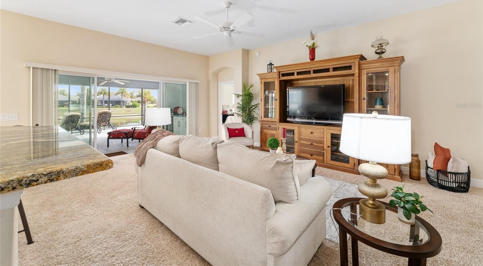 Step inside to an OPEN, LIGHT-FILLED FLOOR PLAN designed for comfortable living and effortless entertaining. The home features HIGH CEILINGS, a SOLAR TUBE FOR NATURAL LIGHT, and an inviting living area that flows seamlessly to the EXTENDED LANAI and tranquil POND VIEWS beyond.