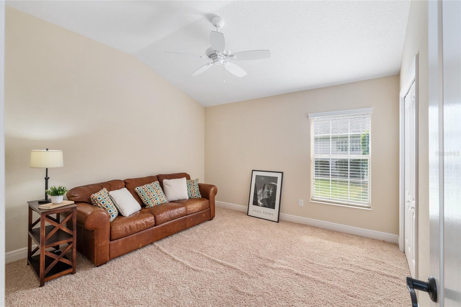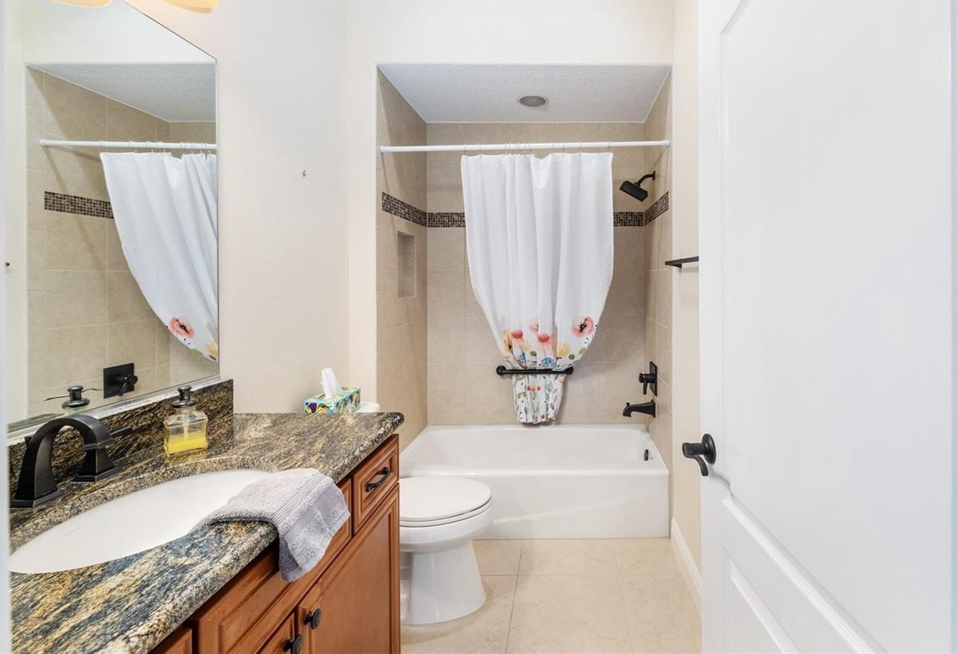 Two additional bedrooms are GENEROUSELY SIZED with HIGH CEILINGS and plenty of natural light, and the nearby GUEST BATHROOM features TILE FLOORING and GRANITE COUNTERTOPS. A convenient POCKET DOOR CREATES A PRIVATE GUEST SUITE AREA, ideal when hosting visitors.