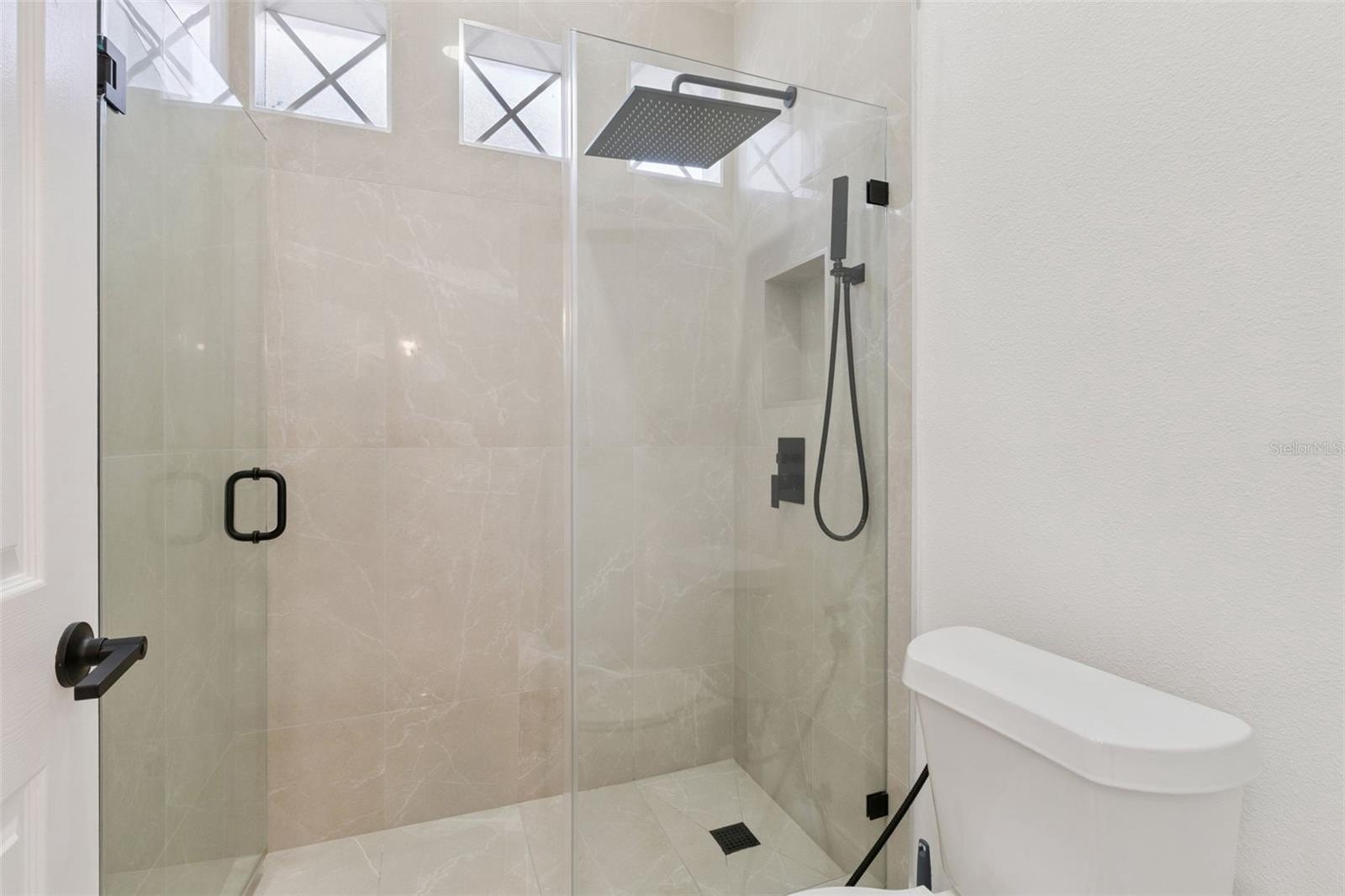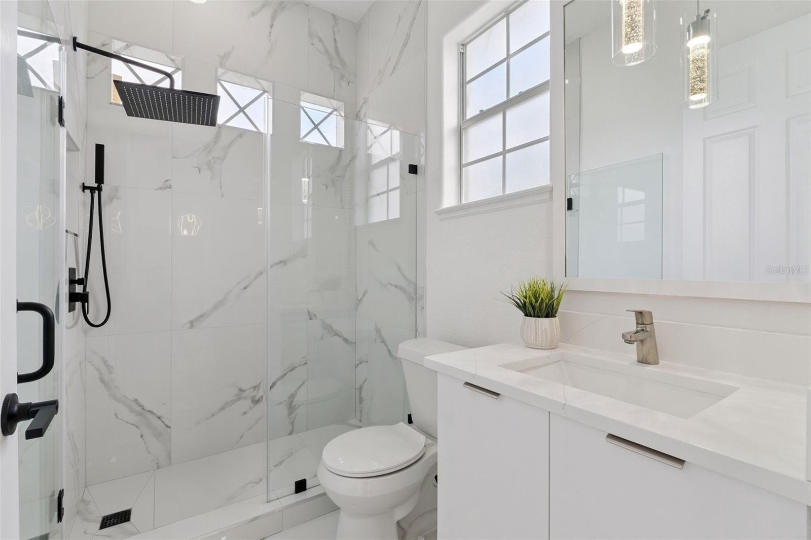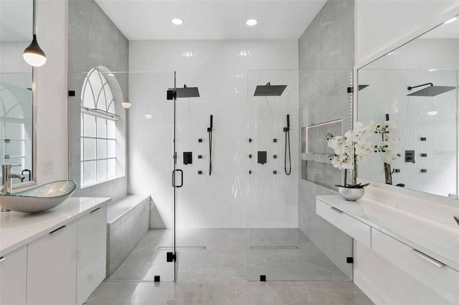 The family room and kitchen area boast high ceilings that create a bright, spacious feel, accentuated by large windows that frame picturesque water views. The living room space is perfect for gatherings, with contemporary finishes, a neutral color palette, and modern recessed lighting that enhance its inviting ambiance. The oversized primary suite is a private retreat, featuring a large picture window overlooking the water, high ceilings, and luxury vinyl plank flooring. The spa-inspired primary bathroom offers dual vessel sinks, a floating vanity, a frameless glass walk-in shower with dual rainfall showerheads, and a luxurious body jets system—an oasis for relaxation and rejuvenation.