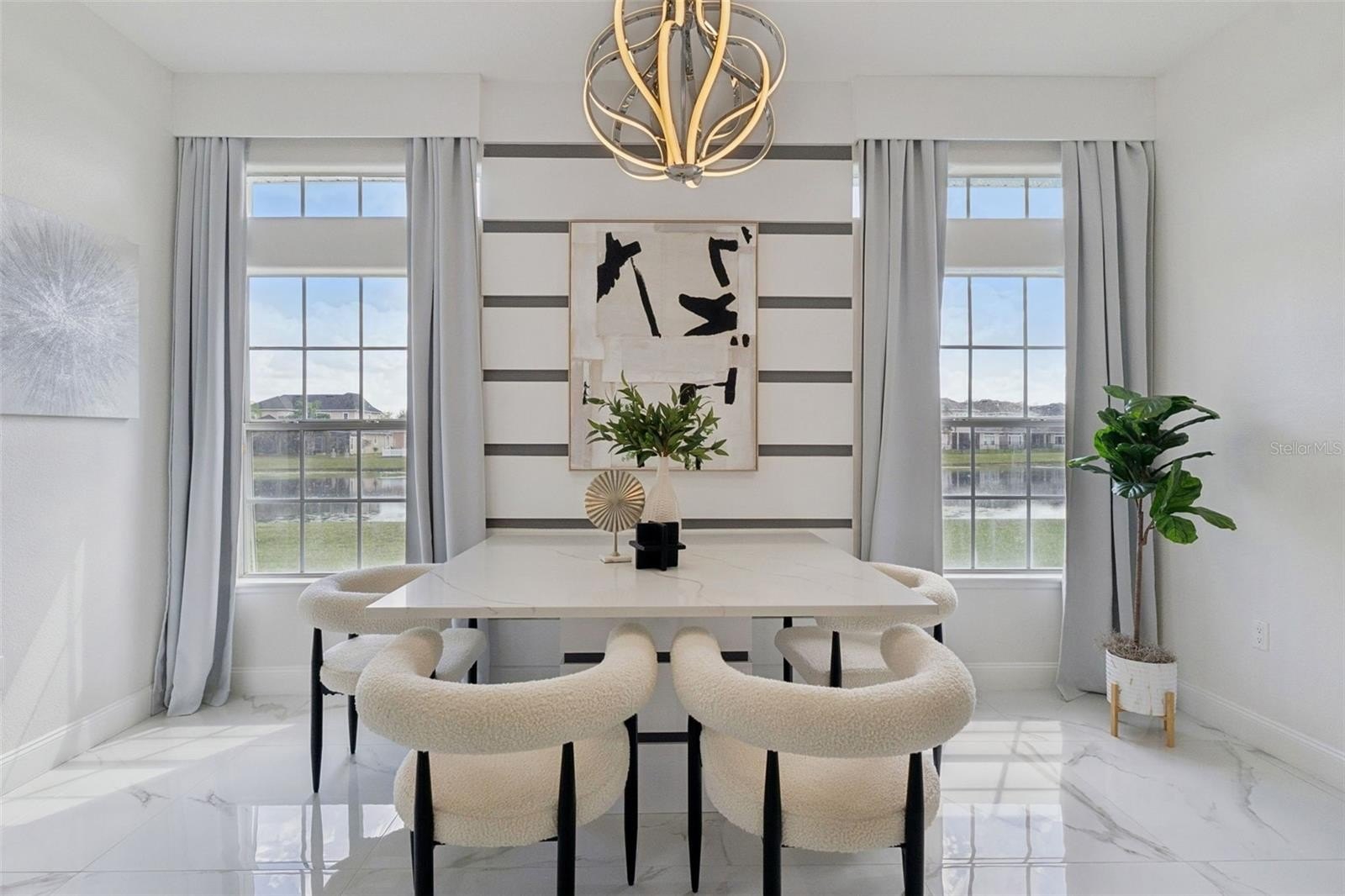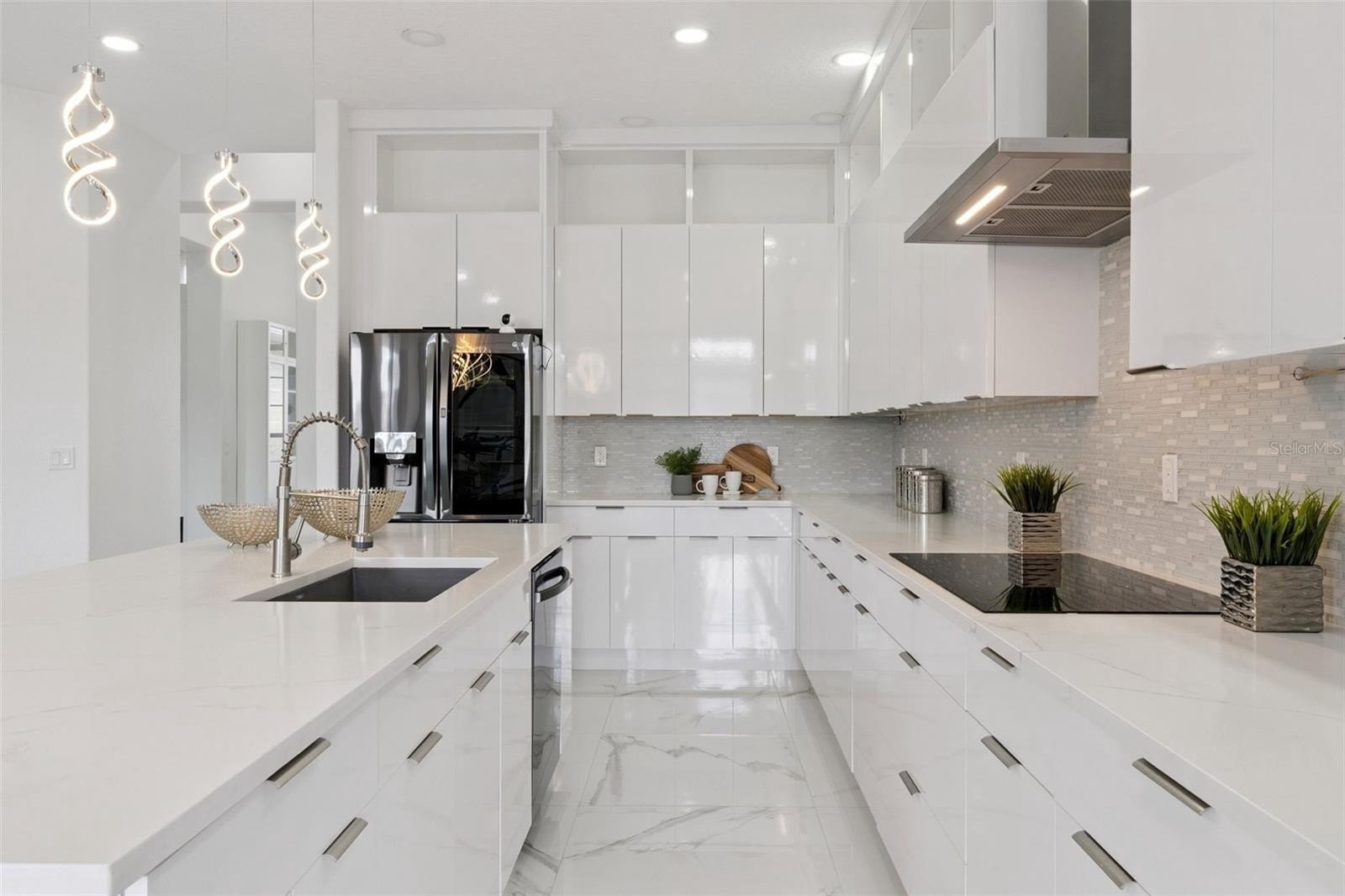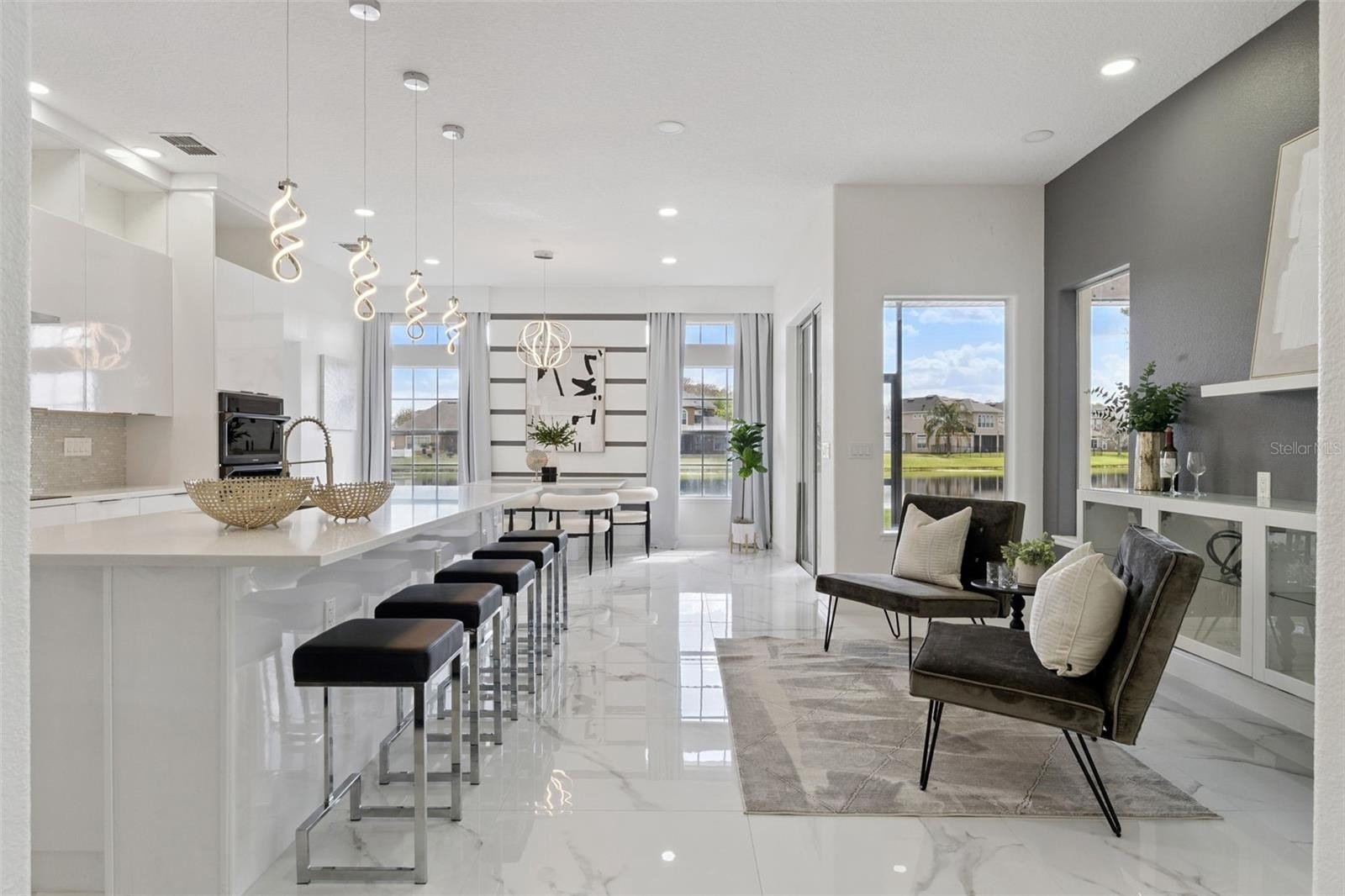 Step inside to discover a bright and airy layout, adorned with large-format polished porcelain tile flooring throughout the main living areas, complemented by luxury vinyl plank flooring in the bedrooms. Flooded with natural light and offering breathtaking water views, this home radiates warmth and elegance. The modern kitchen is a chef’s dream, featuring stunning waterfall-style quartz countertops, a large waterfall island with bar seating, glossy contemporary cabinetry, and a stylish glass tile backsplash. High-end appliances, including built-in wall ovens and a stainless steel range hood, make meal preparation a pleasure. Designer spiral LED pendant lighting adds sophistication to this culinary haven.