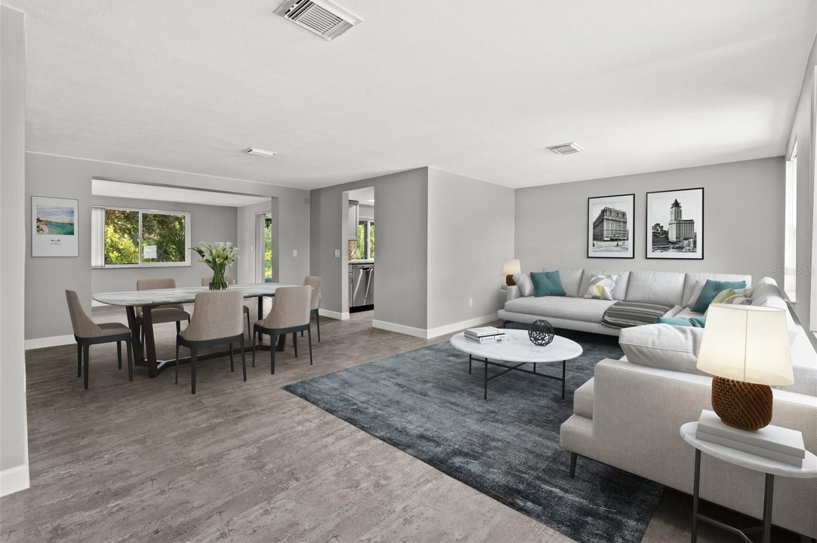 The open living and dining areas flow seamlessly into the beautifully renovated kitchen featuring contemporary finishes, sleek cabinetry, and brand-new appliances — perfect for everyday living and entertaining. New tile flooring runs throughout, complemented by fresh interior paint, updated baseboards, new windows and sliders that invite in natural light, and a hurricane-rated garage door for added peace of mind.