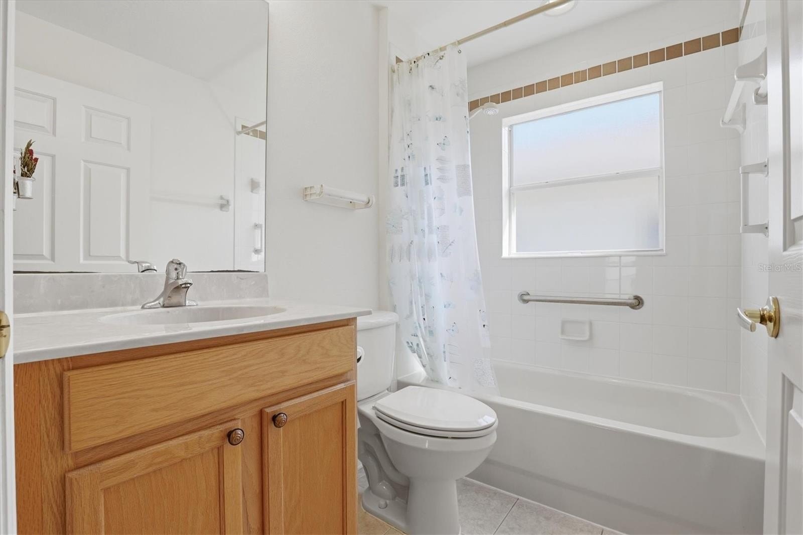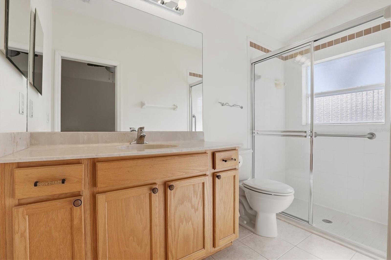 The primary suite offers high ceilings, a large walk-in closet, and a private ensuite bath with solid-surface countertops, wood cabinetry, and a glass-enclosed shower. The guest bedroom and bath are equally welcoming, while the office located just off the foyer provides flexible space for working from home or accommodating guests.