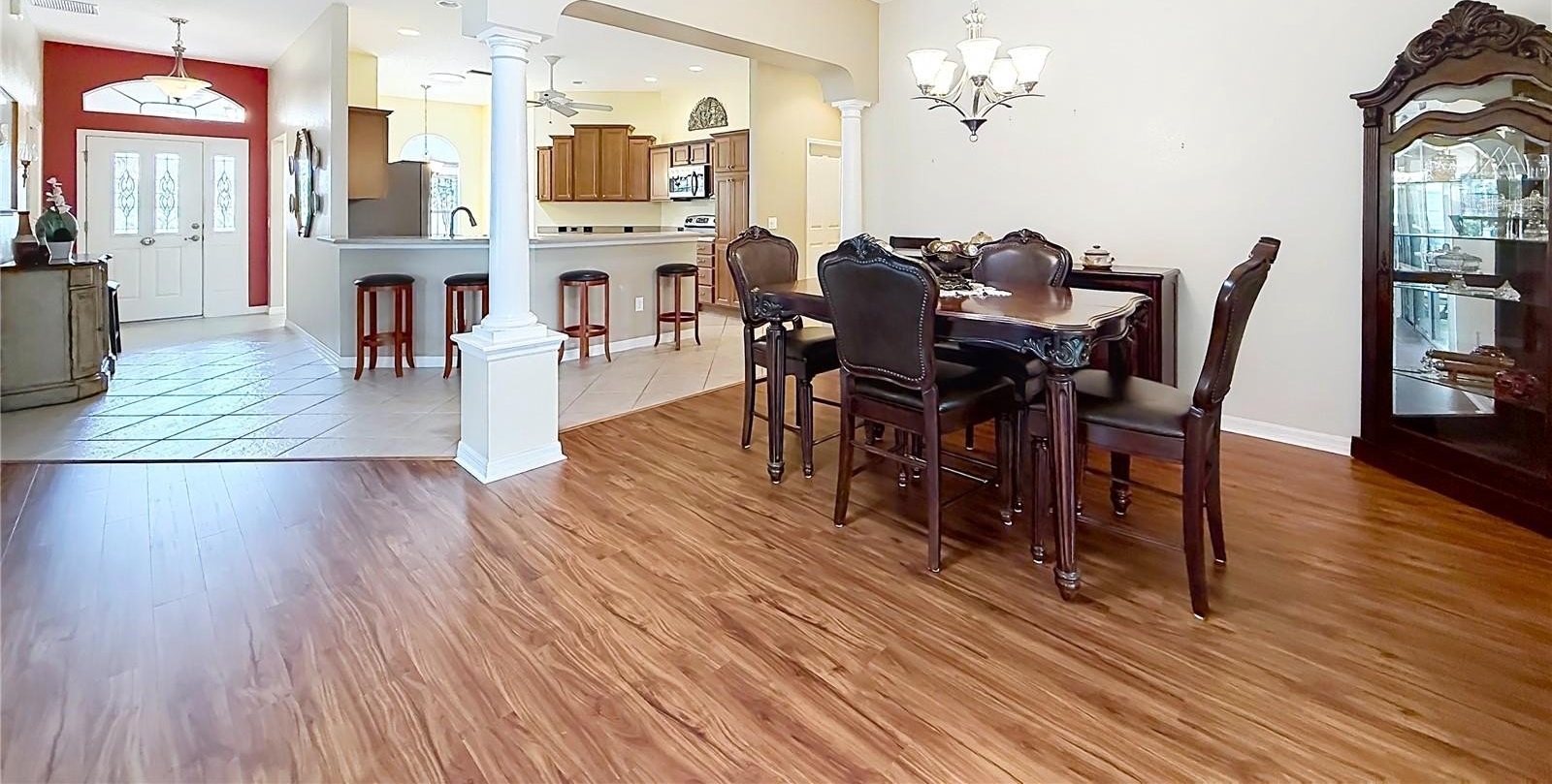 Step inside and you’ll find a bright and inviting kitchen featuring corian countertops, stainless steel appliances, tile flooring, abundant oak cabinetry, and space for a cozy table for four. The kitchen flows seamlessly into the spacious dining area and expansive living room, both enhanced with stylish luxury vinyl plank flooring, creating the perfect space for entertaining family and friends.