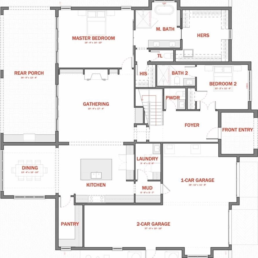Main Level — Primary suite with spa-caliber bath and dual walk-in closets. Second en suite bedroom. Kitchen, dining, and great room open seamlessly to a covered rear porch. End-of-street privacy, natural seclusion, and the full depth of an oversized lot.