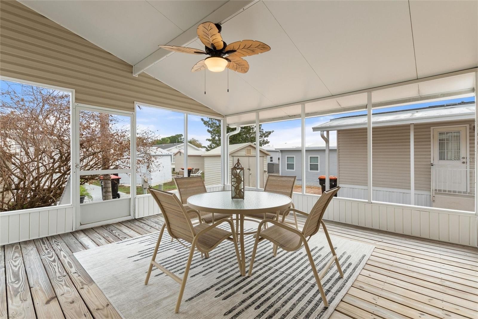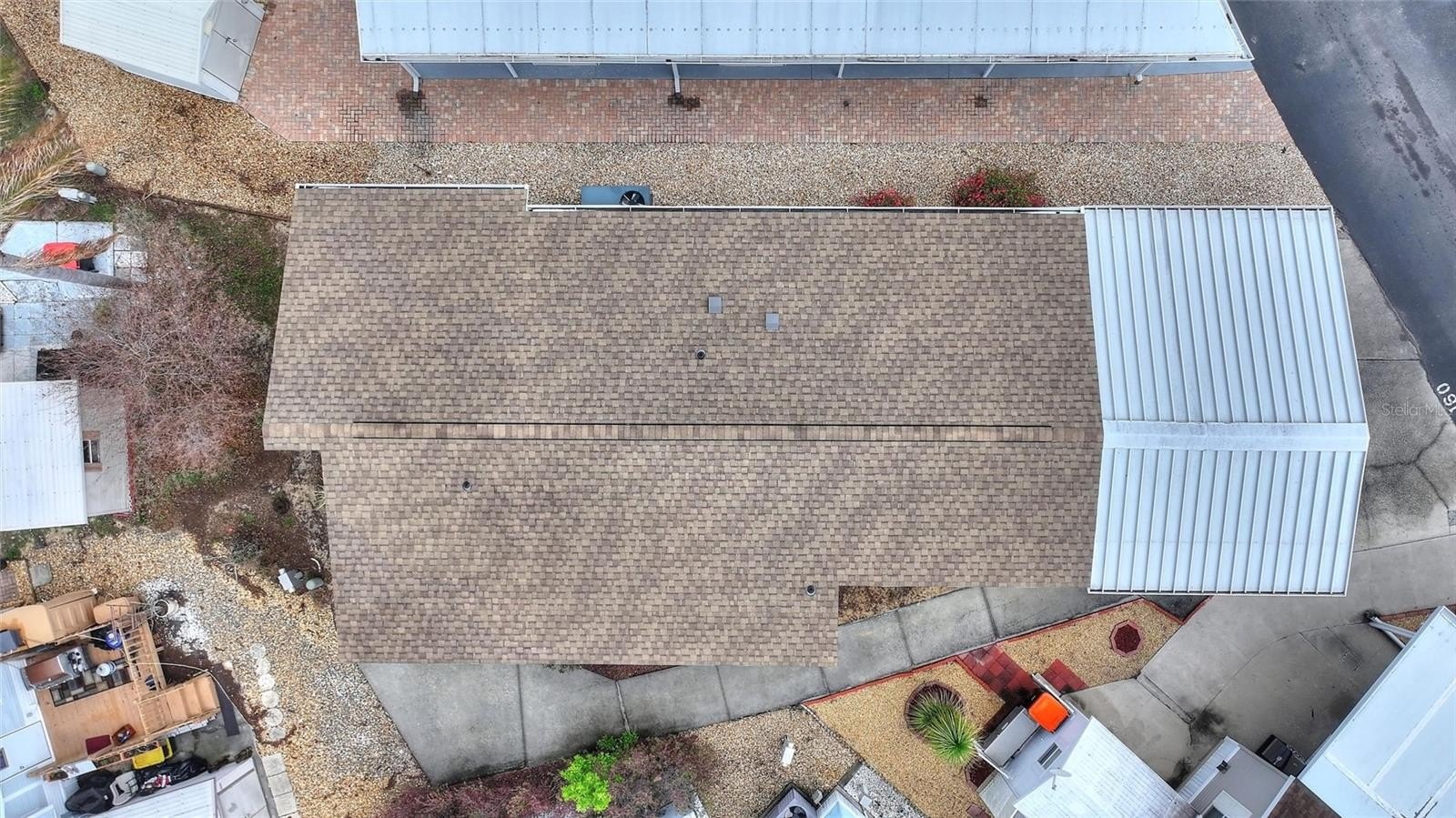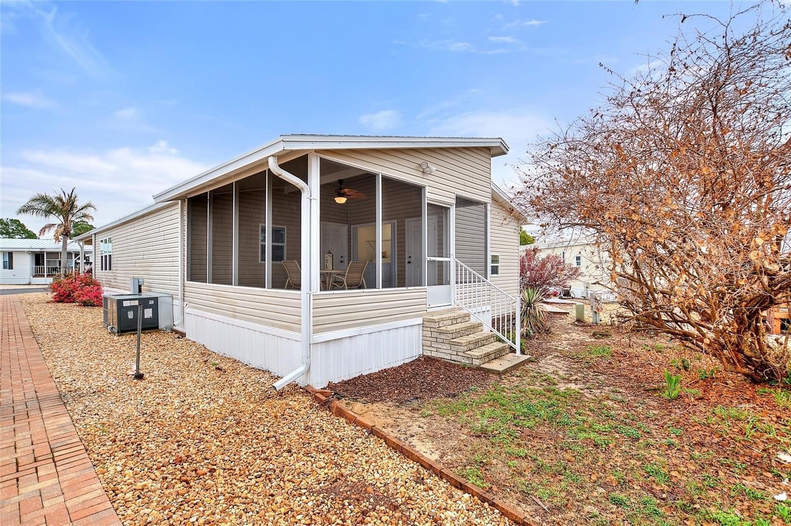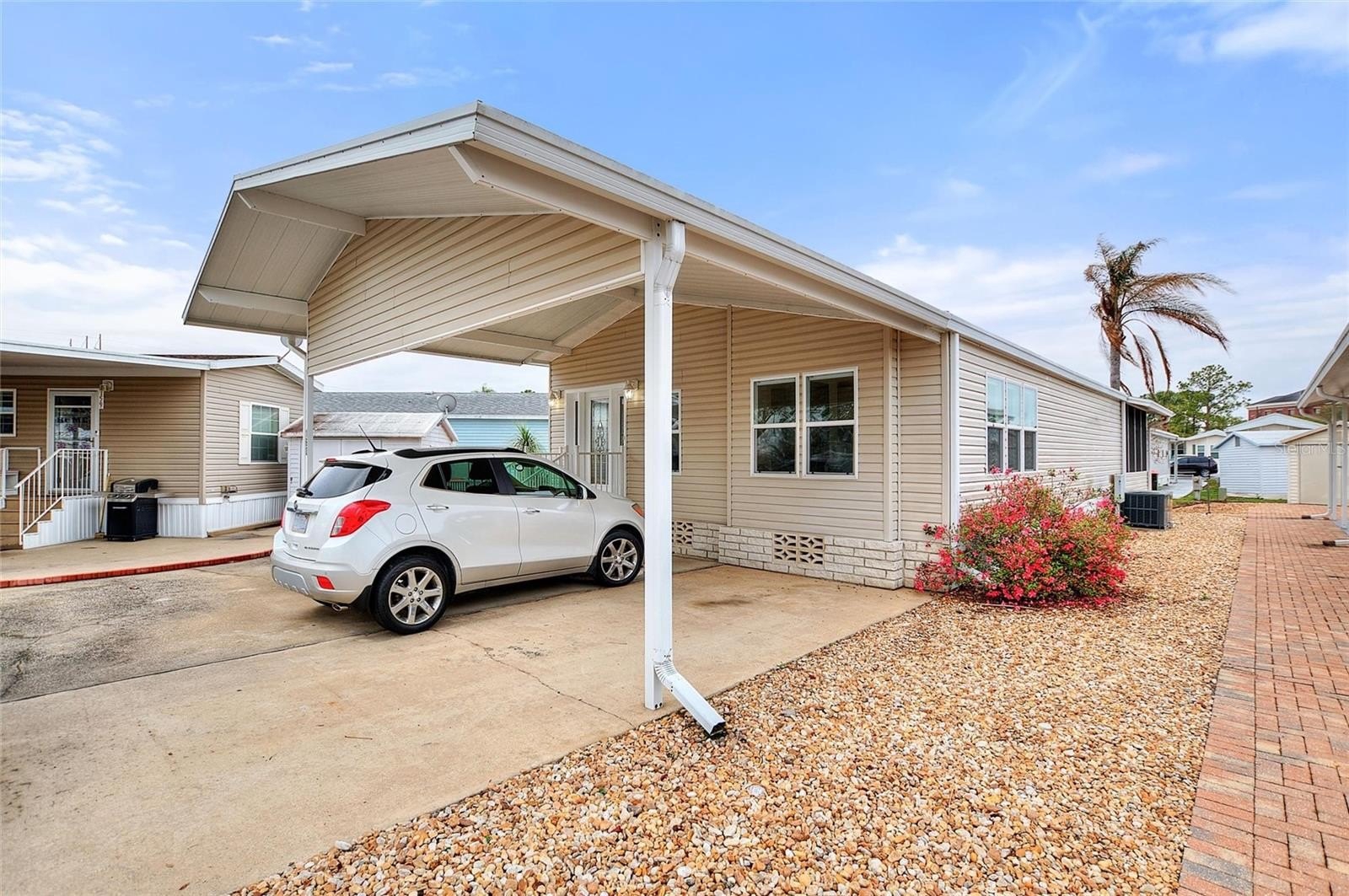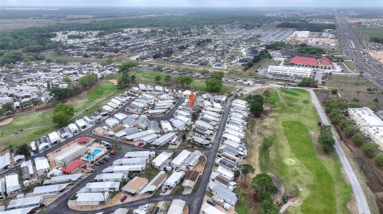 MOVE-IN Condition Furnished 2/2 Park Model on OWNED land with NEW Shingled ROOF (3/13/2026), Stainless-Steel Kitchen Appliances, Quartz Kitchen Countertops & Ceramic Tile Backsplash, Updated Bathrooms, Under-Roof Screened Lanai and a Golf Cart Garage with Opener. Fiberglass full-view leaded-glass entry door with matching side lights from 2-Vehicle Carport to an Open Living & Kitchen area with Solid Surface Floors throughout. Indoor electrical panel/circuit breakers (3/2026); 40-gallon hot water heater (2026); HVAC (12/2022) and newer mattresses; updated ceiling fans & lighting. Golf cart is NOT included but is available for sale separately. Sold As-Is. Mockingbird Ridge is a 55+ golf cart friendly community. $155 monthly Mockingbird Ridge fee includes water, sewer, trash pickup, lawn care and exclusive access to private Mockingbird Ridge community center and pool. Adjacent to executive 18-hole Deer Creek Golf & Country Club, privately owned and open to the public. Restaurants, shopping, Disney, Universal, Orlando & Central FL entertainment nearby, easy access to I-4, medical facilities, airports & Sunrail Station. Advent Health hospital is 4 miles away.