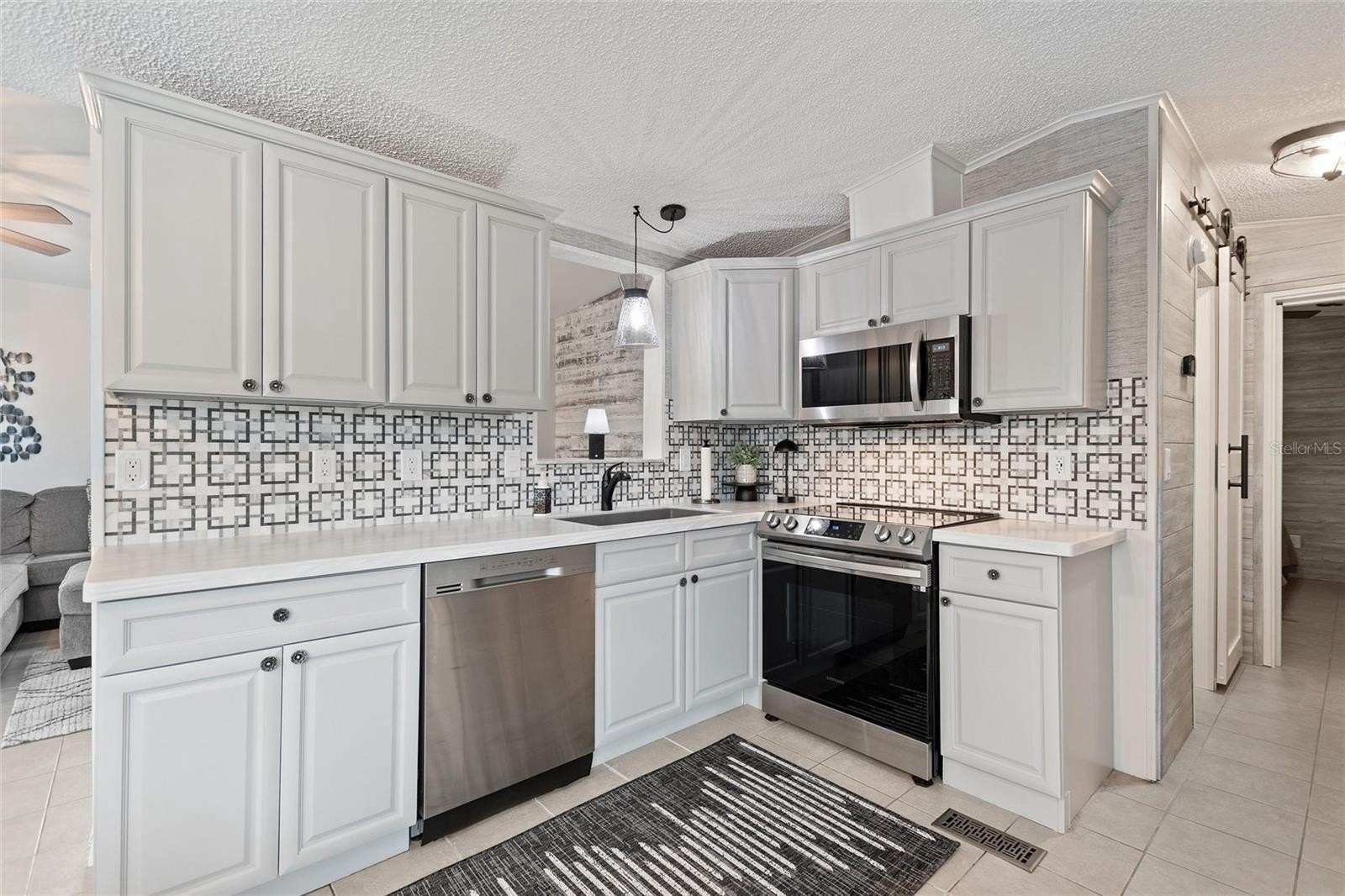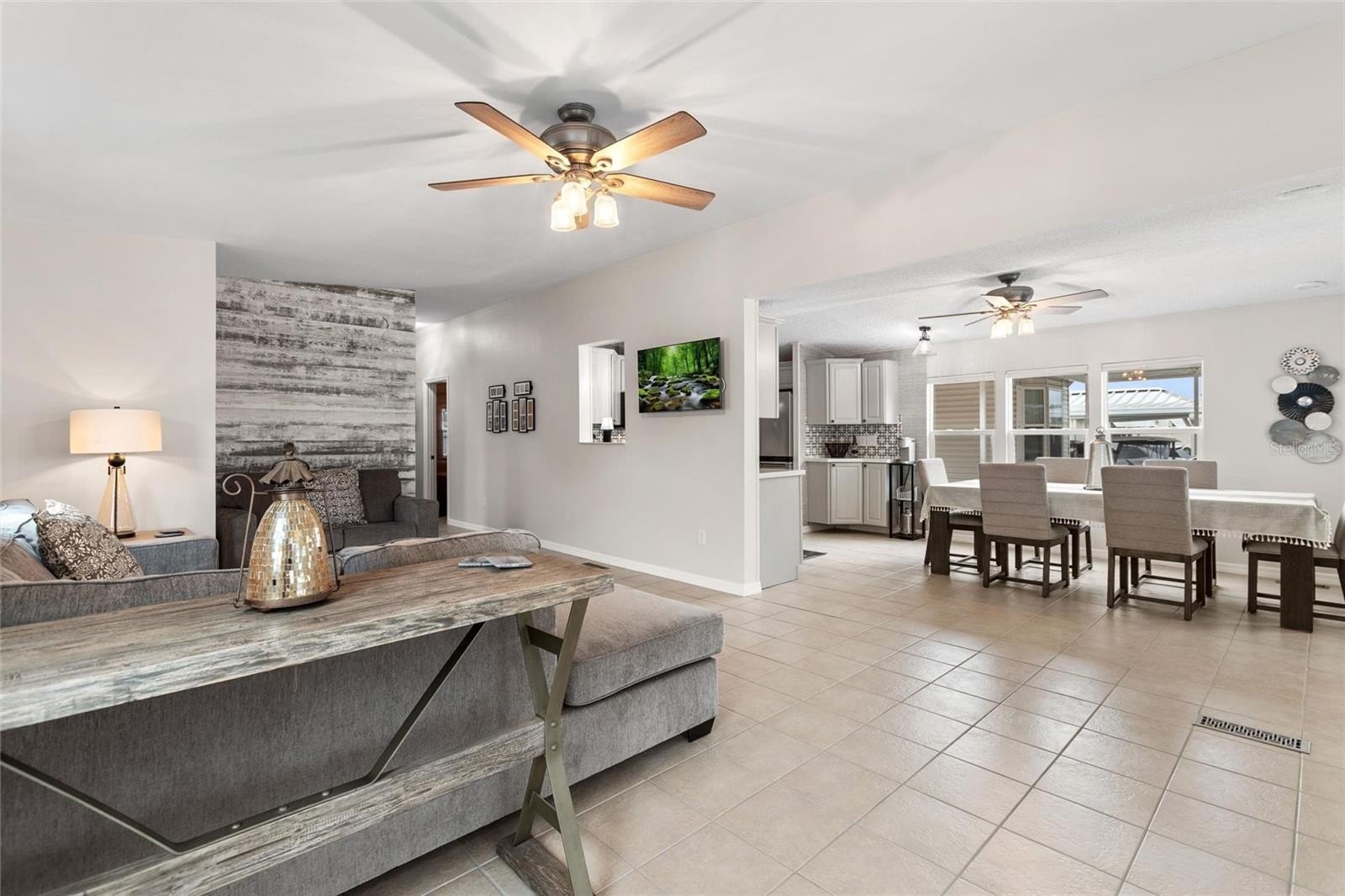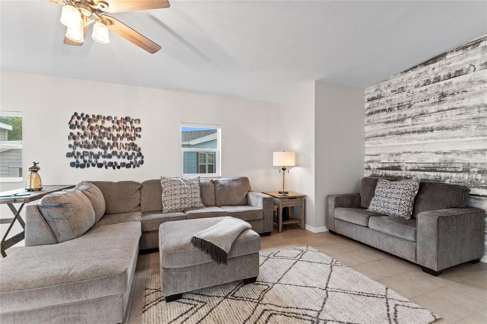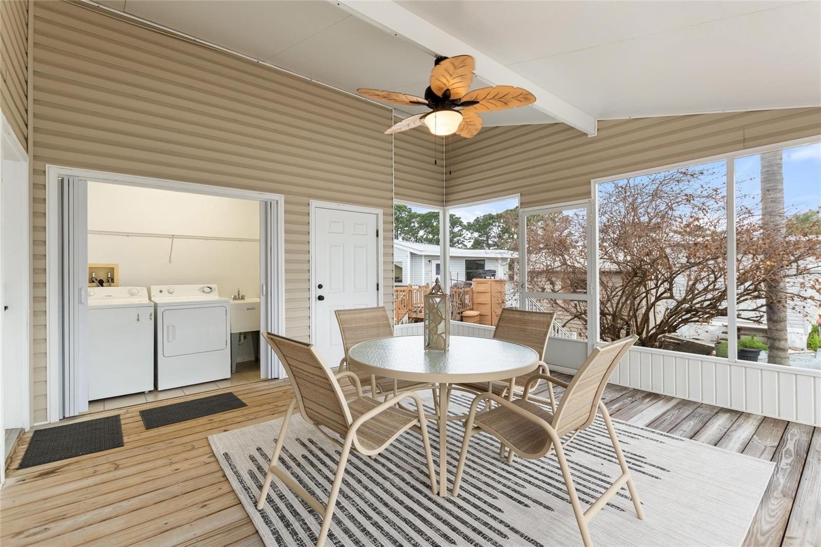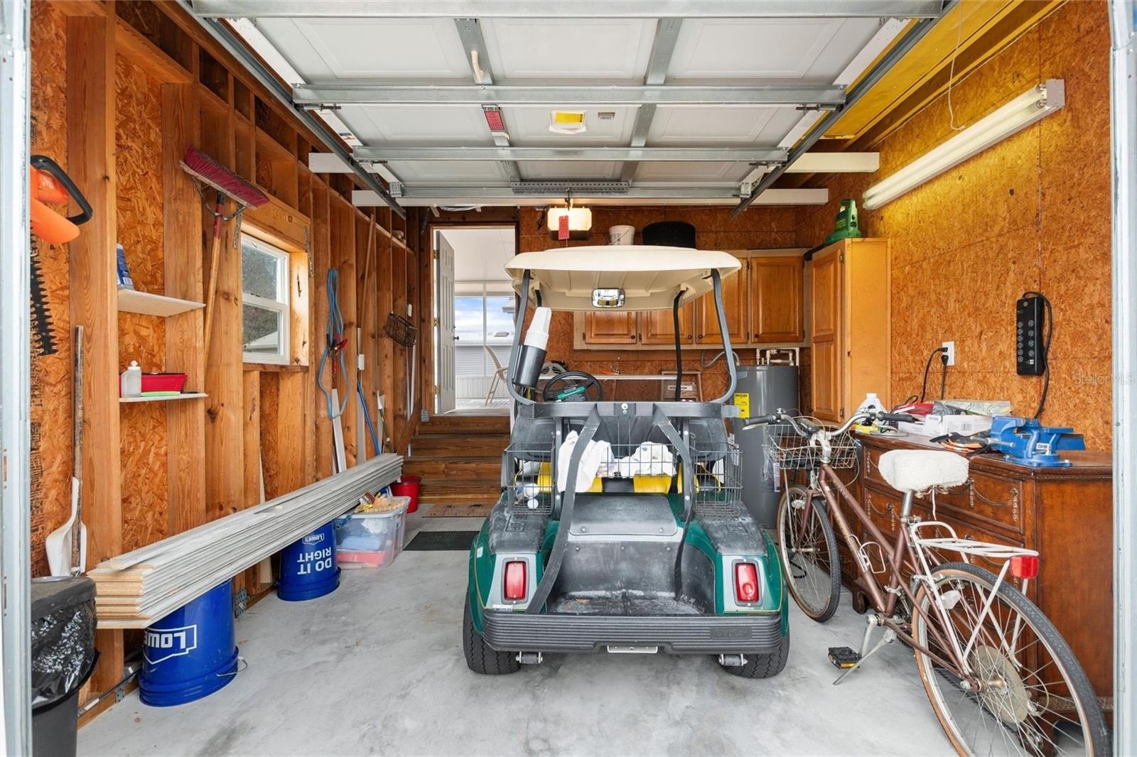 MOVE-IN Condition Furnished 2/2 Park Model on OWNED land with NEW Shingled ROOF (3/13/2026), Stainless-Steel Kitchen Appliances, Quartz Kitchen Countertops & Ceramic Tile Backsplash, Updated Bathrooms, Under-Roof Screened Lanai and a Golf Cart Garage with Opener. Fiberglass full-view leaded-glass entry door with matching side lights from 2-Vehicle Carport to an Open Living & Kitchen area with Solid Surface Floors throughout. Indoor electrical panel/circuit breakers (3/2026); 40-gallon hot water heater (2026); HVAC (12/2022) and newer mattresses; updated ceiling fans & lighting. Golf cart is NOT included but is available for sale separately. Sold As-Is. Mockingbird Ridge is a 55+ golf cart friendly community. $155 monthly Mockingbird Ridge fee includes water, sewer, trash pickup, lawn care and exclusive access to private Mockingbird Ridge community center and pool. Adjacent to executive 18-hole Deer Creek Golf & Country Club, privately owned and open to the public. Restaurants, shopping, Disney, Universal, Orlando & Central FL entertainment nearby, easy access to I-4, medical facilities, airports & Sunrail Station. Advent Health hospital is 4 miles away.