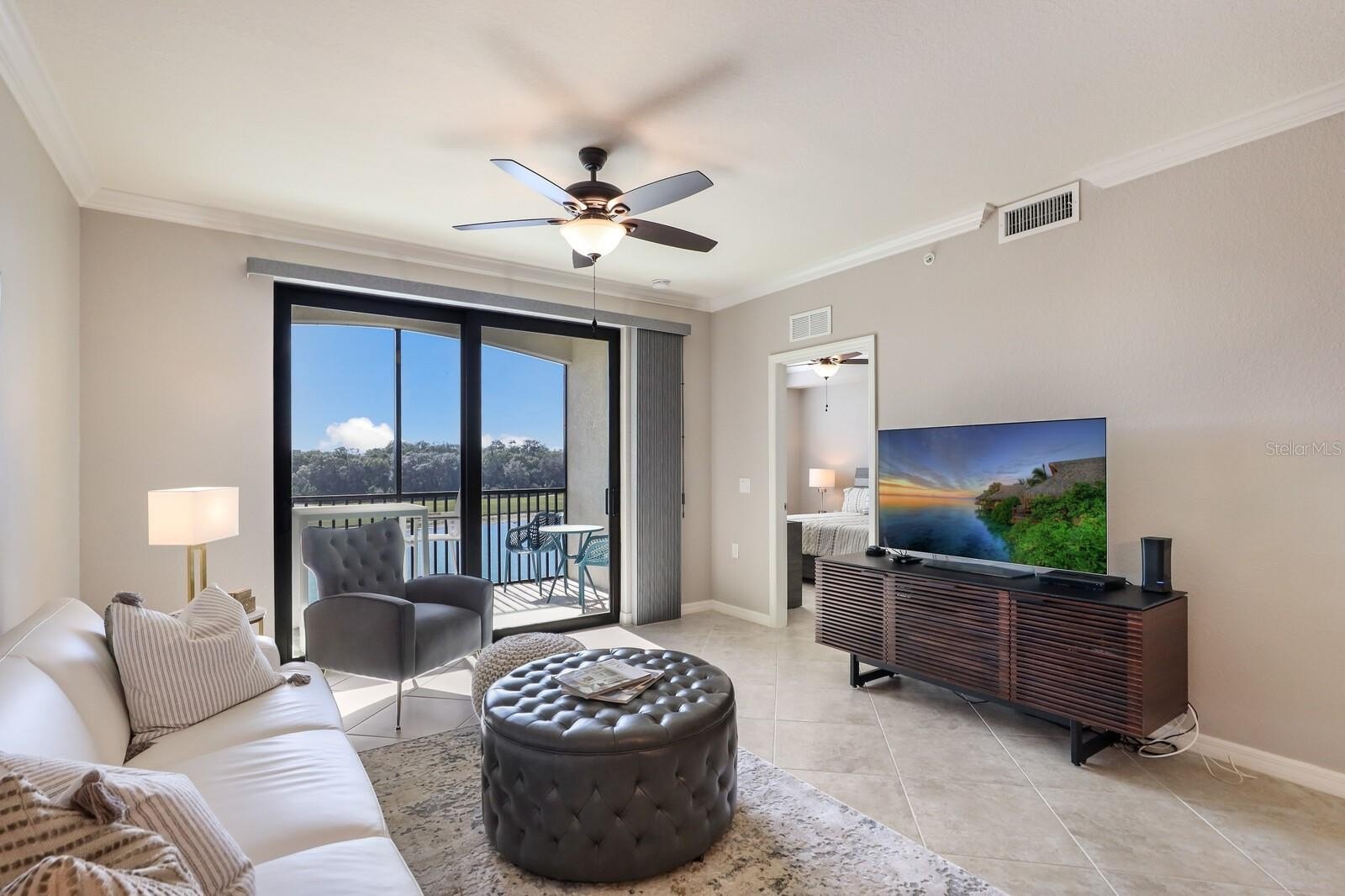 Step inside to an open-concept floor plan that shows like a model home, featuring tasteful décor and high-quality furnishings throughout. The bright and airy living room opens to a screened-in balcony, perfect for relaxing or entertaining while enjoying the peaceful scenery.