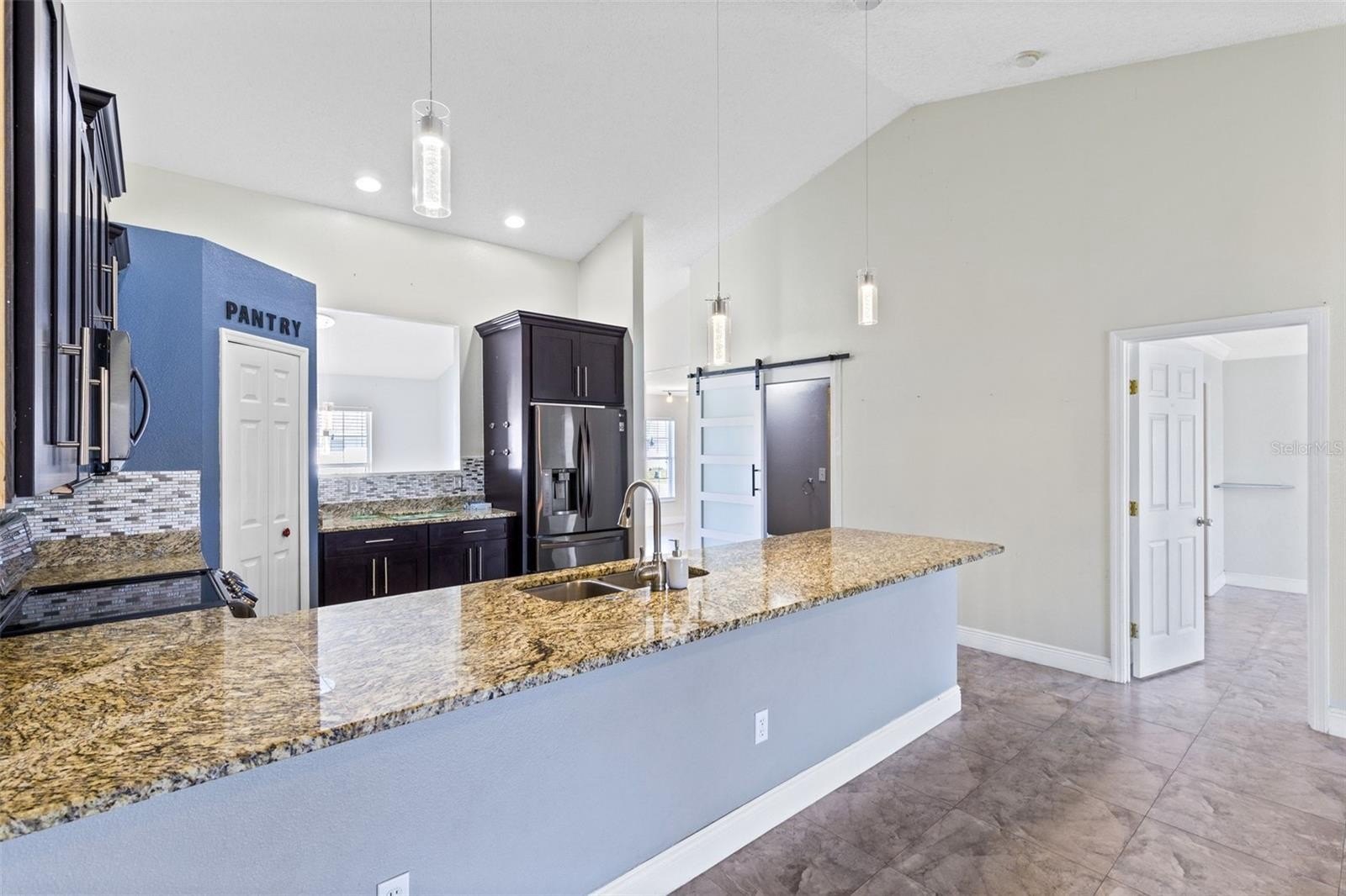 One or more photo(s) has been virtually staged. Welcome to 853 Franconville Ct, Kissimmee, FL, a charming 3-bedroom, 2-bath home with a bonus flex room located in the growing Poinciana community. This inviting home features high ceilings that create a bright and open feel, along with stylish design touches including a decorative pallet accent wall and a sliding barn door off the kitchen leading to the bathroom, adding both character and functionality. The home is also equipped with solar panels, helping improve energy efficiency and potentially lower utility costs.