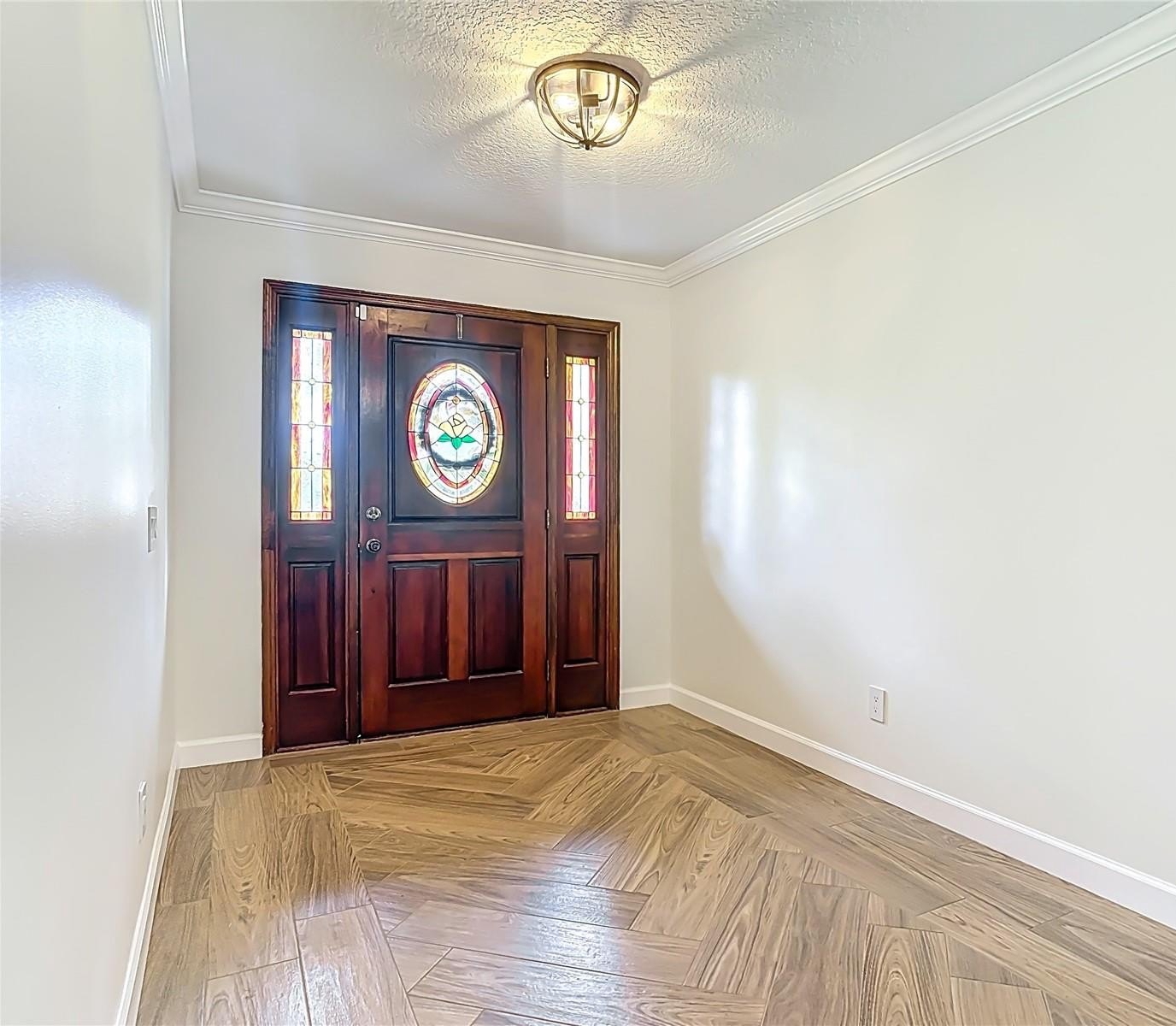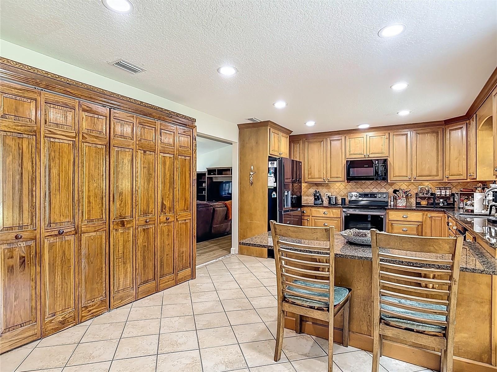 The kitchen is designed with the home chef in mind, with newer appliances and offering an abundance of rich warm toned wood cabinetry, granite countertops, a convenient breakfast bar, and an entire wall dedicated to pantry storage.