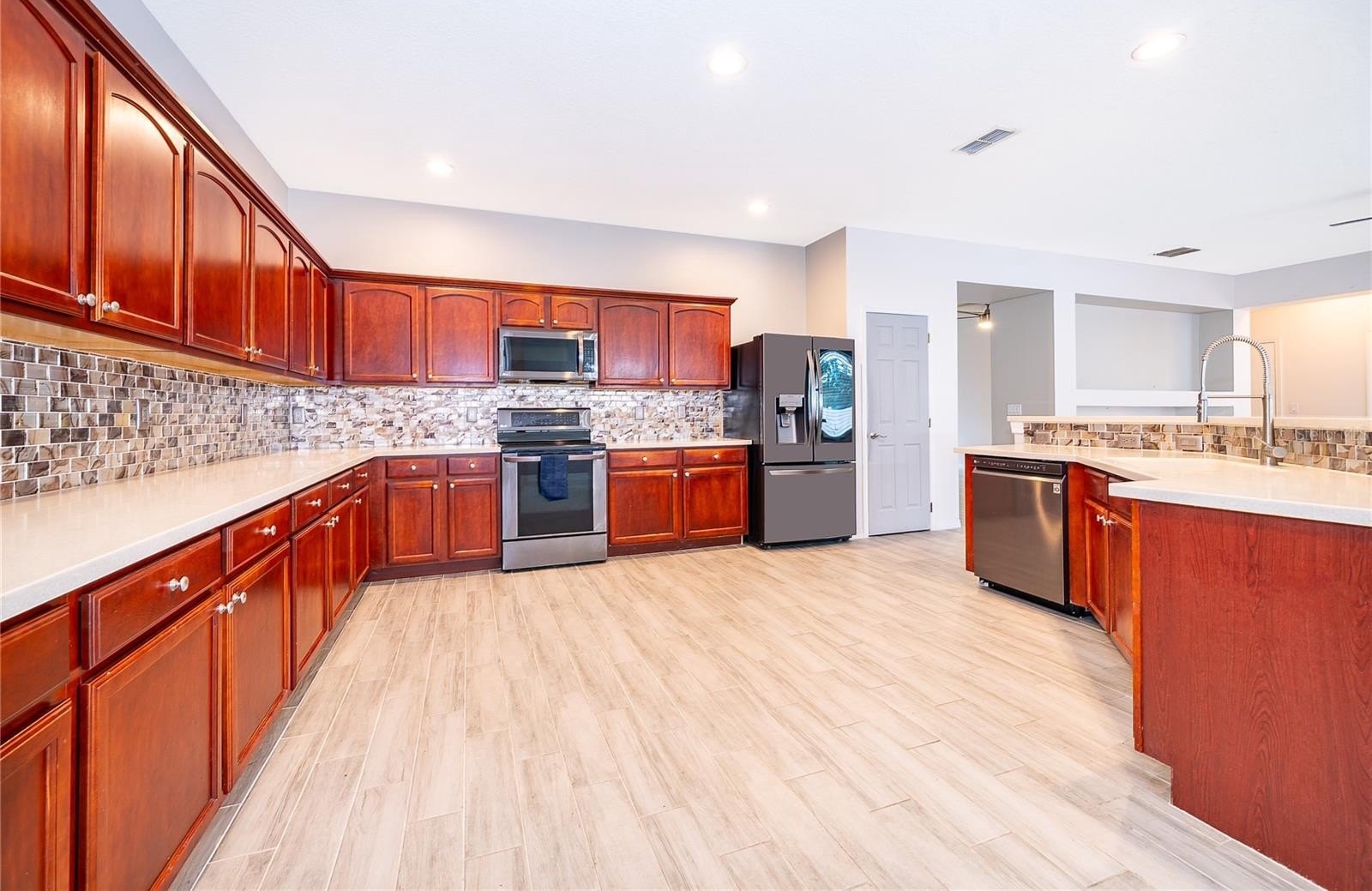 The expansive family room seamlessly connects to the kitchen, creating the ideal space for entertaining and gatherings. The kitchen is a true centerpiece, featuring stainless steel appliances, custom tile backsplash, crown molding cabinetry, an eat-in bar, and a cozy breakfast nook—perfect for casual dining and hosting guests. Enjoy Florida living at its finest in your private backyard oasis, complete with a saltwater pool, fully fenced yard, and tranquil conservation views with no rear neighbors, offering both privacy and serenity year-round. Additional highlights include: Rear-entry 2-car garage, Spacious lot with great outdoor potential, Central A/C and energy-efficient systems, Low HOA that included Cable and Internet . Located in the heart of Avalon Park, residents enjoy access to a vibrant town center with shops, dining, parks, and community events.