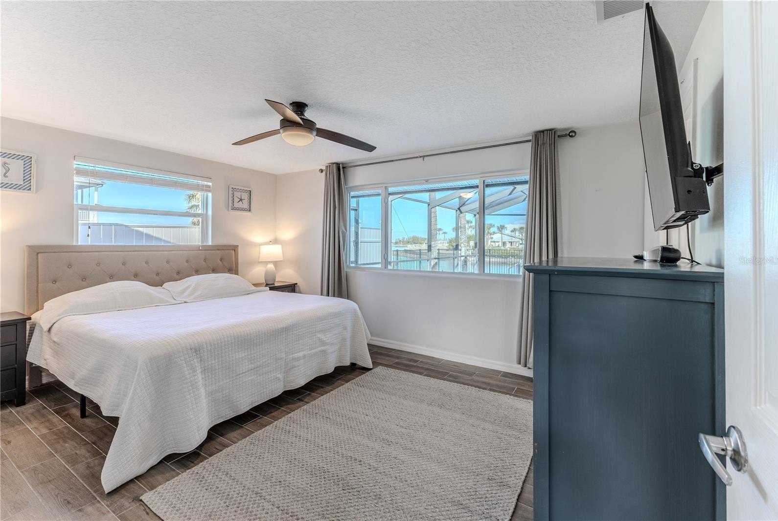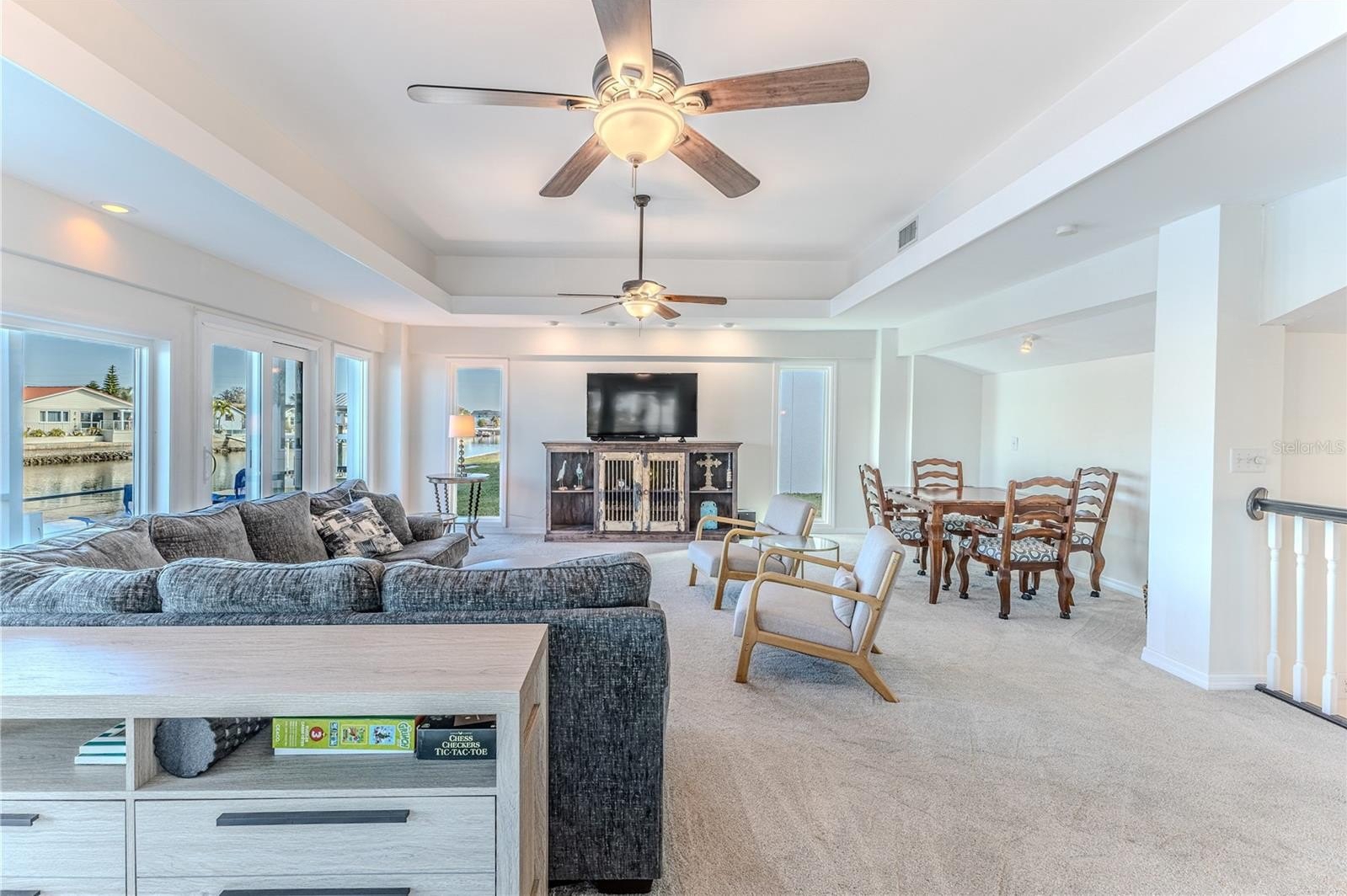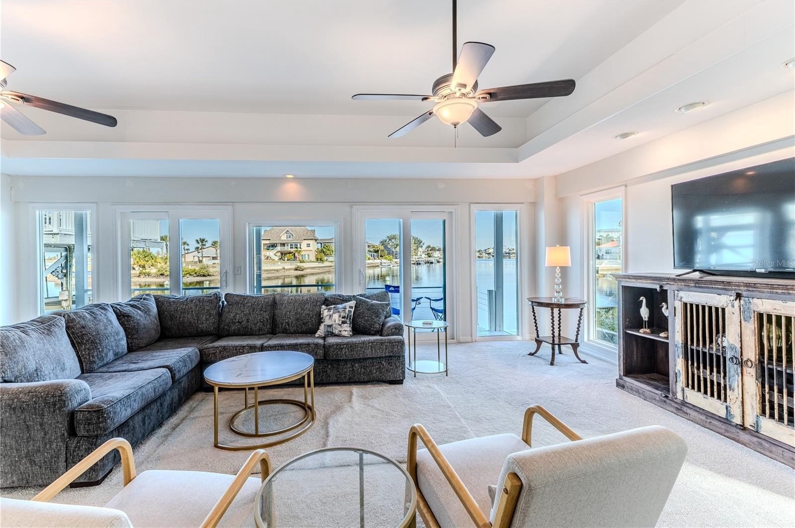 The expansive living room showcases a tray ceiling, plush carpet, ceiling fans, and sliding glass doors opening to a deck with sweeping water views—views you'll enjoy from nearly every room in the home.
