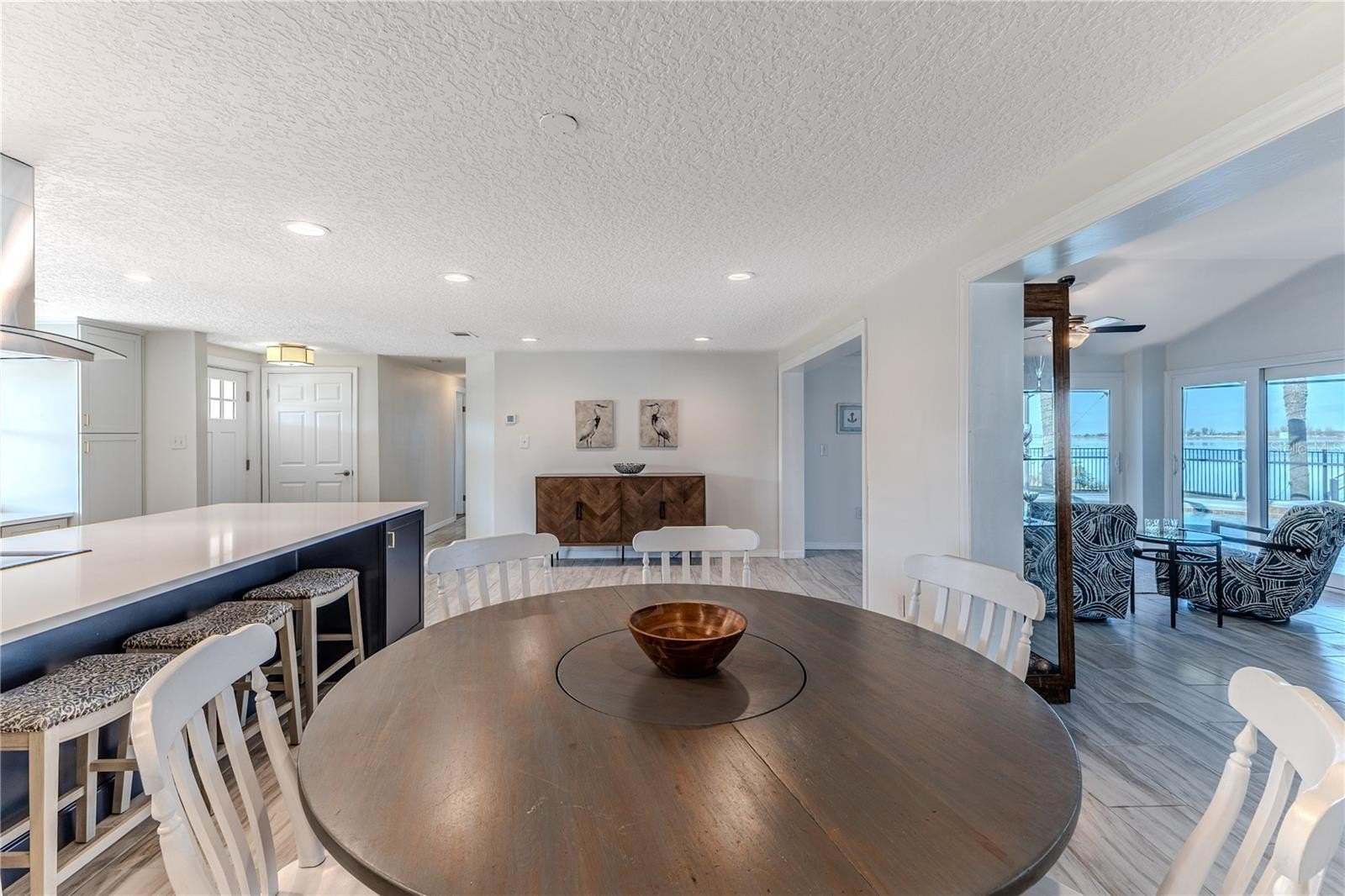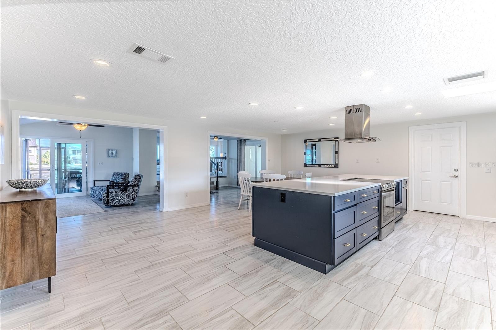 With three-bedrooms, two-bathrooms the home features new hurricane-impact windows throughout and elegant tile flooring in most rooms. The gourmet kitchen is a dream with wood cabinetry, soft-close drawers, pantry, large center island, quartz countertops, stainless steel appliances, range hood, gourmet range, recessed LED lighting, and a skylight for added natural light.