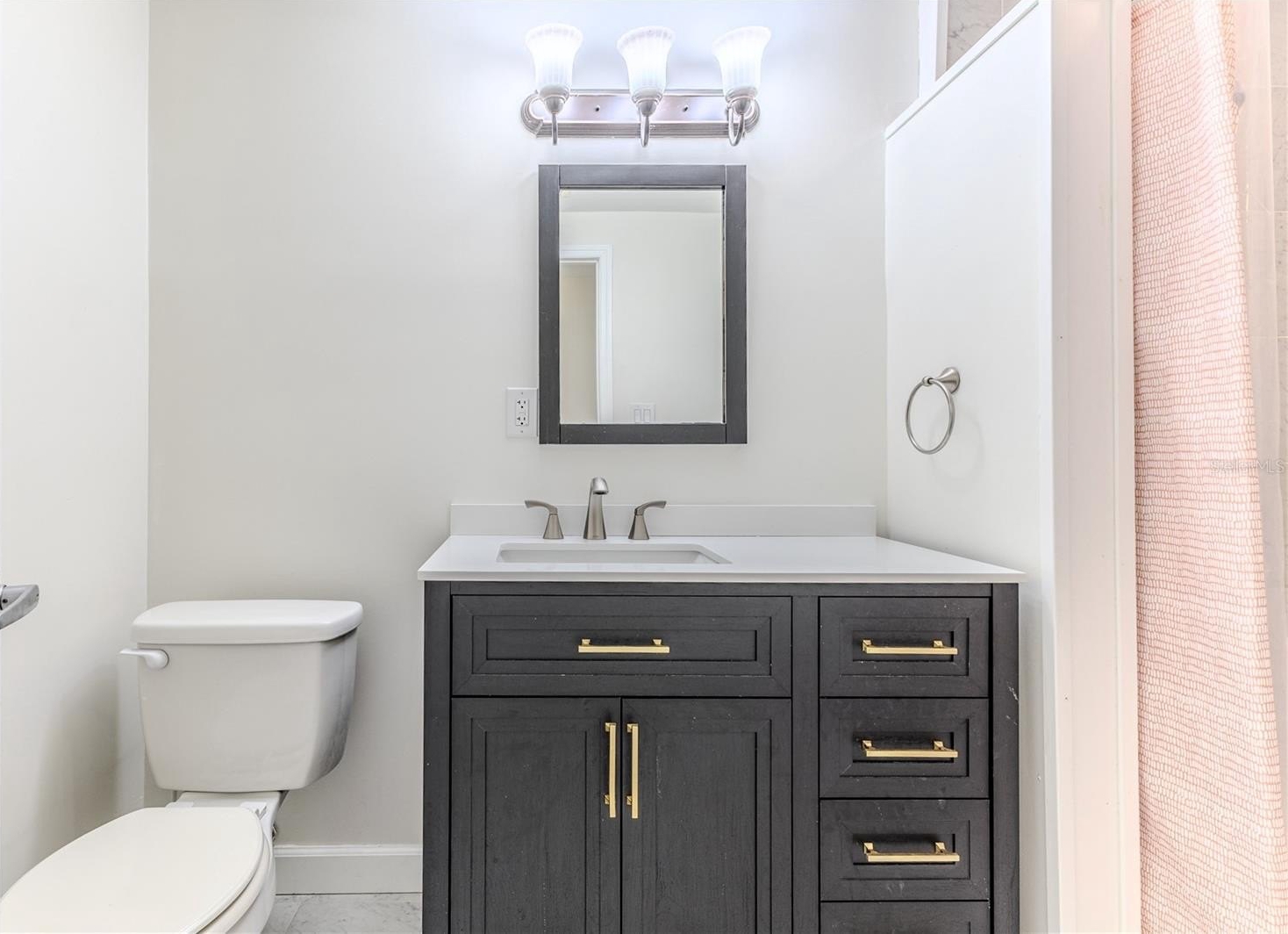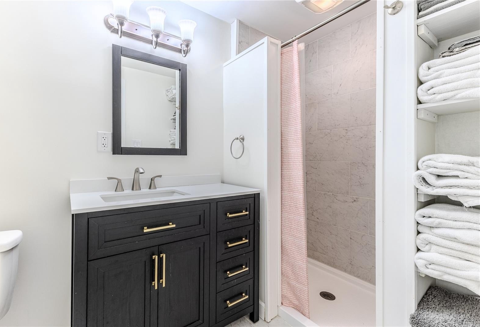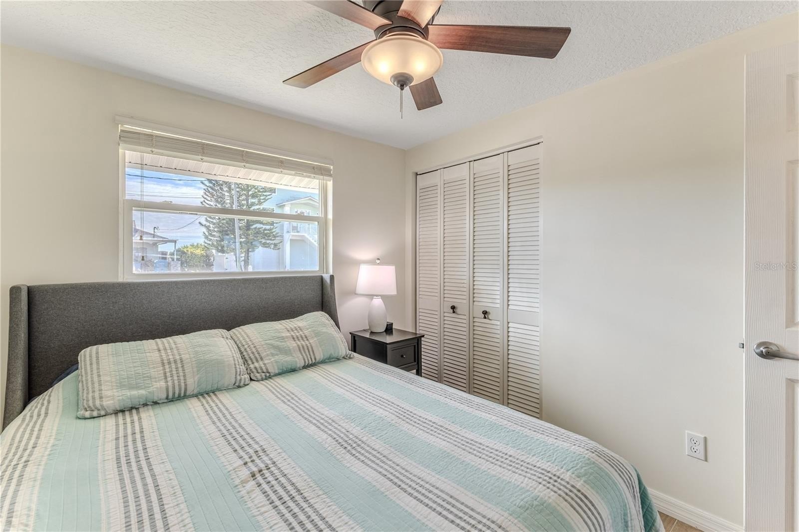 The spacious primary suite offers a large picture window overlooking the pool and spa, a dual-sink vanity, and a beautifully tiled walk-in shower. Two additional bedrooms include ceiling fans and closets. The hall bathroom has a new vanity and shower.