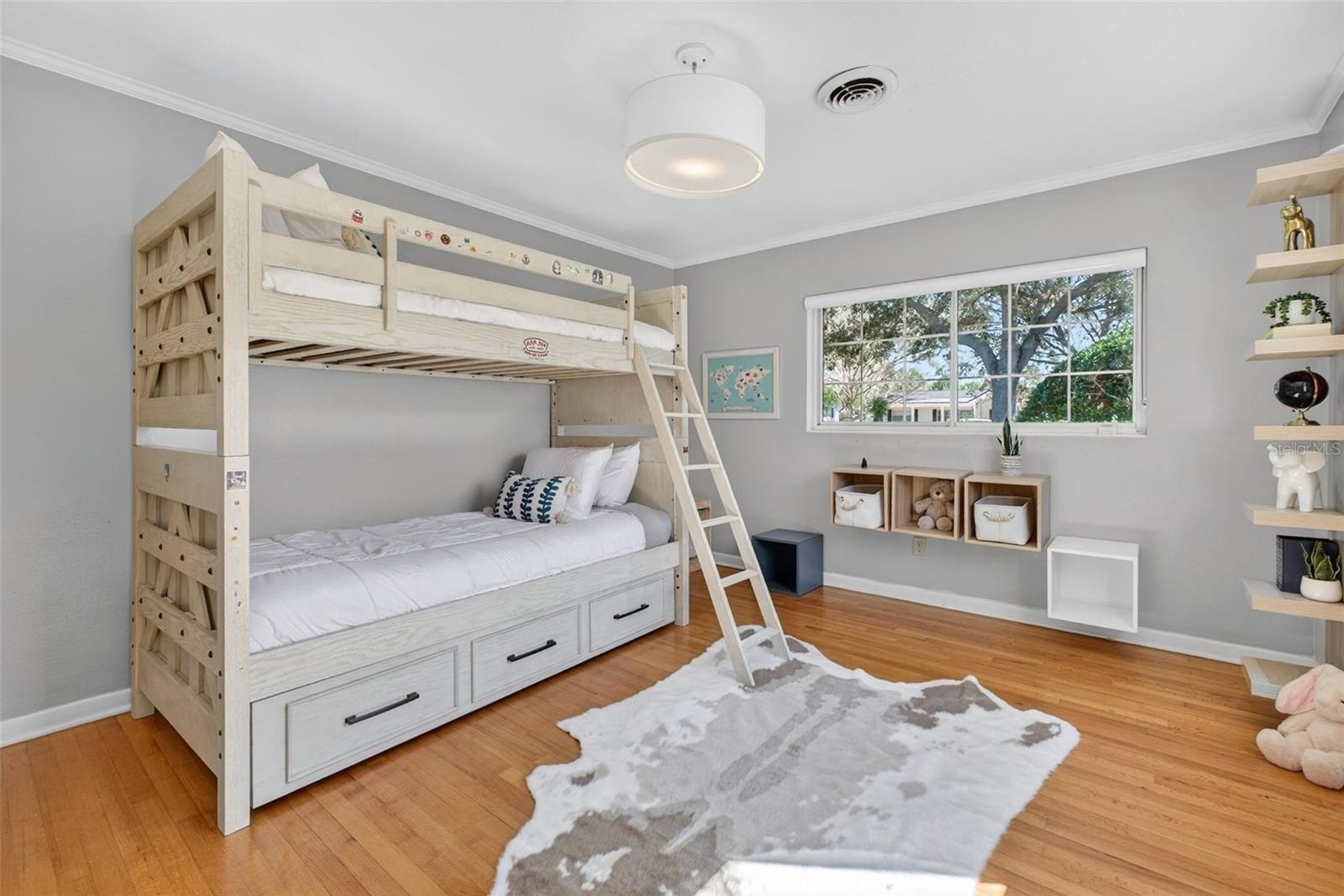 The bedrooms are thoughtfully positioned to provide privacy and flexibility for family, guests, or a home office, with bathrooms conveniently located nearby.