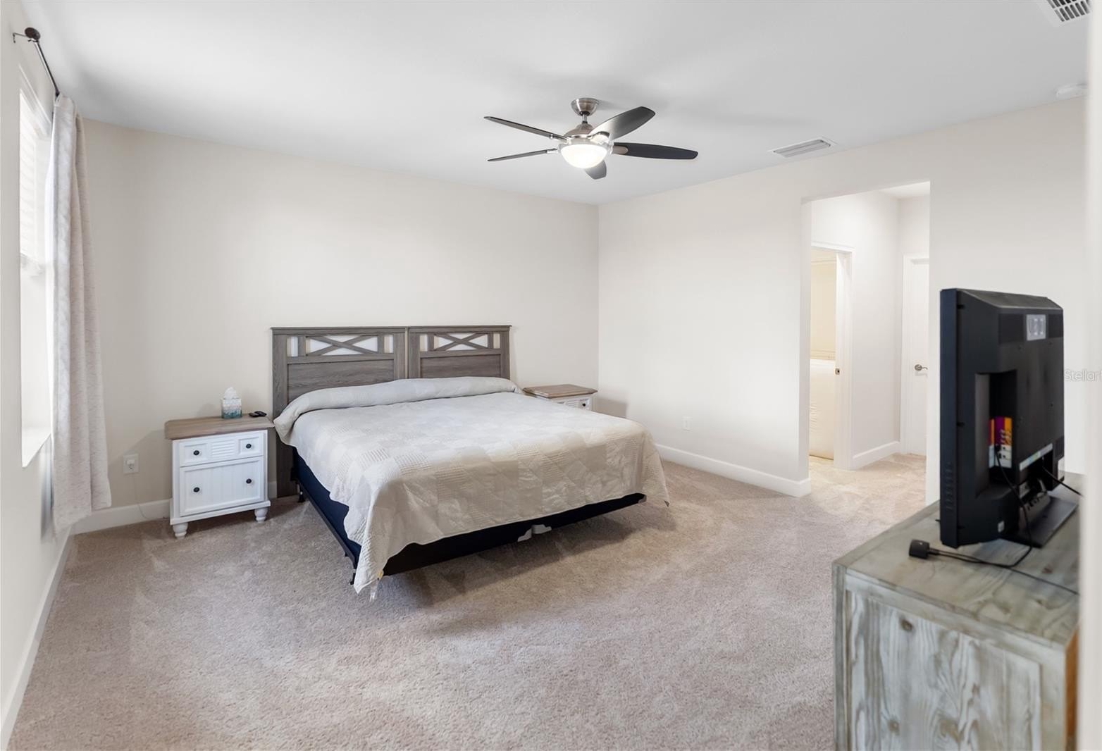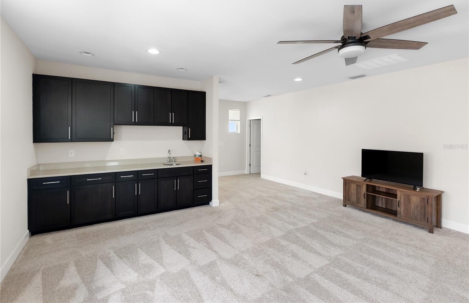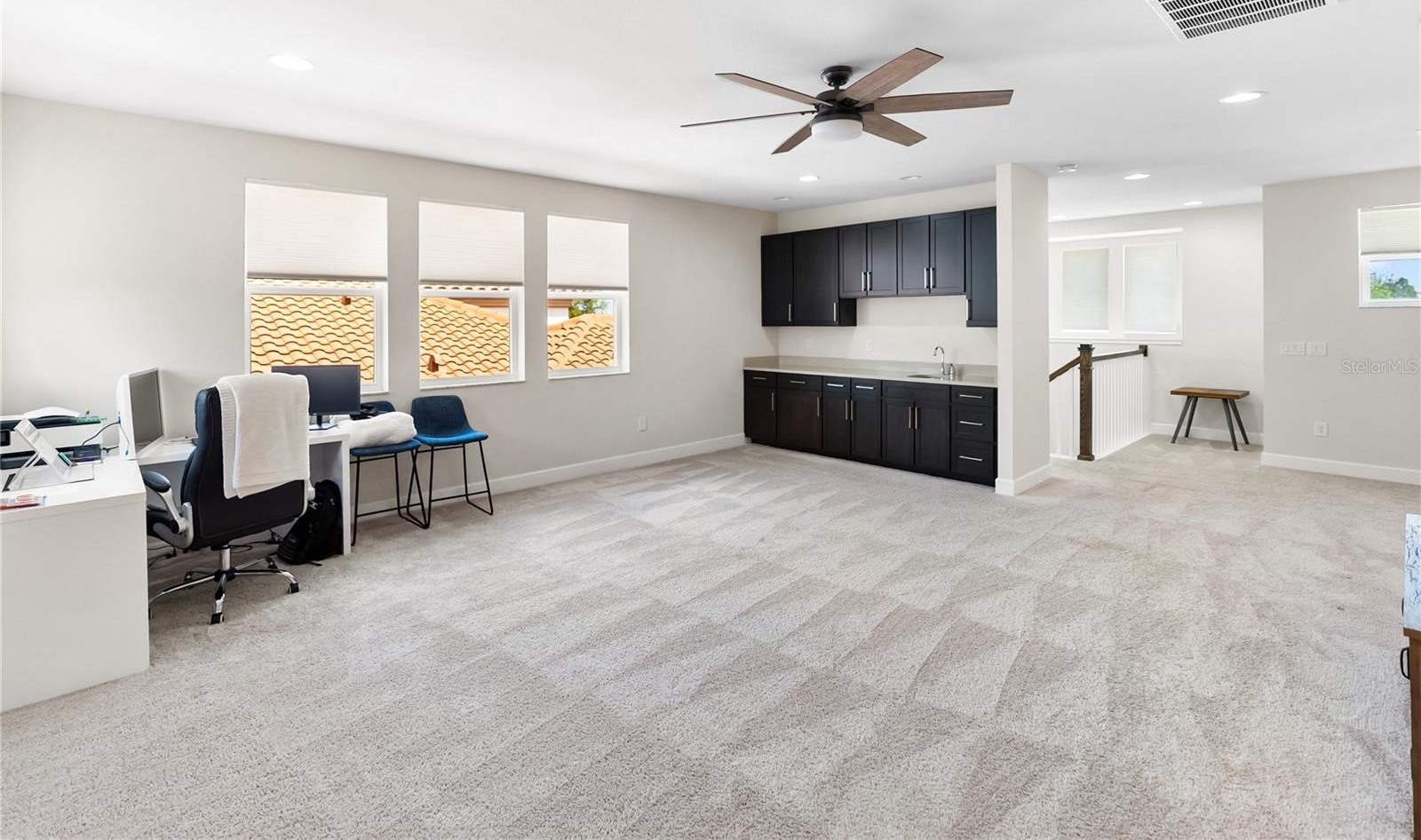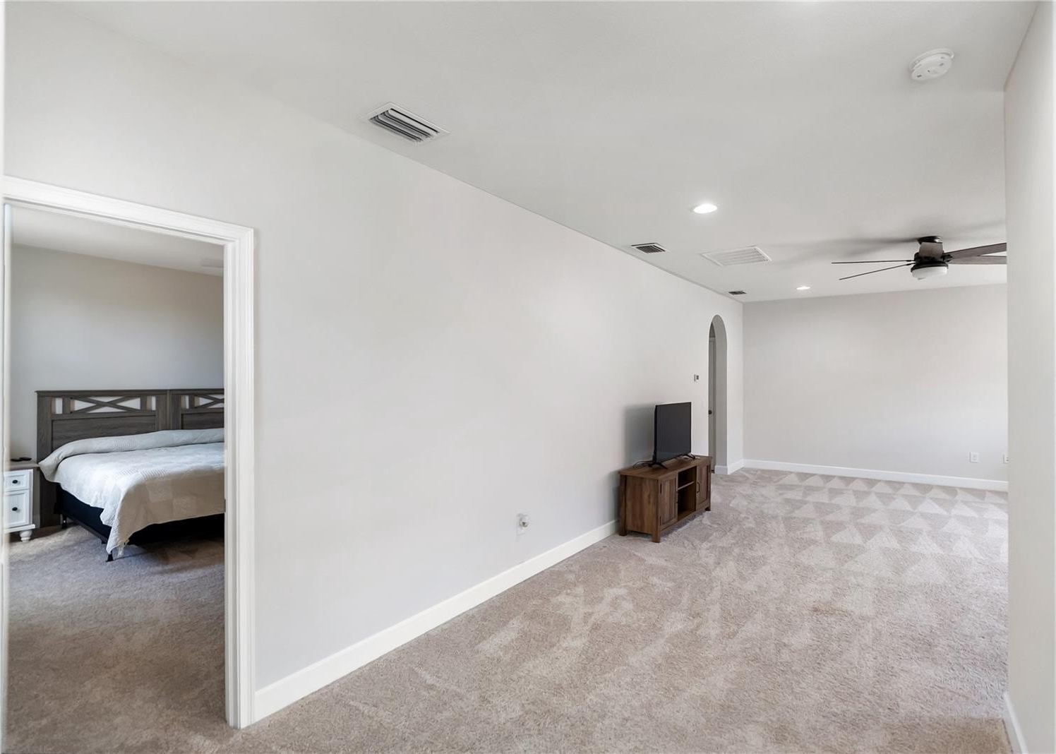 The master suite serves as a private retreat, boasting a spa-like bathroom with a walk-in shower and dual vanities. Convenience is key with an additional bedroom on the first floor, while the second level features a large loft area complete with a wet bar—perfect for a media room or hobby space. The oversized upstairs bedroom includes a large closet and full bath, providing plenty of room for guests or family.