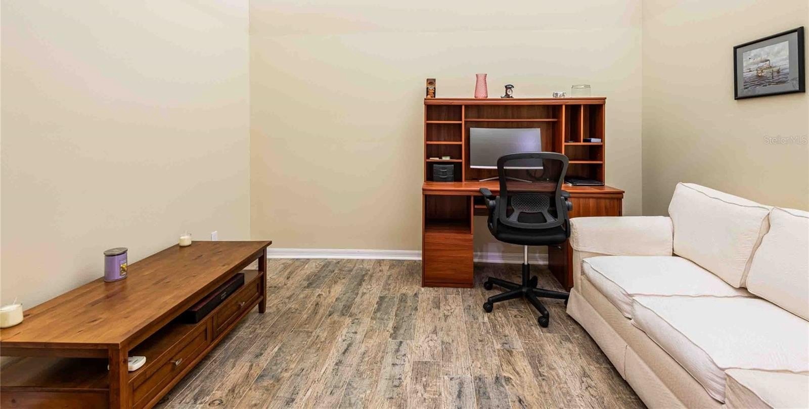 The kitchen features solid wood cabinetry, solid surface countertops, and ample space for cooking and entertaining. High ceilings and an open floor plan create a bright, airy atmosphere throughout the home. Enjoy relaxing on the screened lanai overlooking peaceful community greenspace.