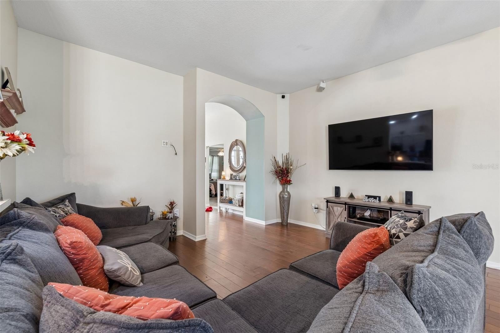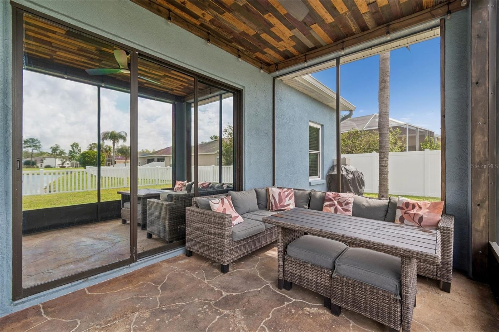 The living/dining room combo provides for a smooth transition into the kitchen. Living room includes surround sound speakers, and triple sliding glass doors leading to the screen covered lanai.