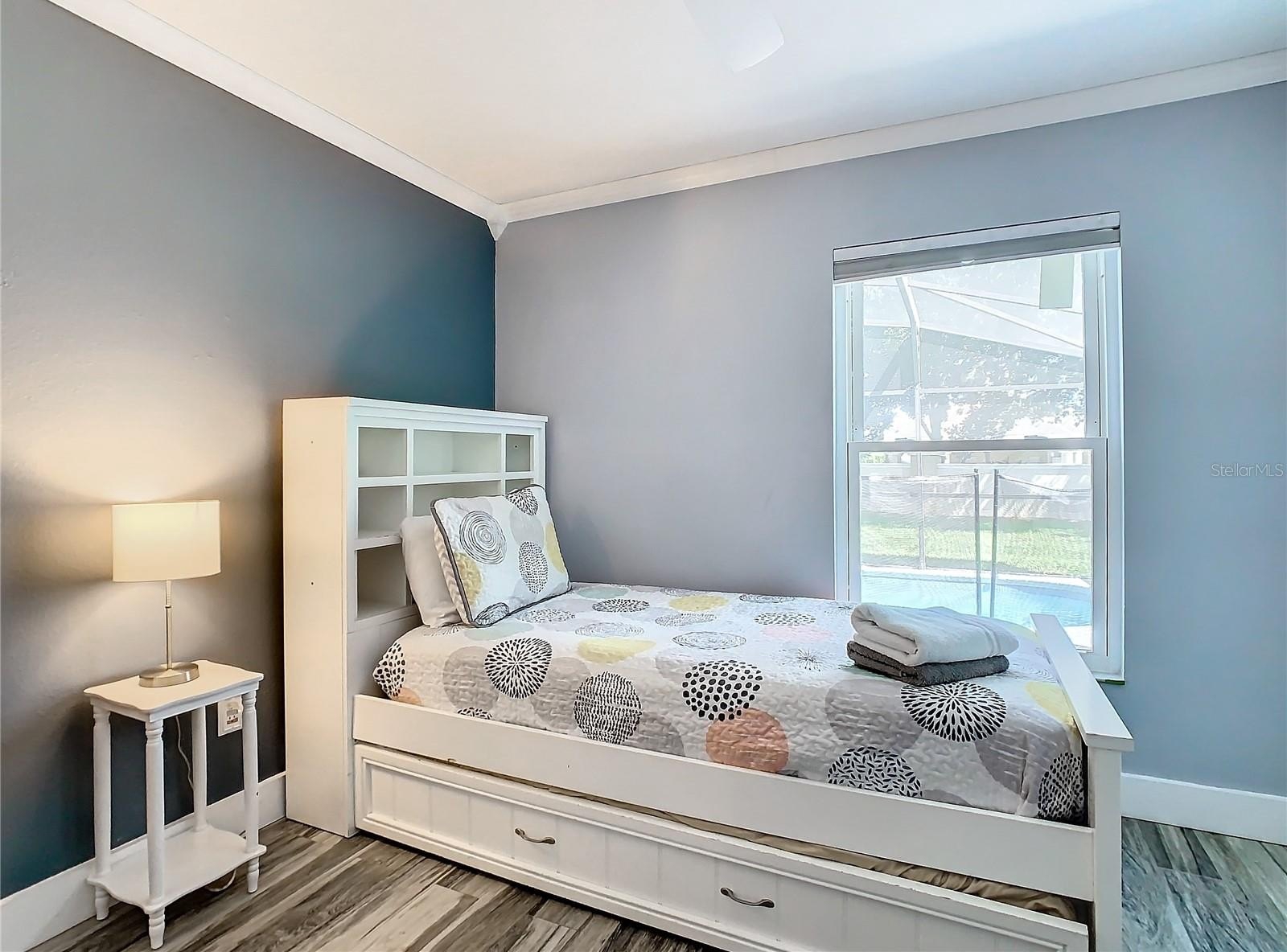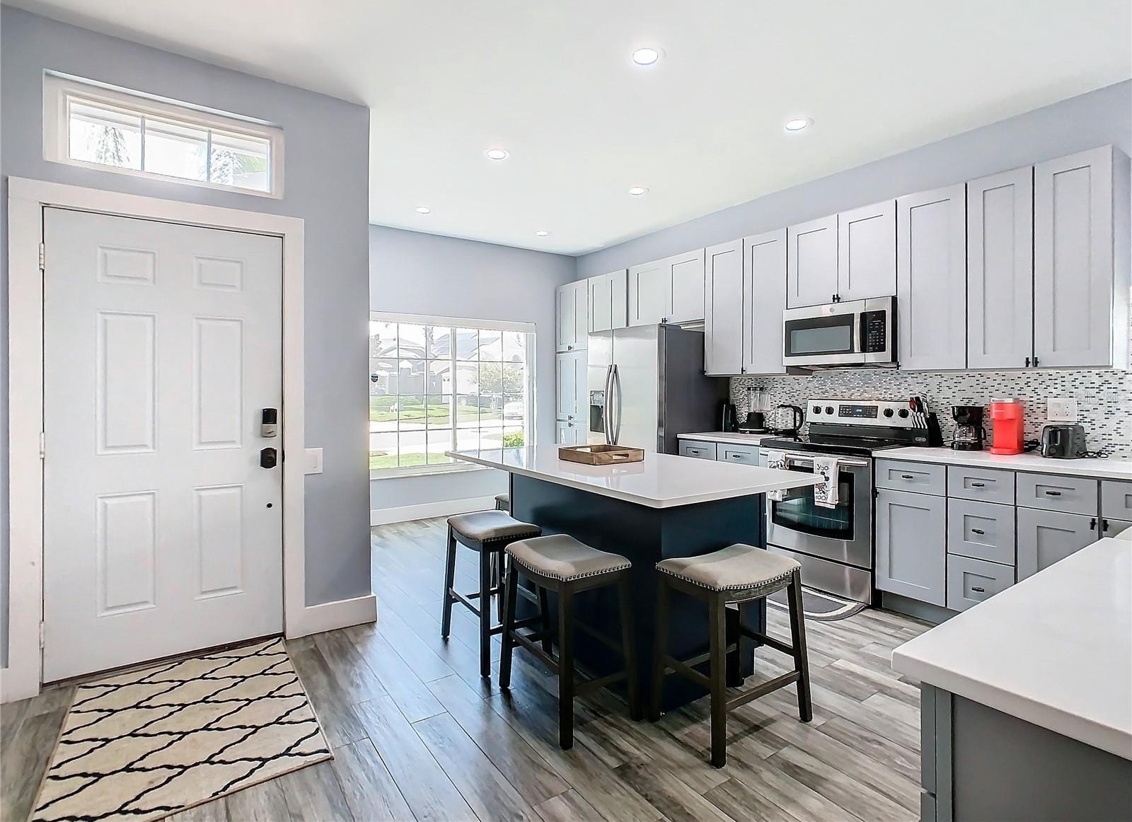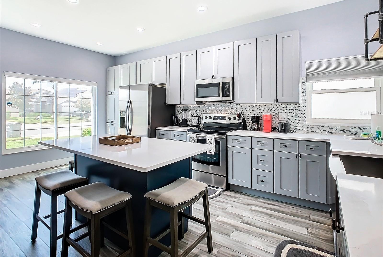 Welcome to the Guard gated Windsor Palms Resort style Community to escape to paradise. This FULLY REMODELED home with neutral color, TOTALLY FURNISHED with 4 Bedrooms, 2 baths, 2 car garage, sparkling pool, beautiful Oceanic Oak Long-board ceramic tile throughout the floor, is a beautiful and serene place to live with your family and/or to make an investment, such as Short-Term Vacation Rentals. The property is situated in an area known for its excellent schools in a perfect environment. Located just few minutes away from Walt Disney World and prime shopping destinations, and few miles away from all other Orlando's top major attractions, this home offers an ideal retreat for personal convenience, relaxation, and entertainment. No rear neighbors. This house has been fully upgraded with the following: Re-imagined and re-designed kitchen with brand new cabinets, center island and Quartz counter-top, remodeled bathrooms with new deep soaking tub in the master and converted walk-in shower in the guest bathroom, new energy efficient, double pane, double hung windows throughout the entire home installed in 2018, new doors on all bedrooms and bathrooms, new AC units installed in 2021, new hot water heater (2018), roof replaced in 2017, pool resurfaced and upgraded tile and color change LED light in 2020, new pool heater, pump, motor, and filter housing in 2022. The kitchen is equipped with stainless steel appliances. The Dining space is an open concept with the living room for family gathering. The split floor-plan allows everyone to have their own privacy, peace, and comfort. The Windsor Palm community Resort clubhouse hosts many amenities including: arcade, gorgeous large pool, splash pad, water slide, tennis court, volley ball, basketball, fitness center, Movie Theater, Tiki Bar, Gift shop and so much more! Not only that but the HOA takes care of your irrigation system, daily trash removal, landscaping, basic cable and internet service. Take advantage of the vibrant Windsor Palm Community, close to a variety of businesses, restaurants, shopping options, and numerous specialty events throughout the year. Don't miss this opportunity to own a beautifully maintained house. Schedule a showing today!